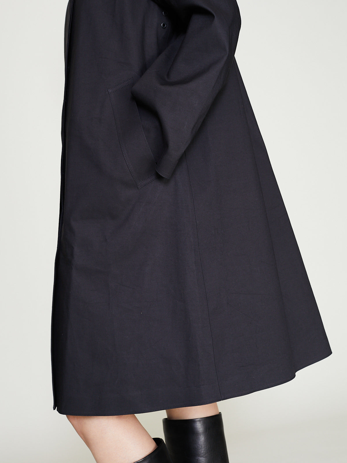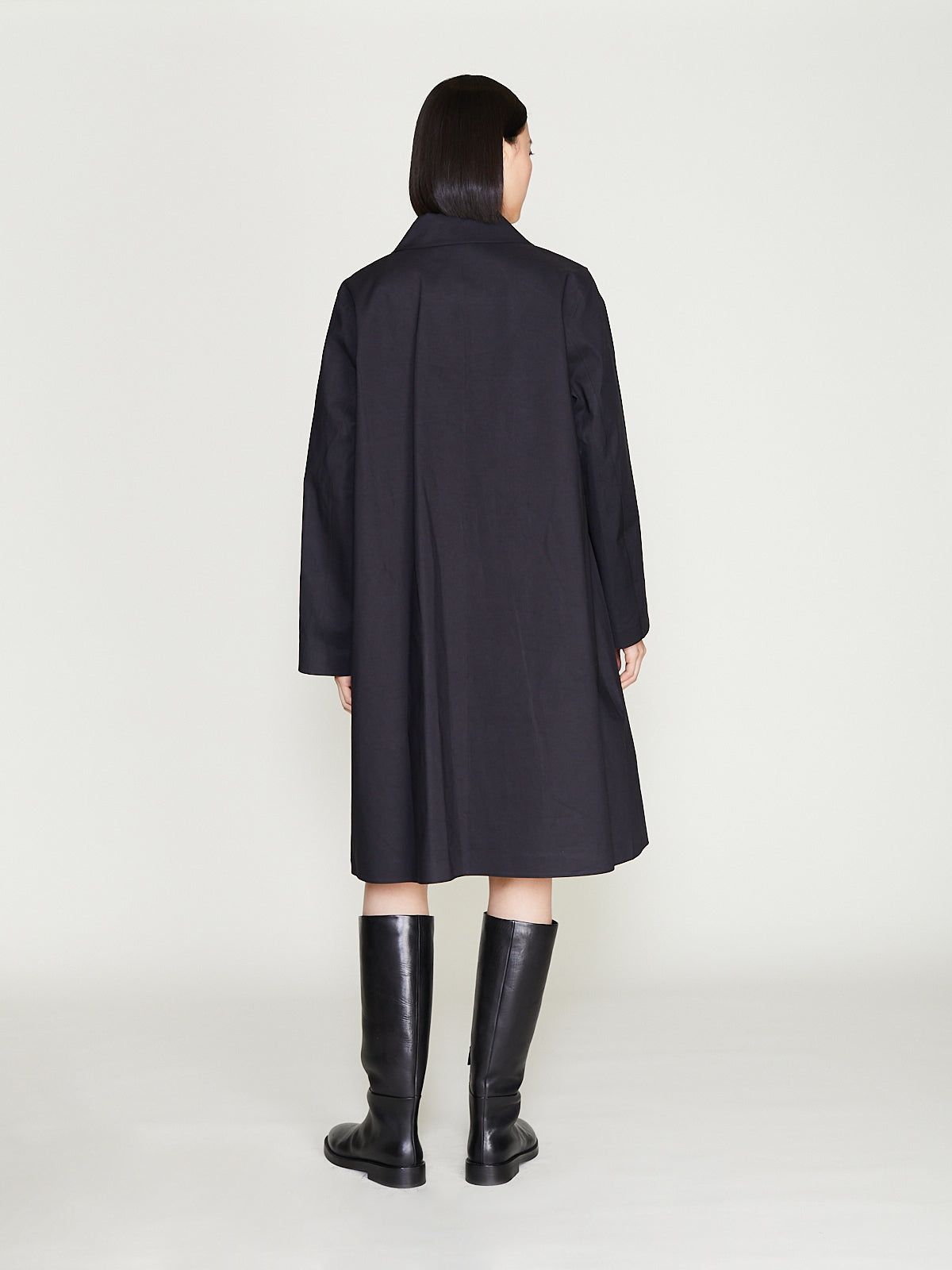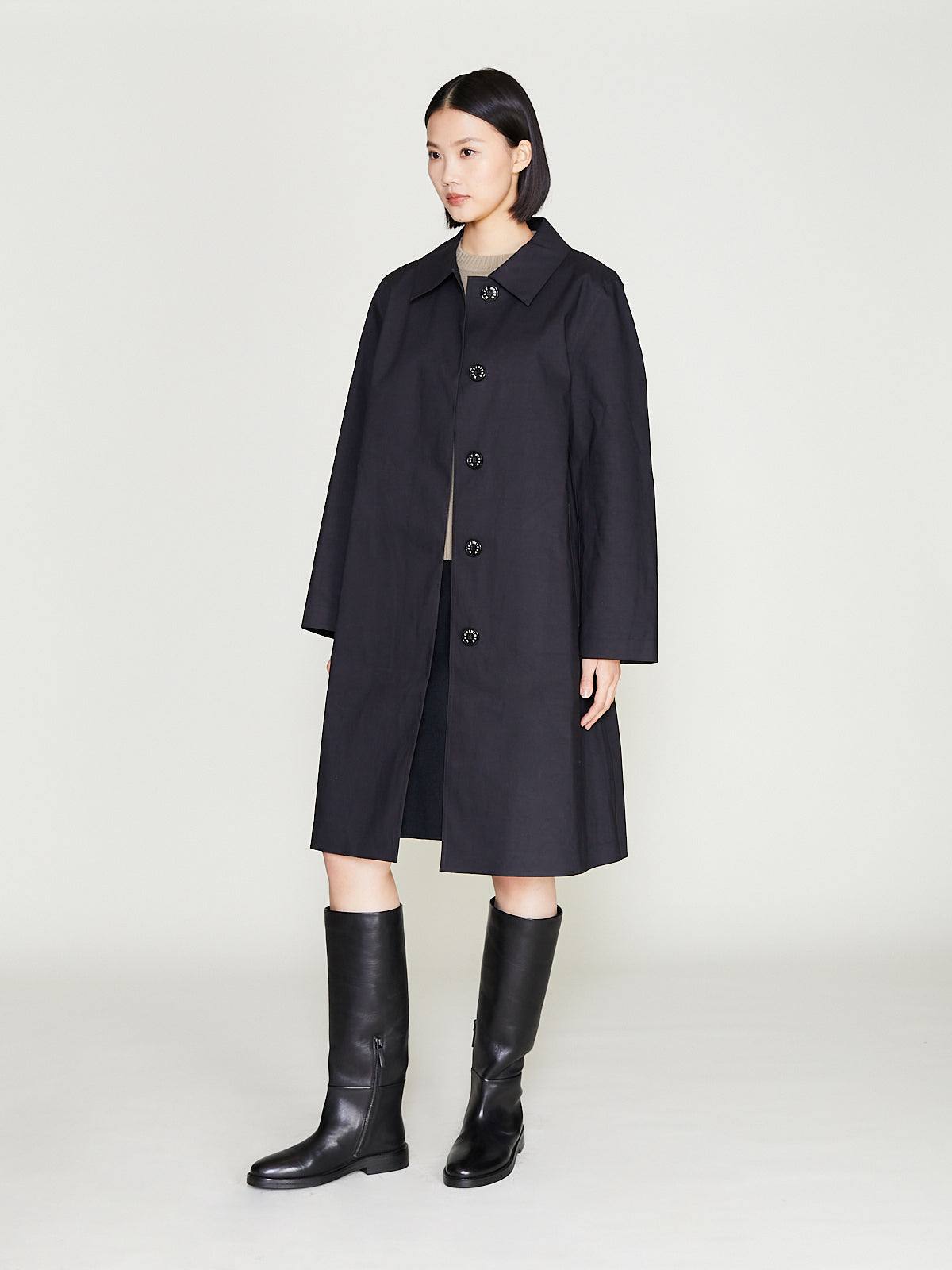 A-line coat in a brown water-repellent and windproof bonded cotton. Classic collar, concealed 5-button fly-front closure, long sleeves with underarm eyelets for breathability. Welted slash pockets on the front. Features an internal tab for interchangeable liner and an internal phone pocket. Fully taped seams. Mid-thigh length. Sleek silhouette. Unlined.
