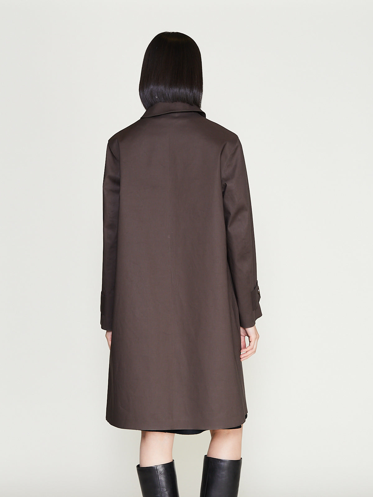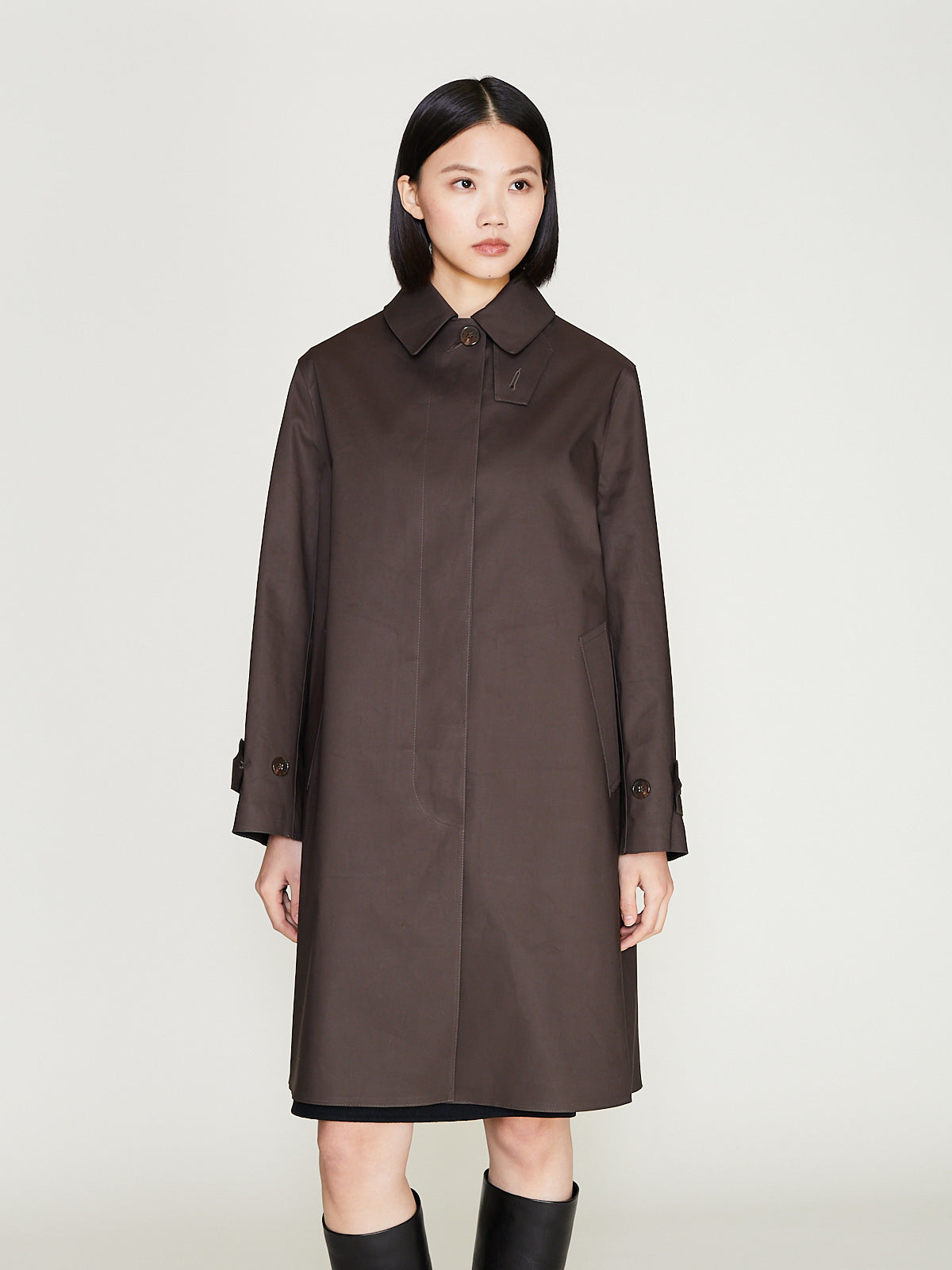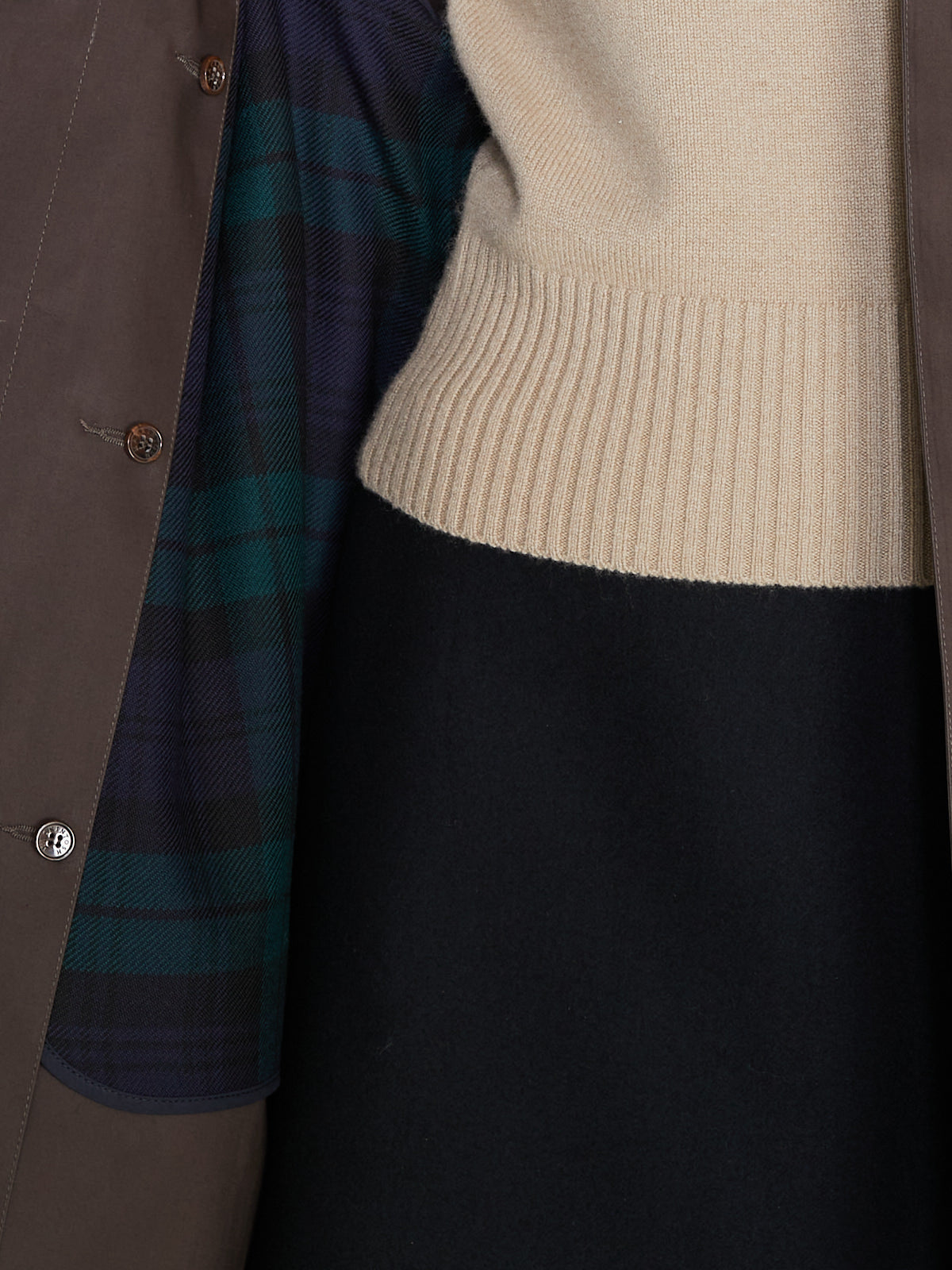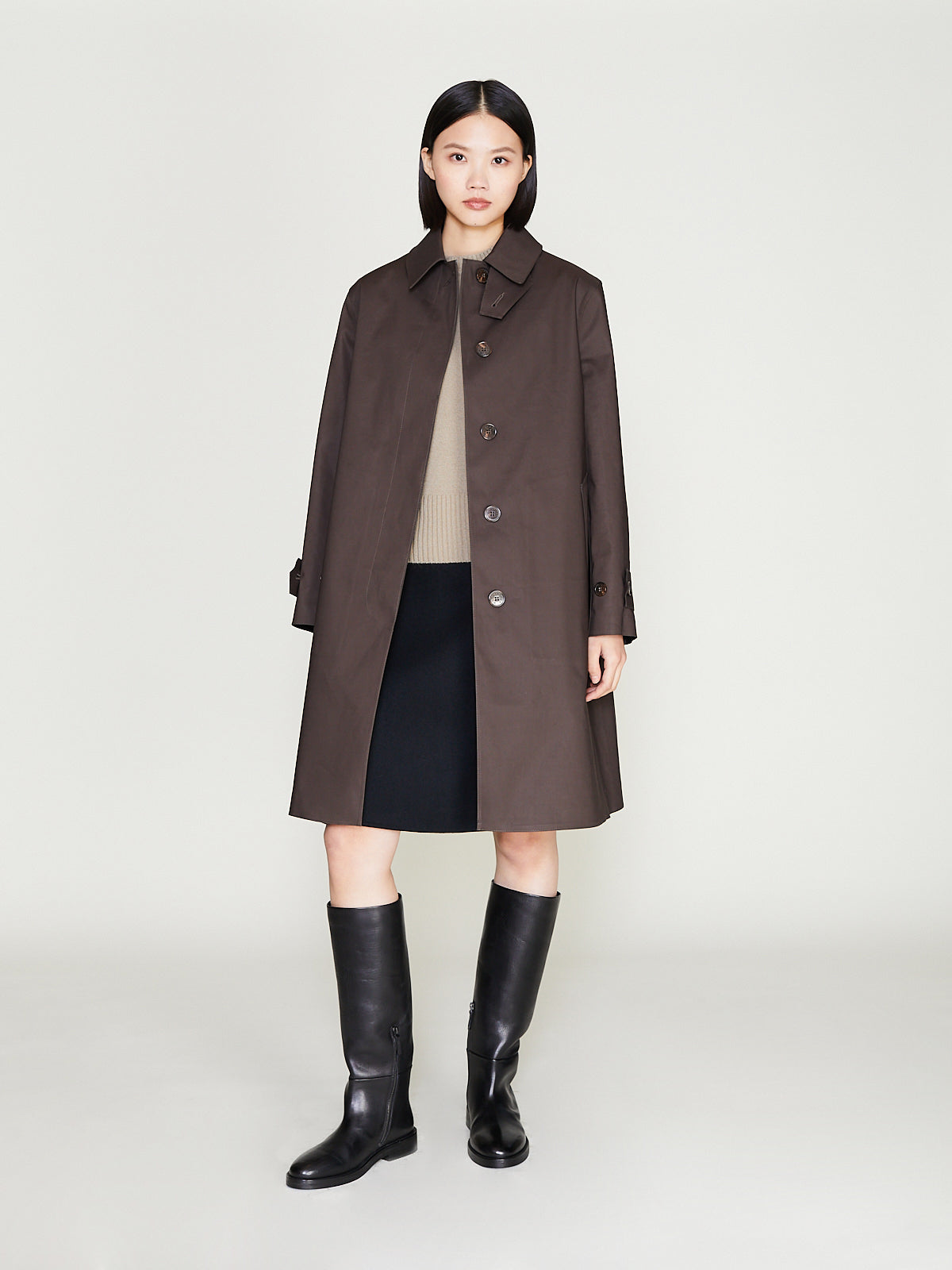 A-line coat in a brown water-repellent and windproof bonded cotton. Classic collar with a removable neck latch, concealed 5-button fly-front closure and long sleeves with belted cuffs and underarm eyelets for breathability. Welted slash pockets on the front. Features an internal tab for interchangeable liner and an internal phone pocket. Fully taped seams. Mid-thigh length. Sleek silhouette. Comes with a checked detachable wool lining.