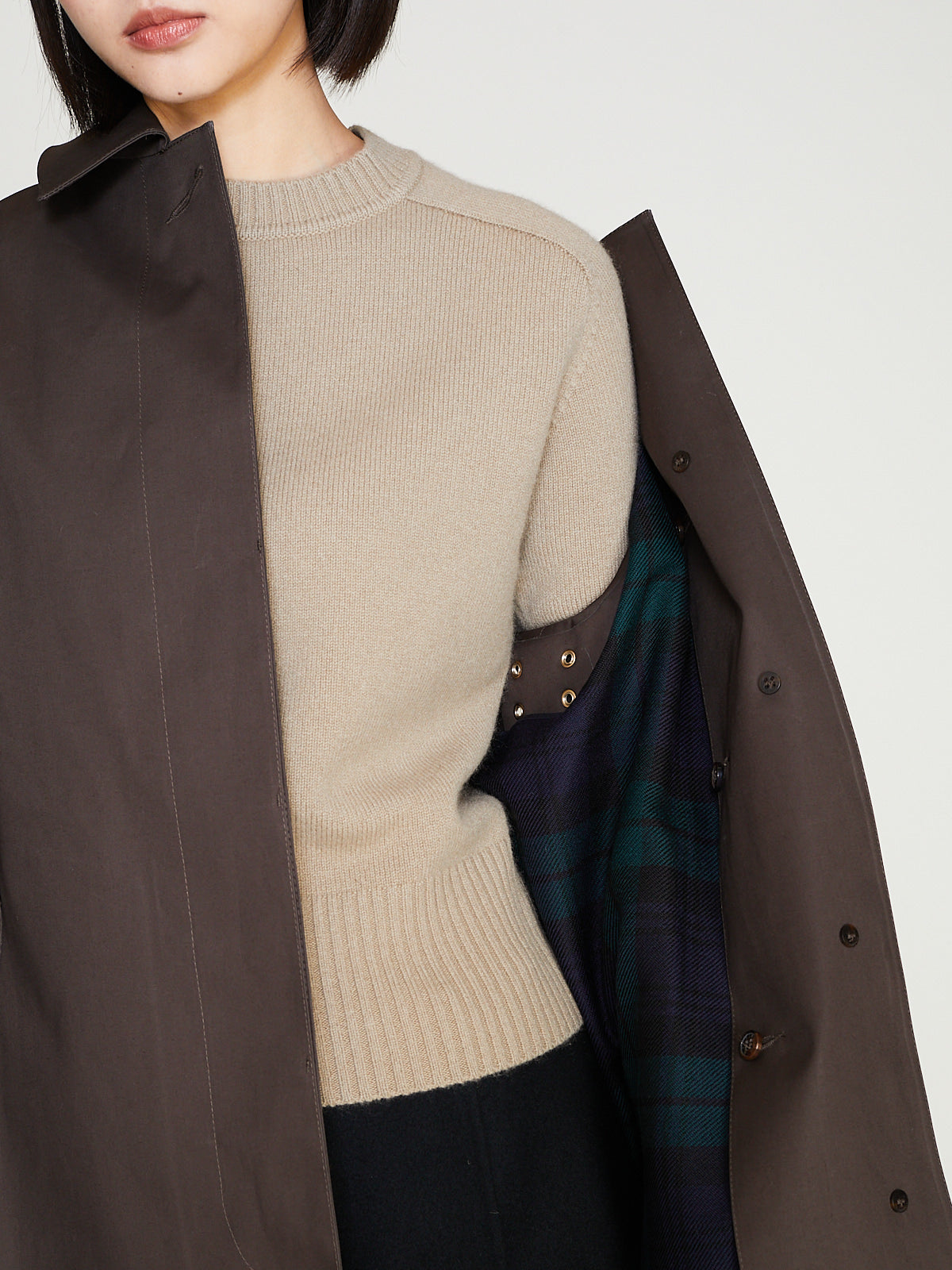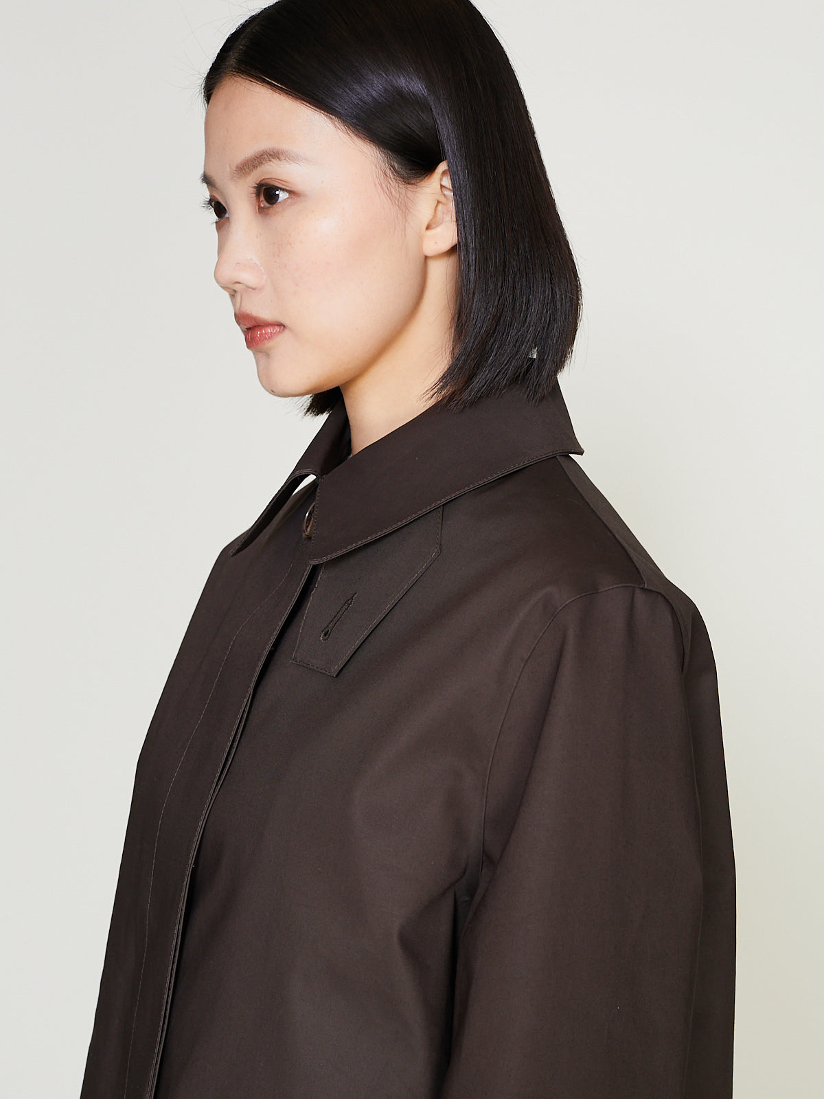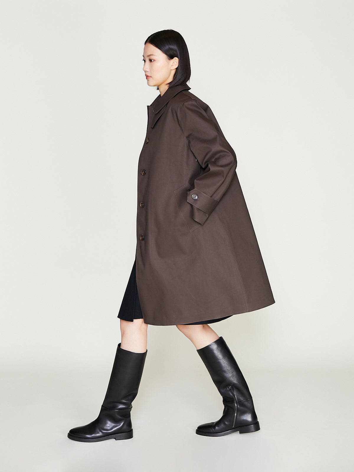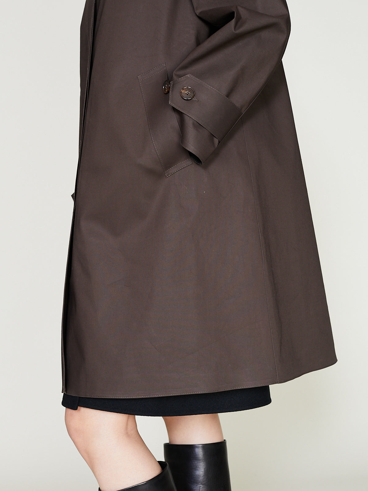 A-line coat in a brown water-repellent and windproof bonded cotton. Classic collar with a removable neck latch, concealed 5-button fly-front closure and long sleeves with belted cuffs and underarm eyelets for breathability. Welted slash pockets on the front. Features an internal tab for interchangeable liner and an internal phone pocket. Fully taped seams. Mid-thigh length. Sleek silhouette. Comes with a checked detachable wool lining.