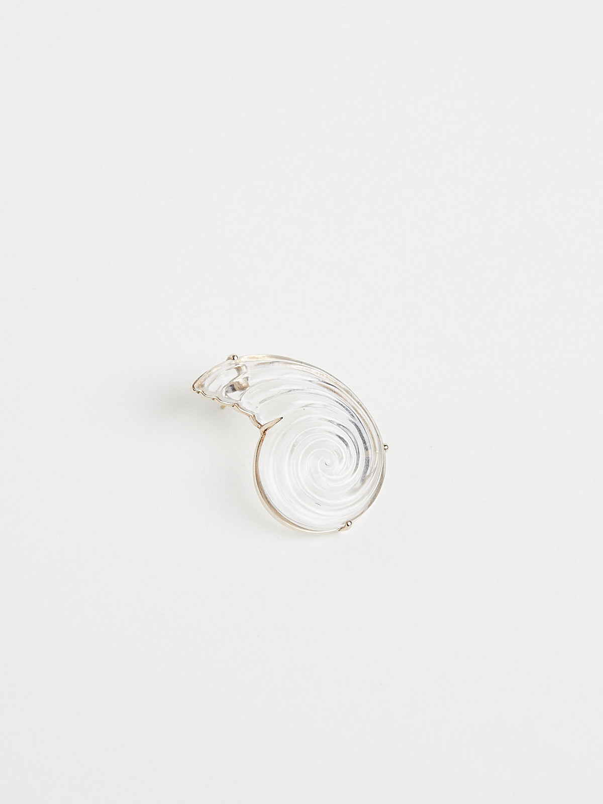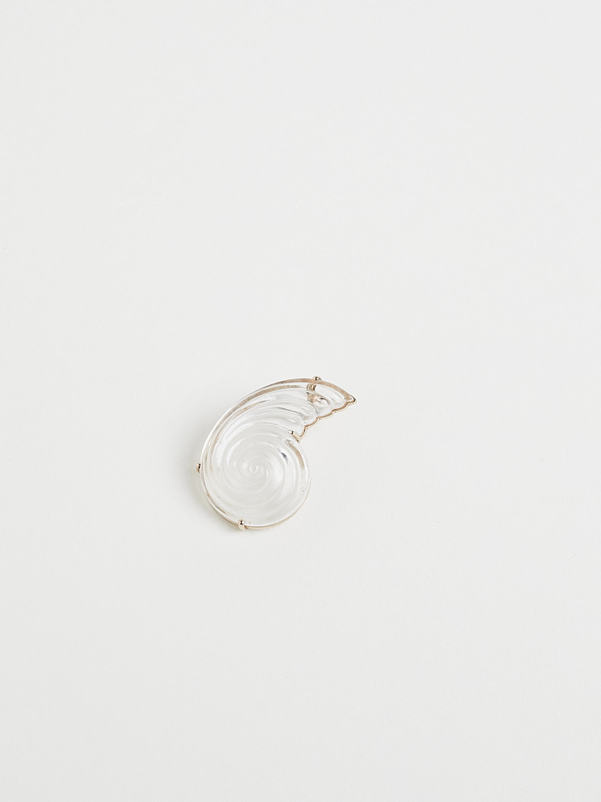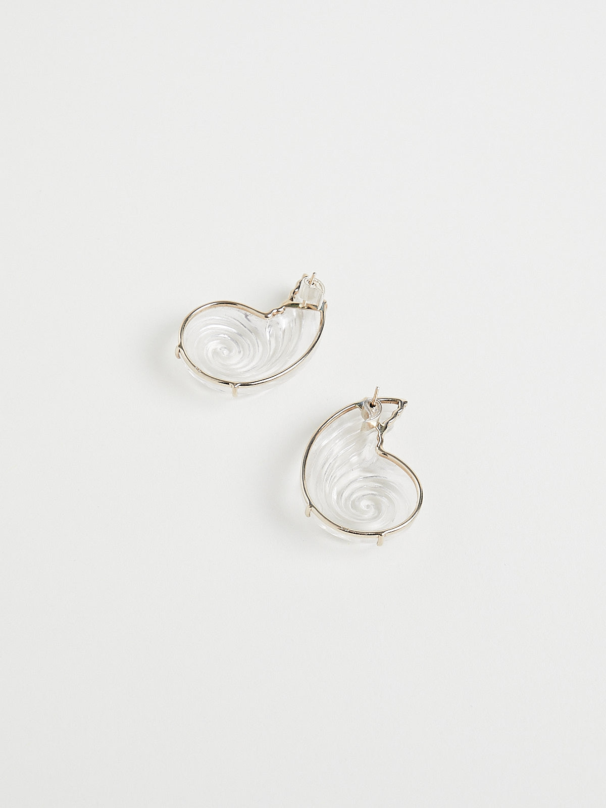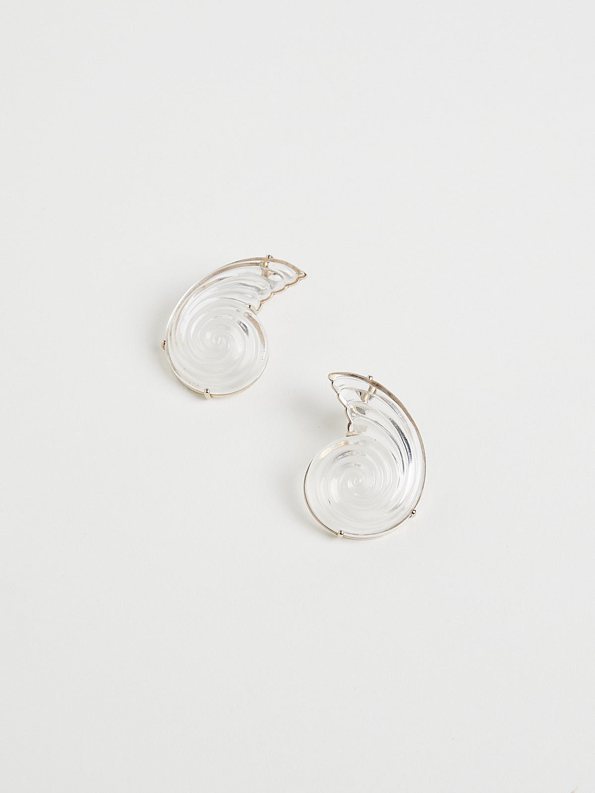 Earrings in 14k yellow gold with handcarved crystal quartz shells. Features an ear post backing.