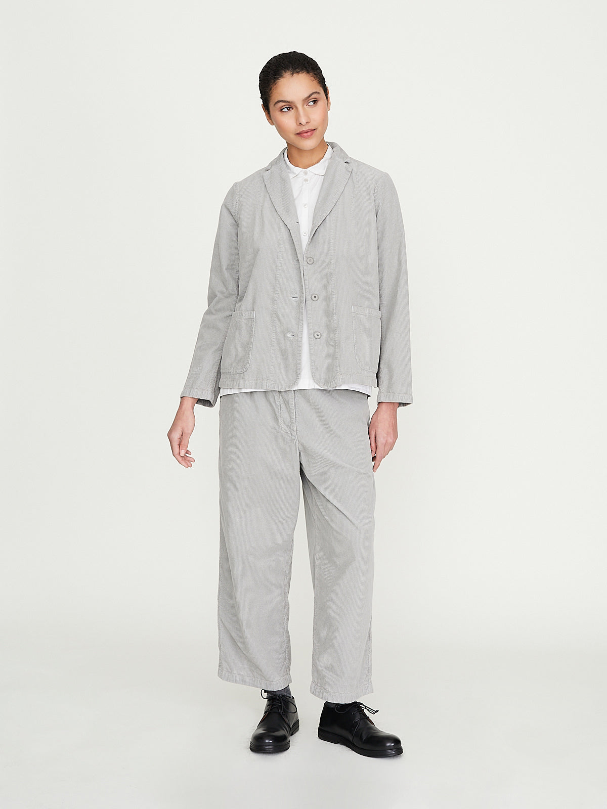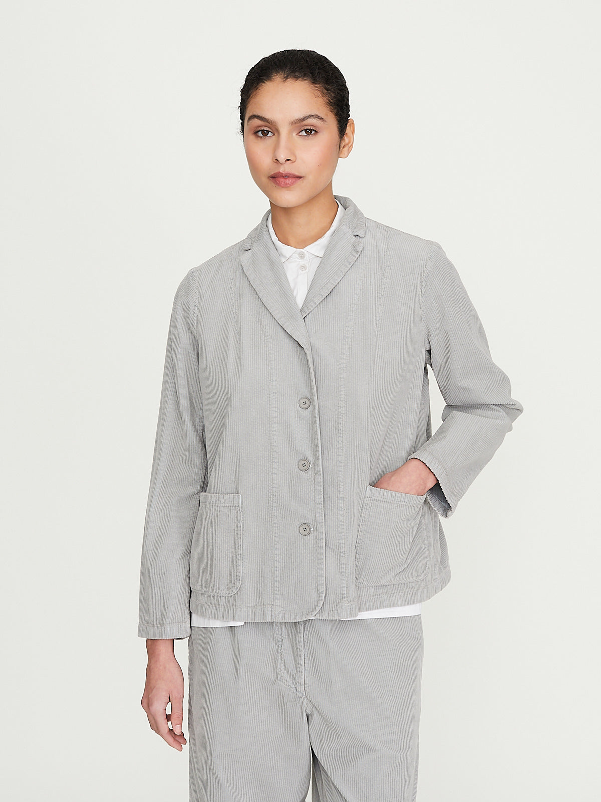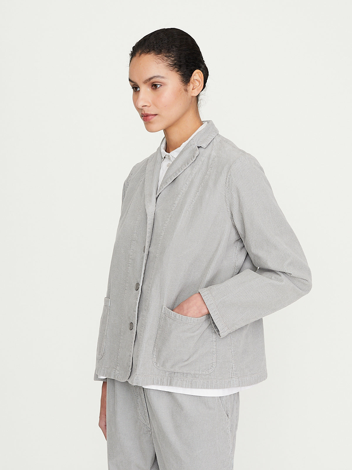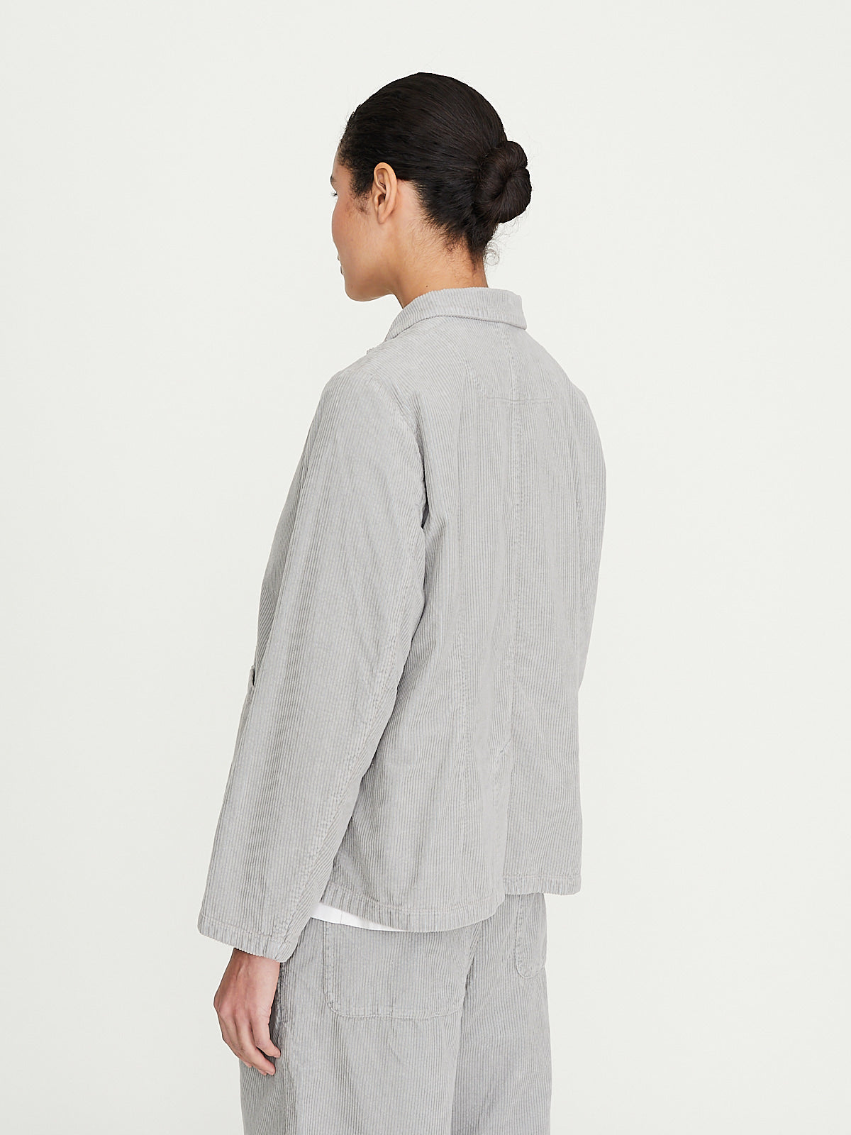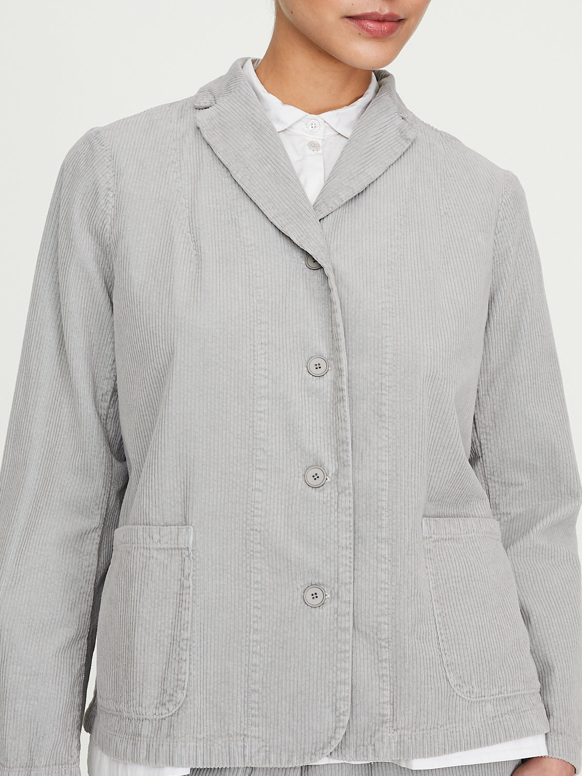 Relaxed jacket in a grey cotton corduroy. Notched collar and a front button fastening. Patch pockets on the front and a back vent. Unlined.