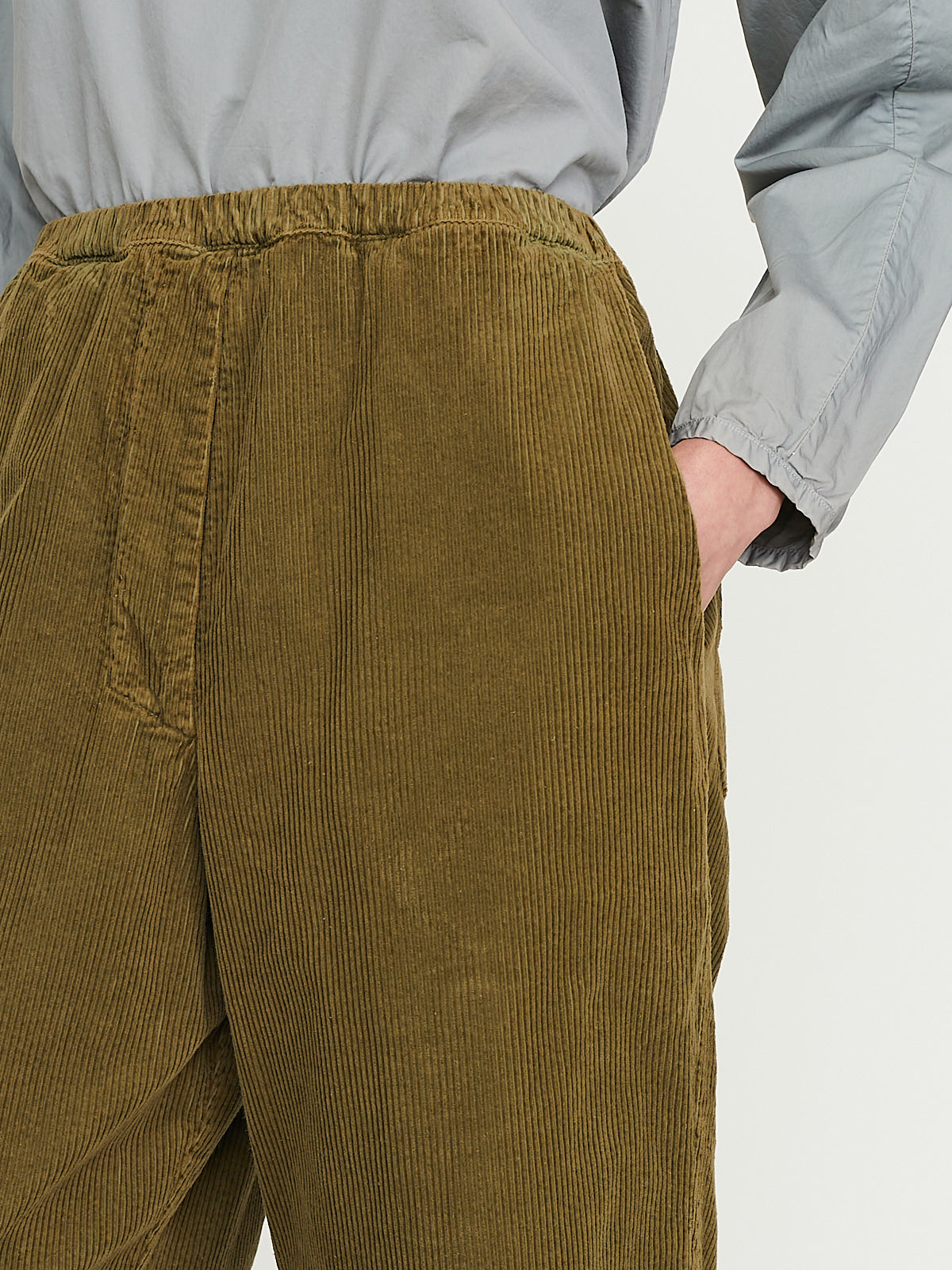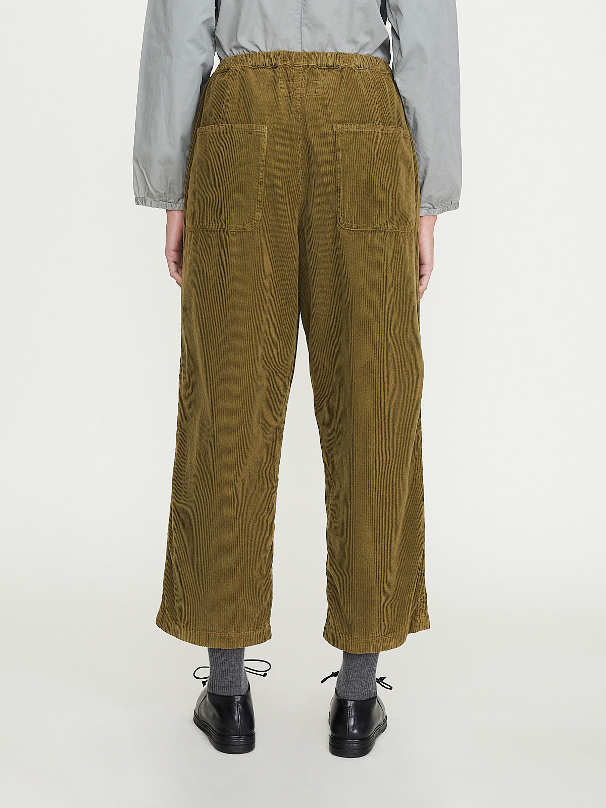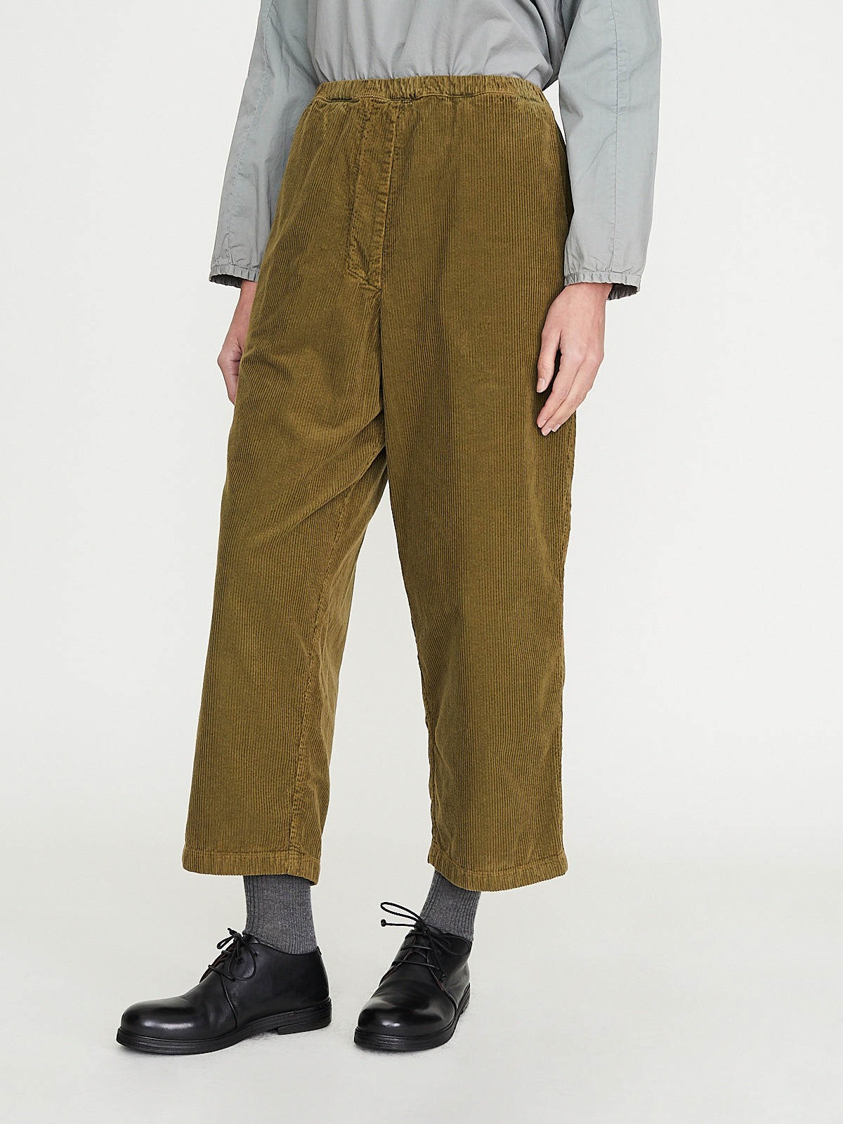 Oversized trouser in olive cotton corduroy. Pull-on style with an elasticted waistband and side seam pockets. Features two patch pockets on the back. Wide cropped legs.