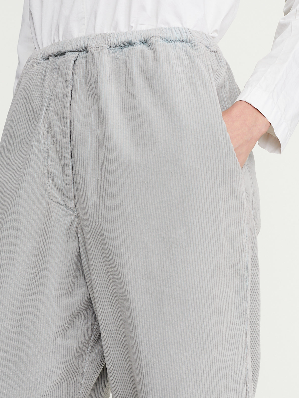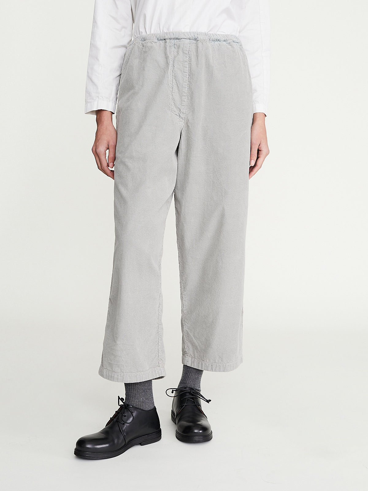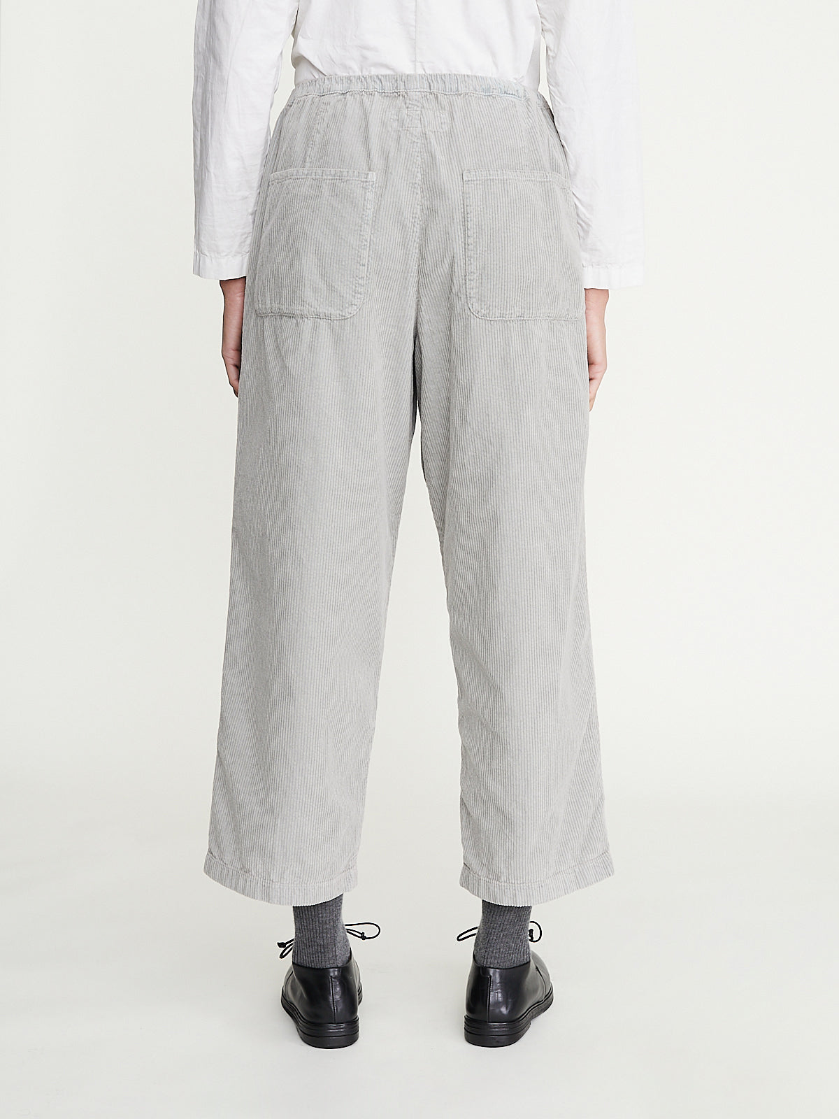 Oversized trouser in grey cotton corduroy. Pull-on style with an elasticted waistband and side seam pockets. Features two patch pockets on the back. Wide cropped legs.