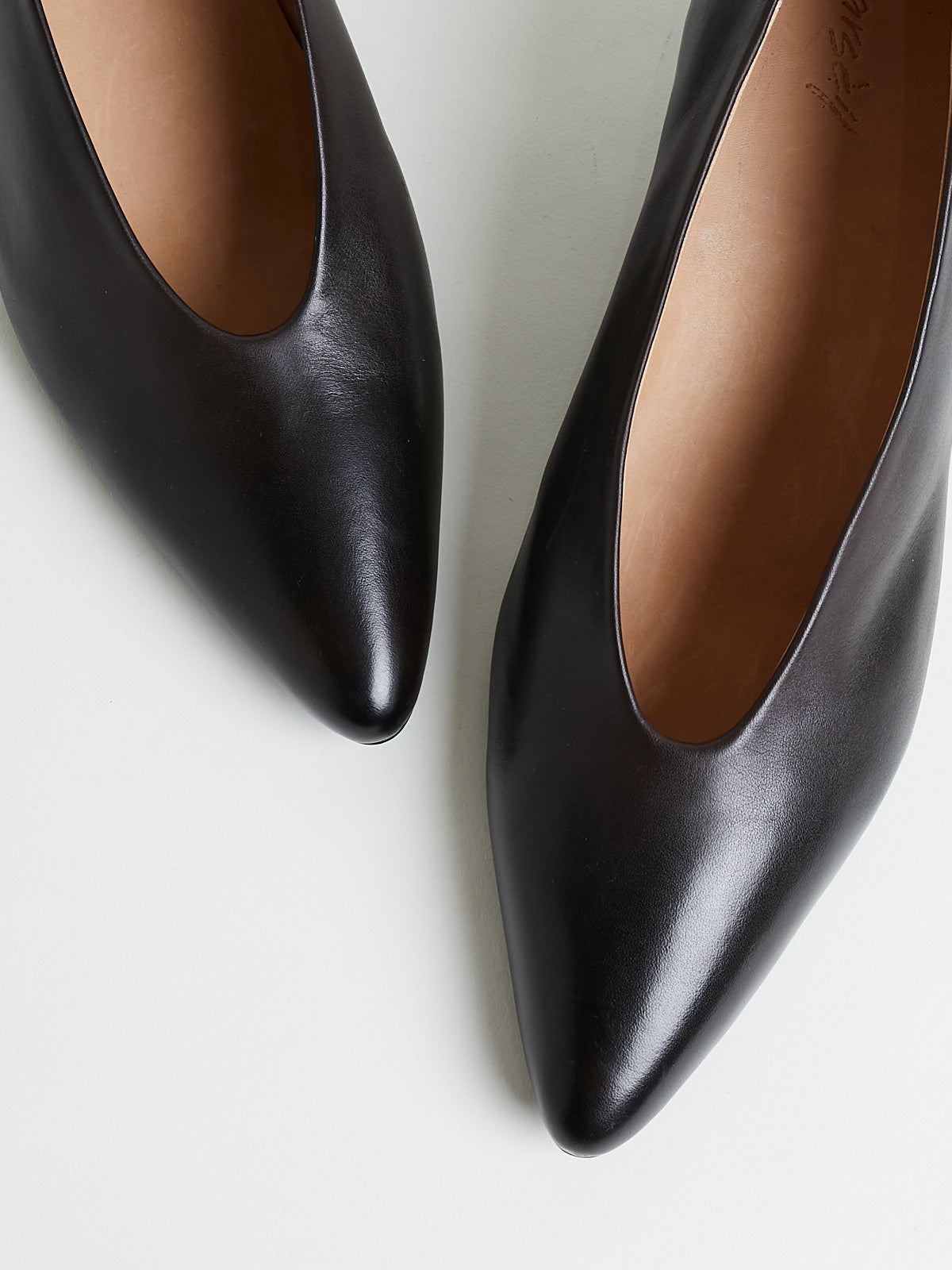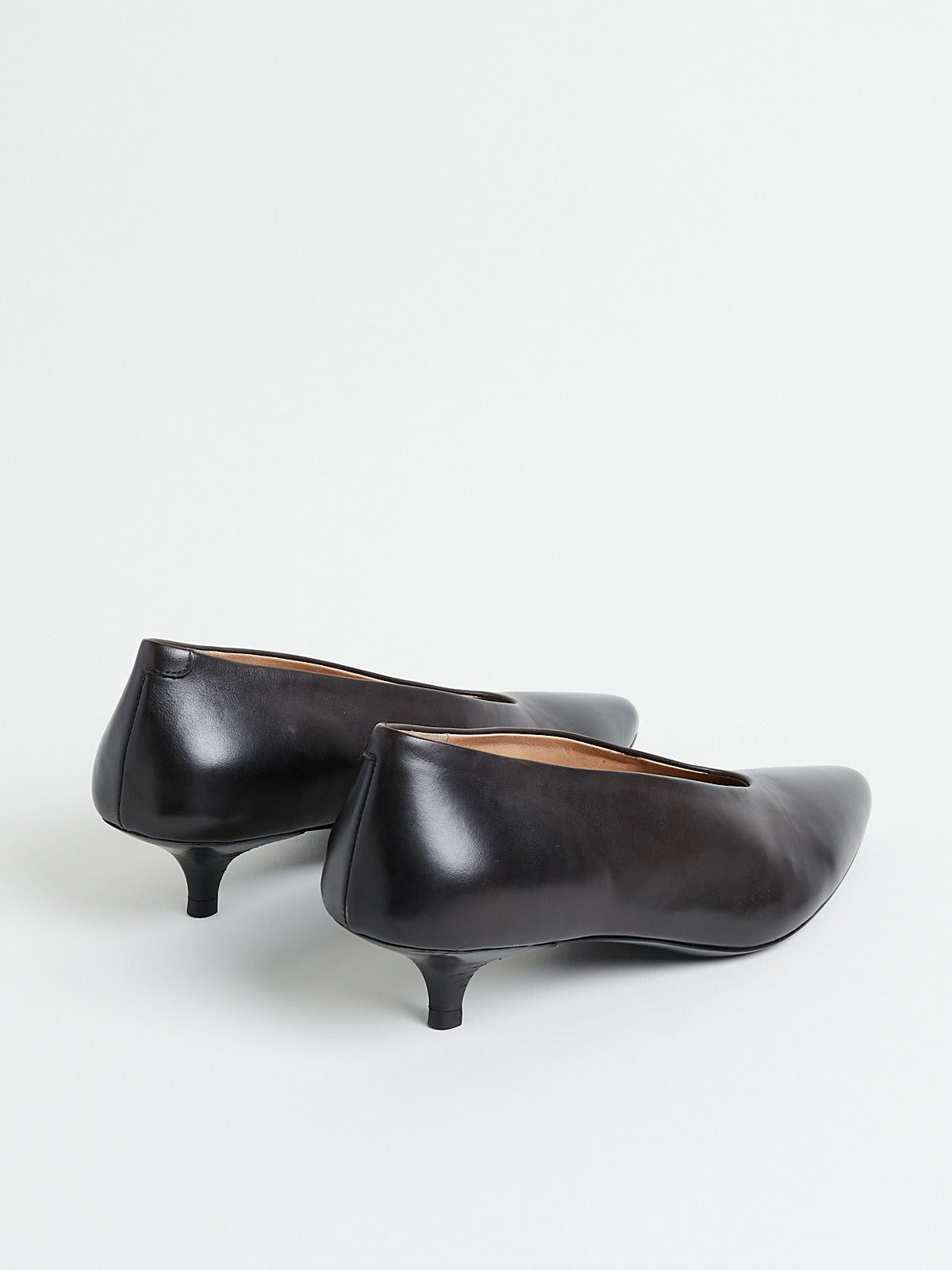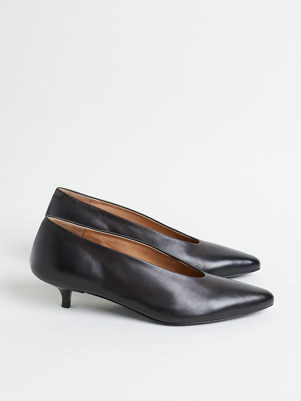 Seamless pump in soft and smooth dark brown leather. Elongated tapered toe that is mirrored in the cut of the upper. Features a leather-wrapped stiletto heel.