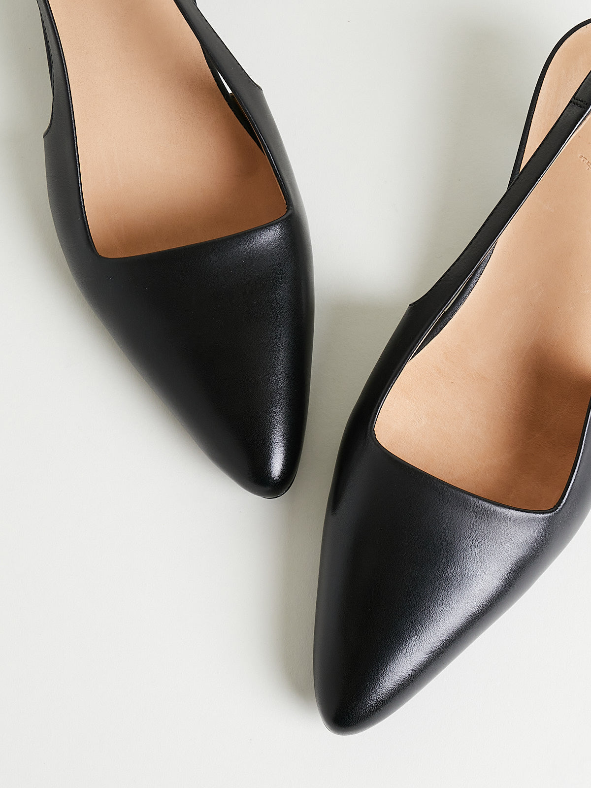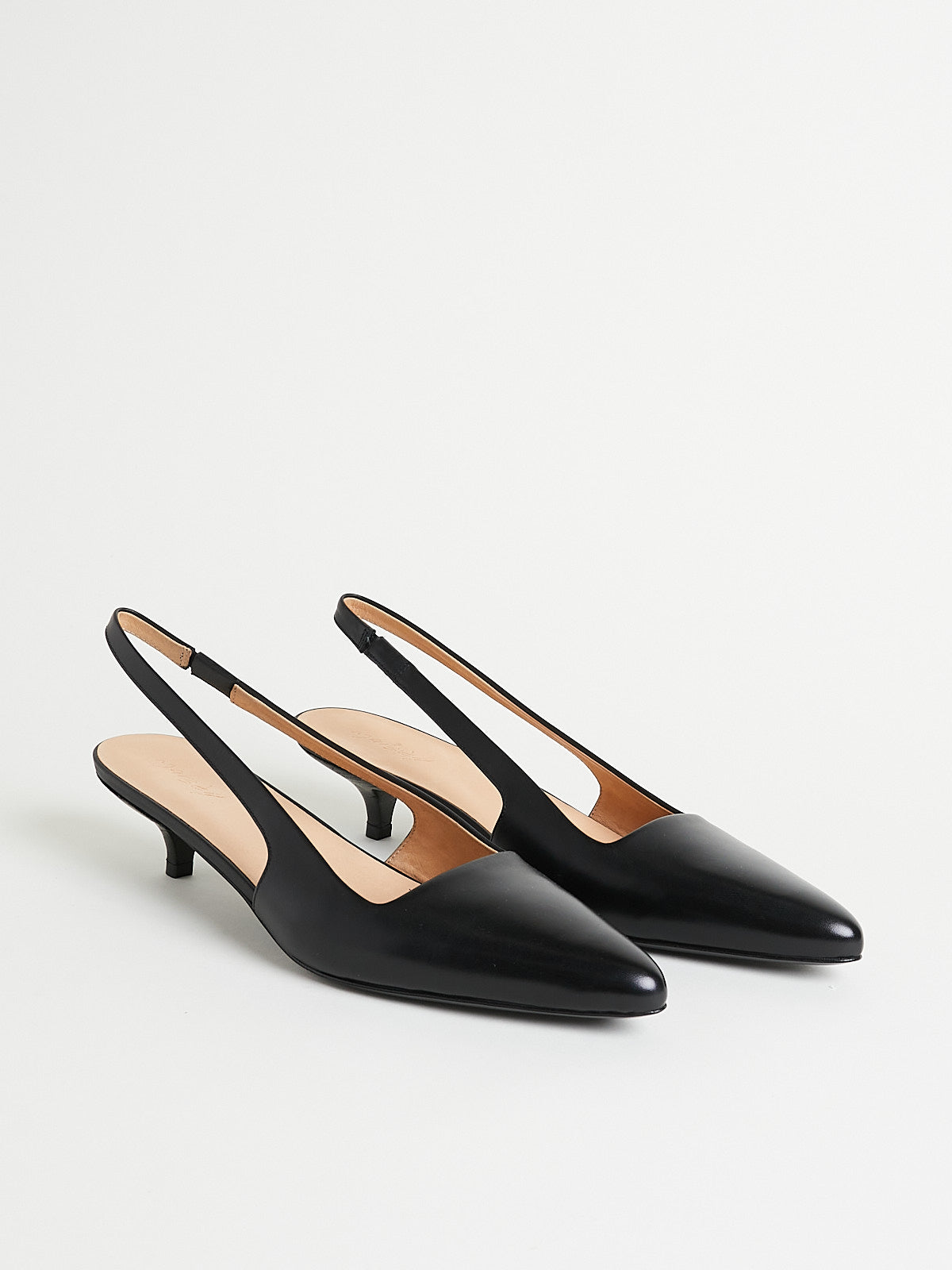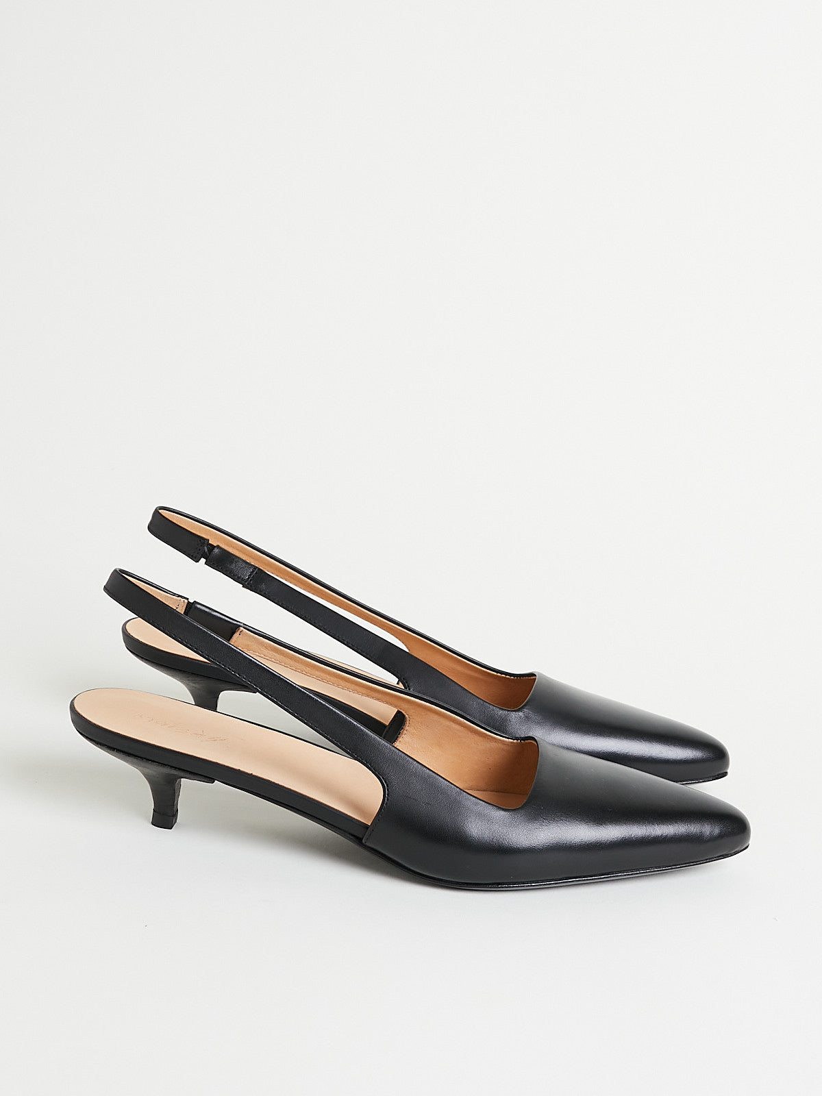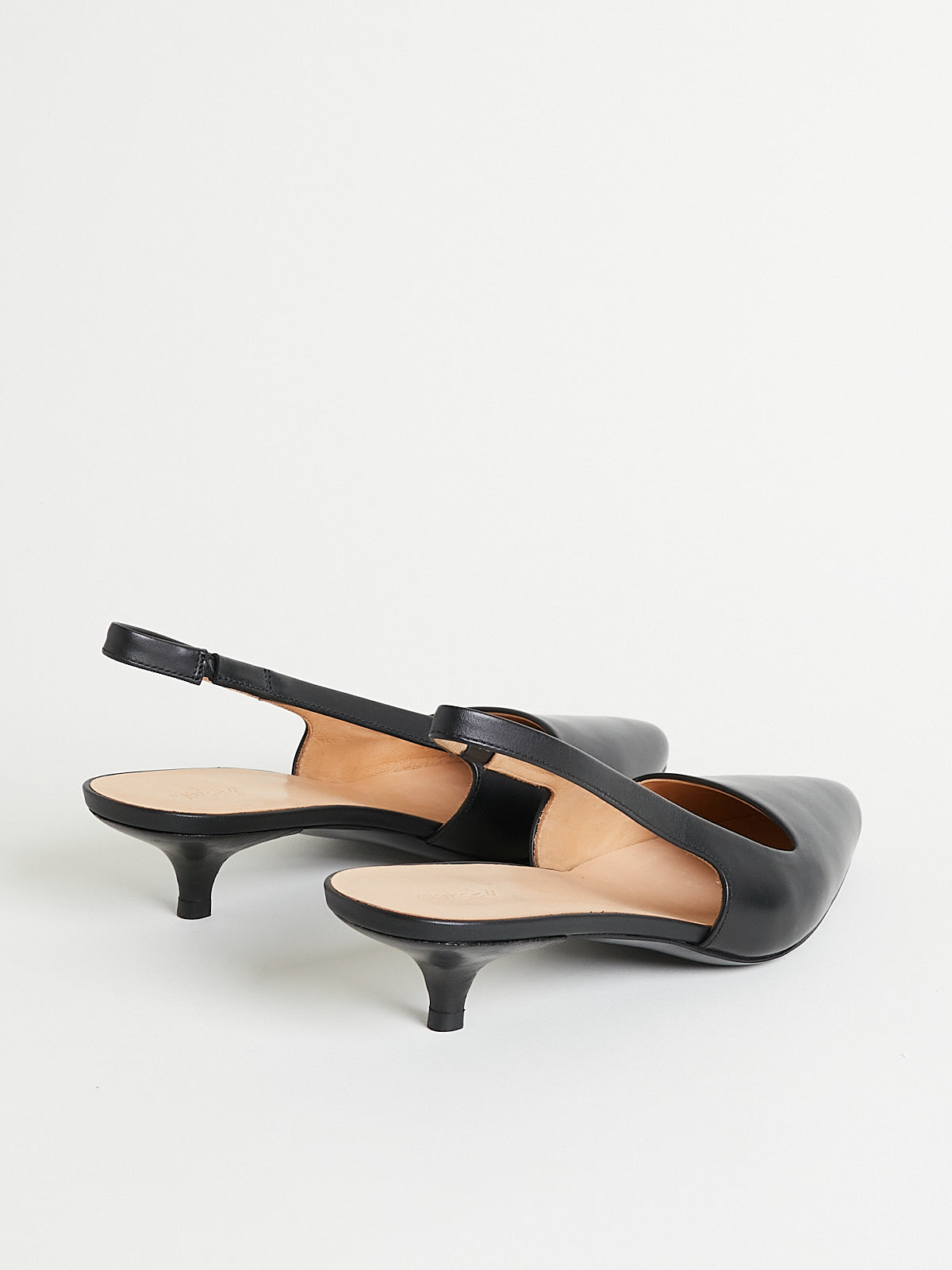 Slingback pumps crafted from smooth black leather. Elongated tapered toe and a leather-wrapped stiletto heel that is squared at the back. Lined in nude leather.