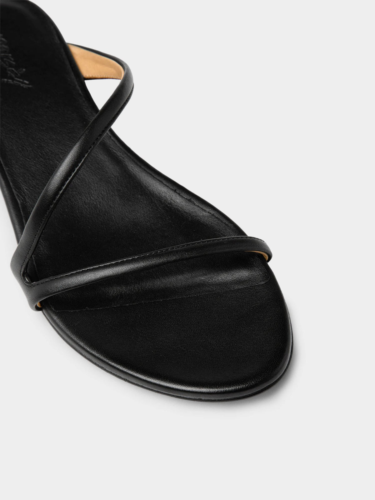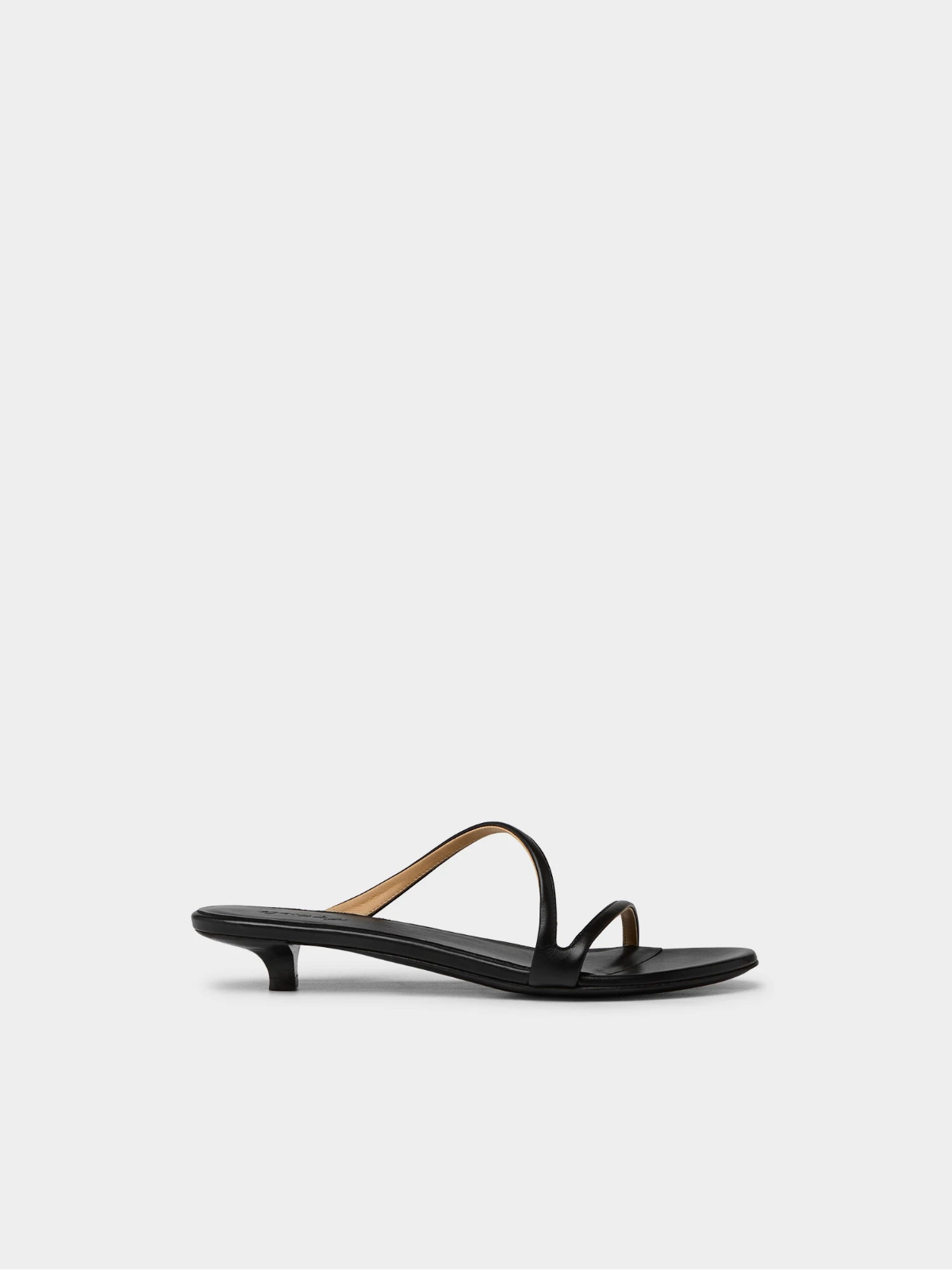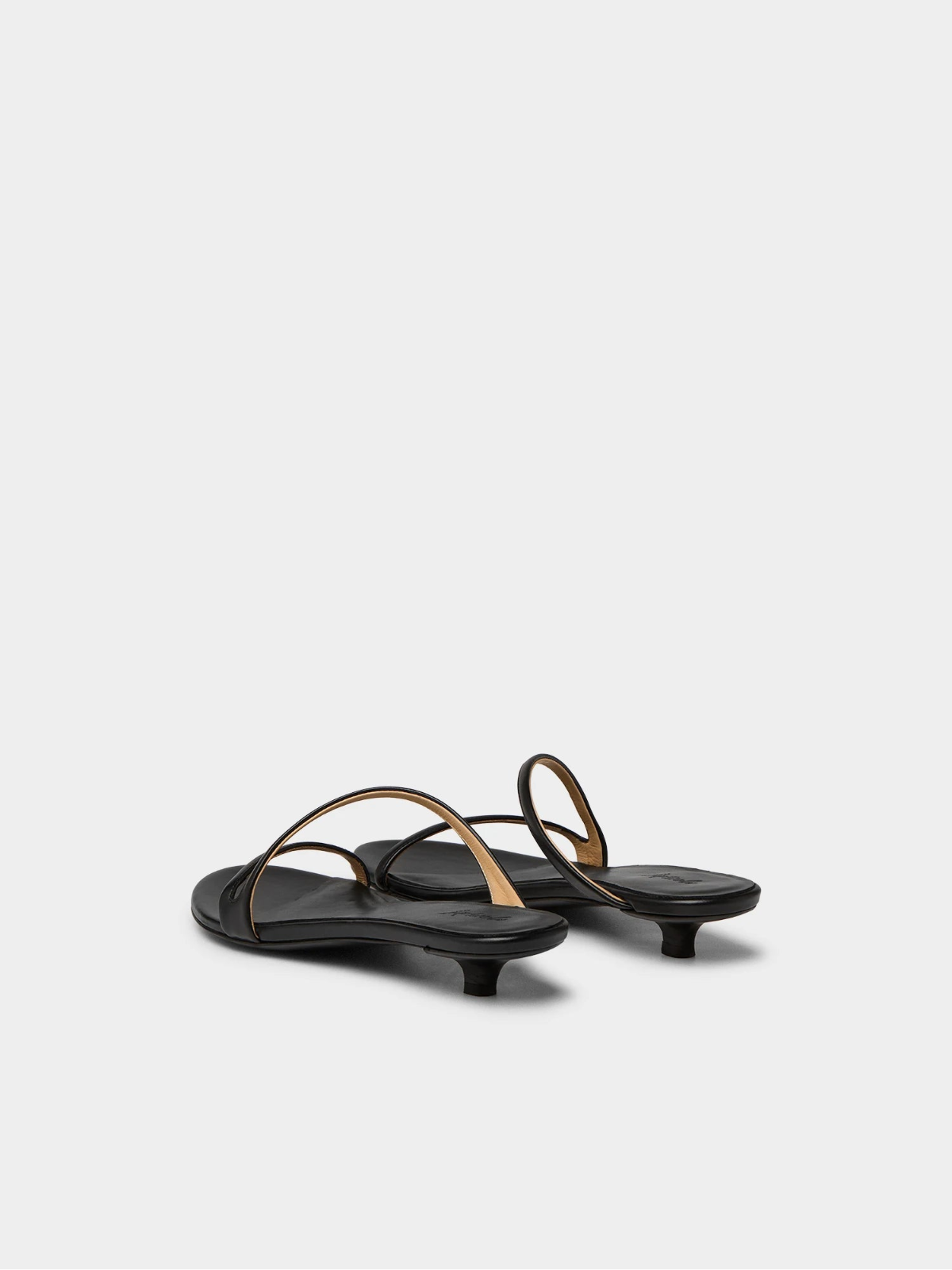 Delicate mule sandal in black leather. Rounded toe and with thin leather straps that embrace the foot. The leather sole is completed by a leather-covered stiletto heel.