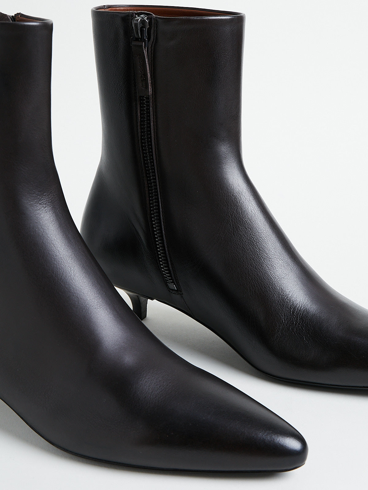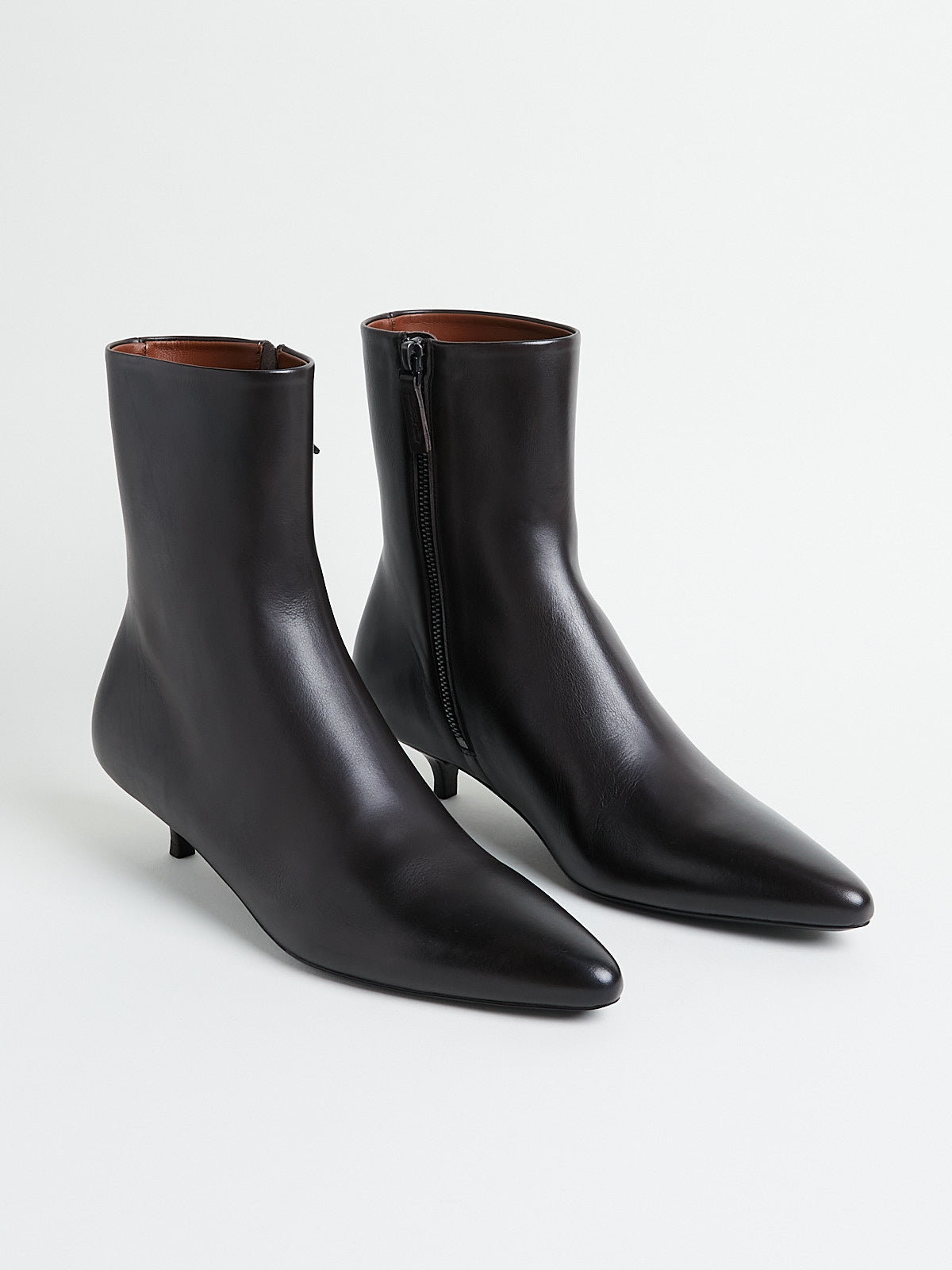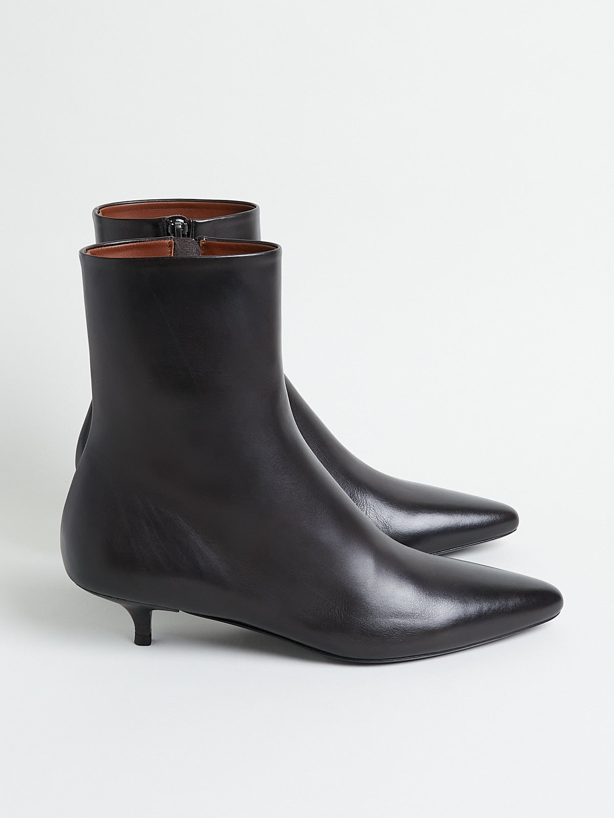 Ankle boots in soft and smooth dark brown leather. Pointy toe and with a zip fastening on the side. Features a stacked kitten heel.
