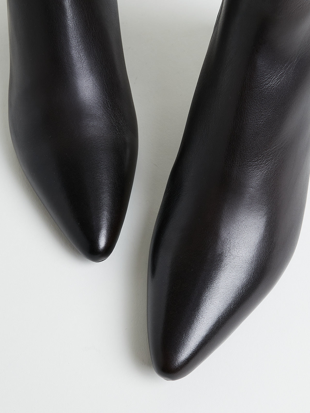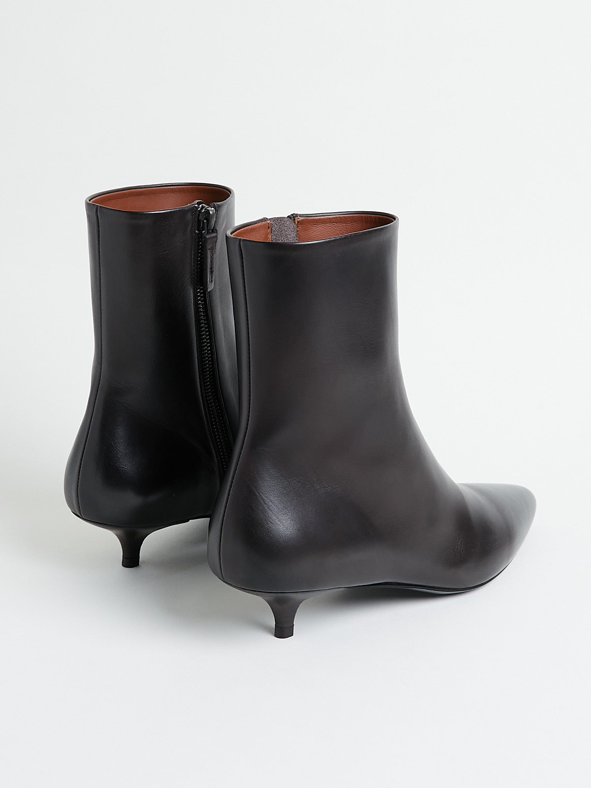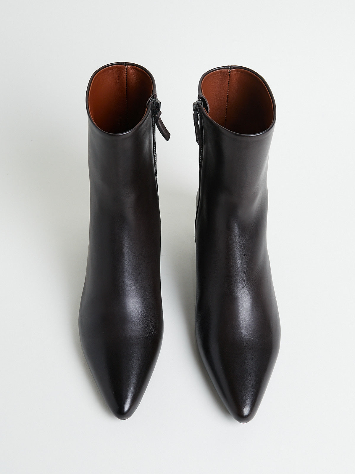 Ankle boots in soft and smooth dark brown leather. Pointy toe and with a zip fastening on the side. Features a stacked kitten heel.