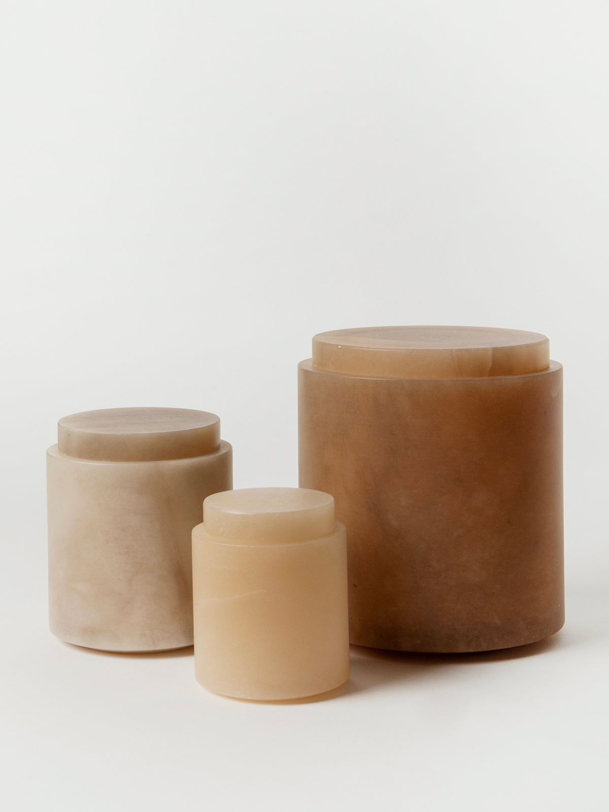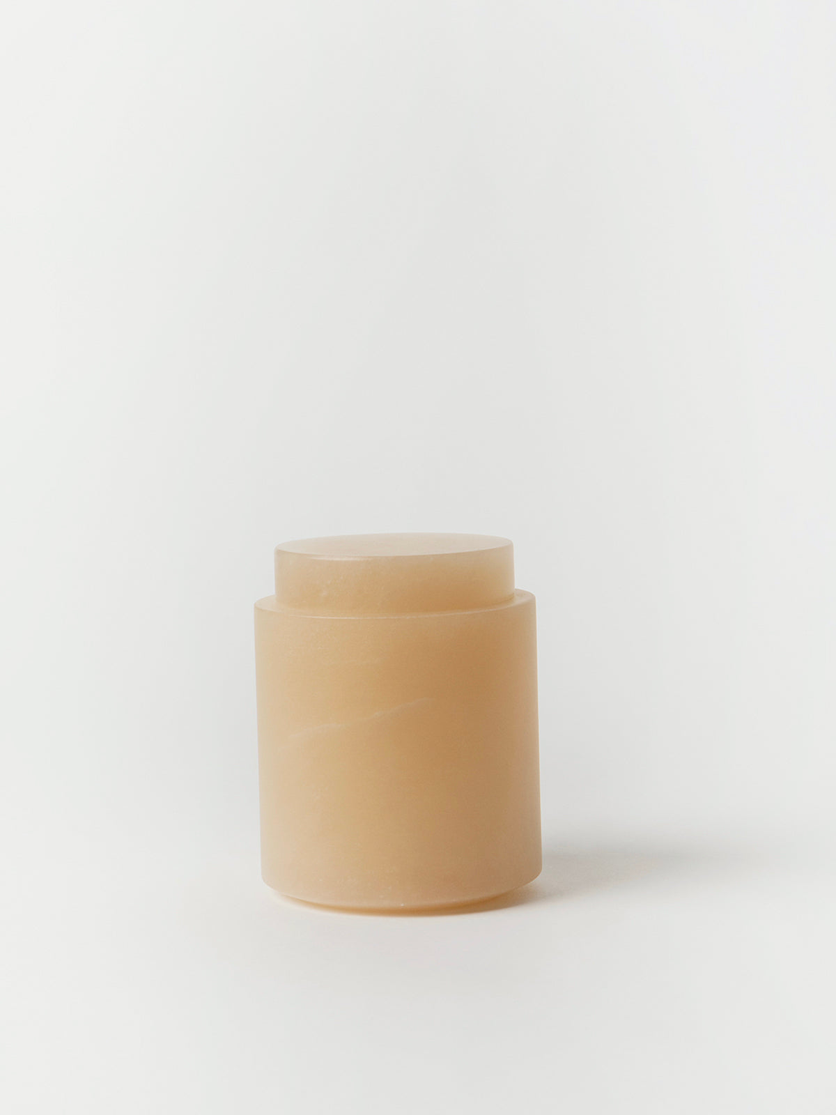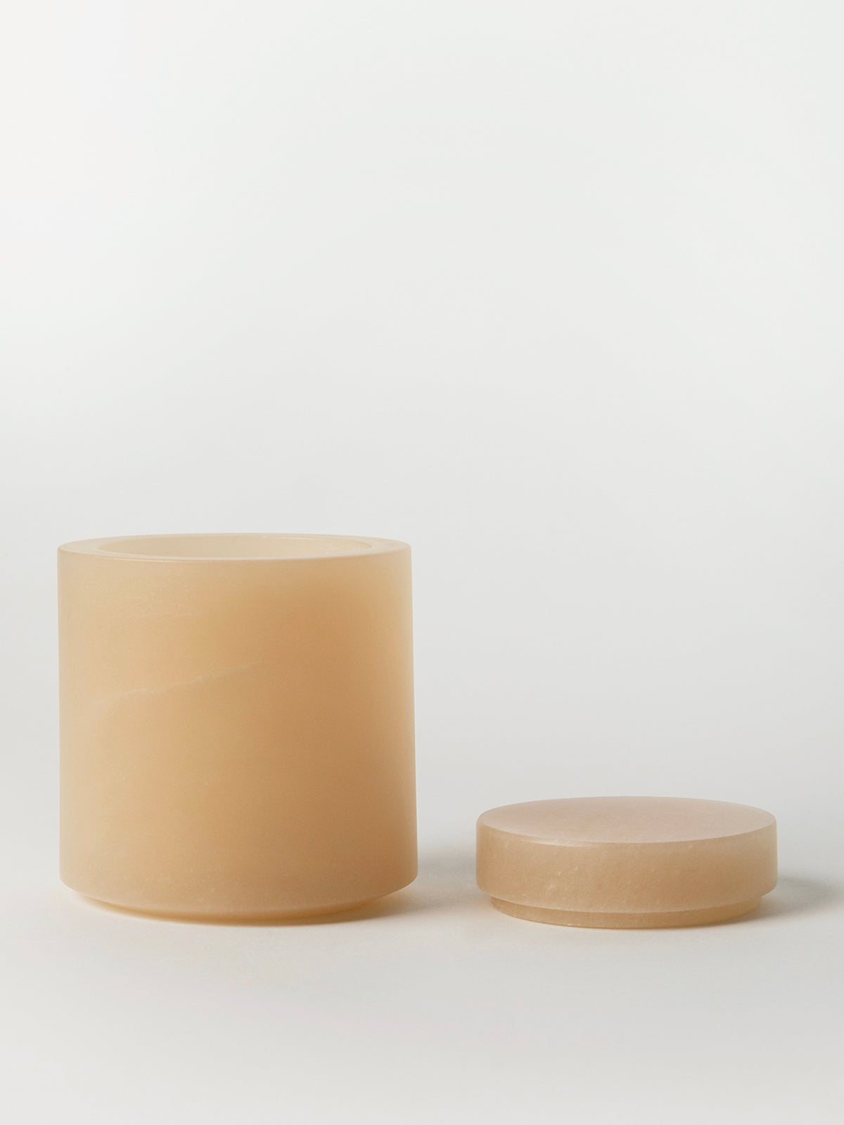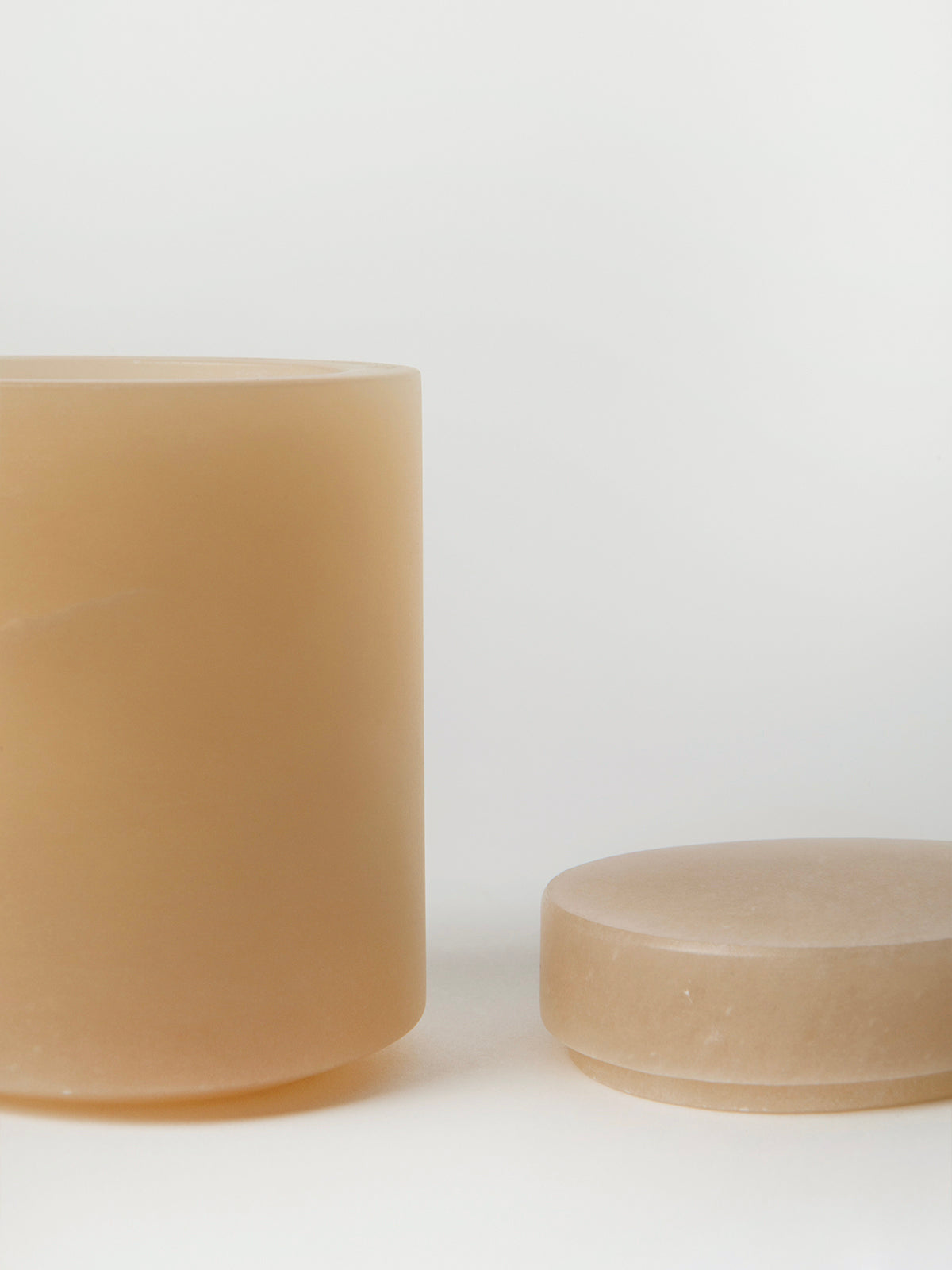 Small container with lid made from marbled light brown alabaster. Every piece is handmade and unique so finish might vary.