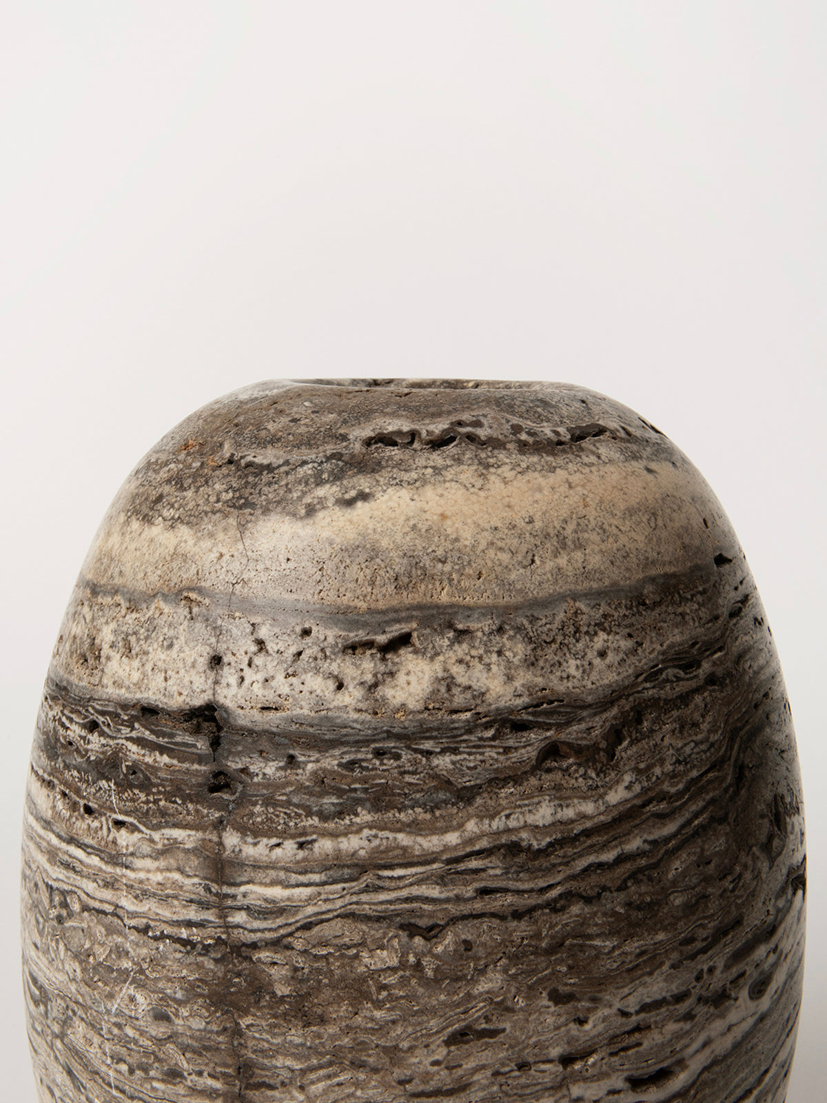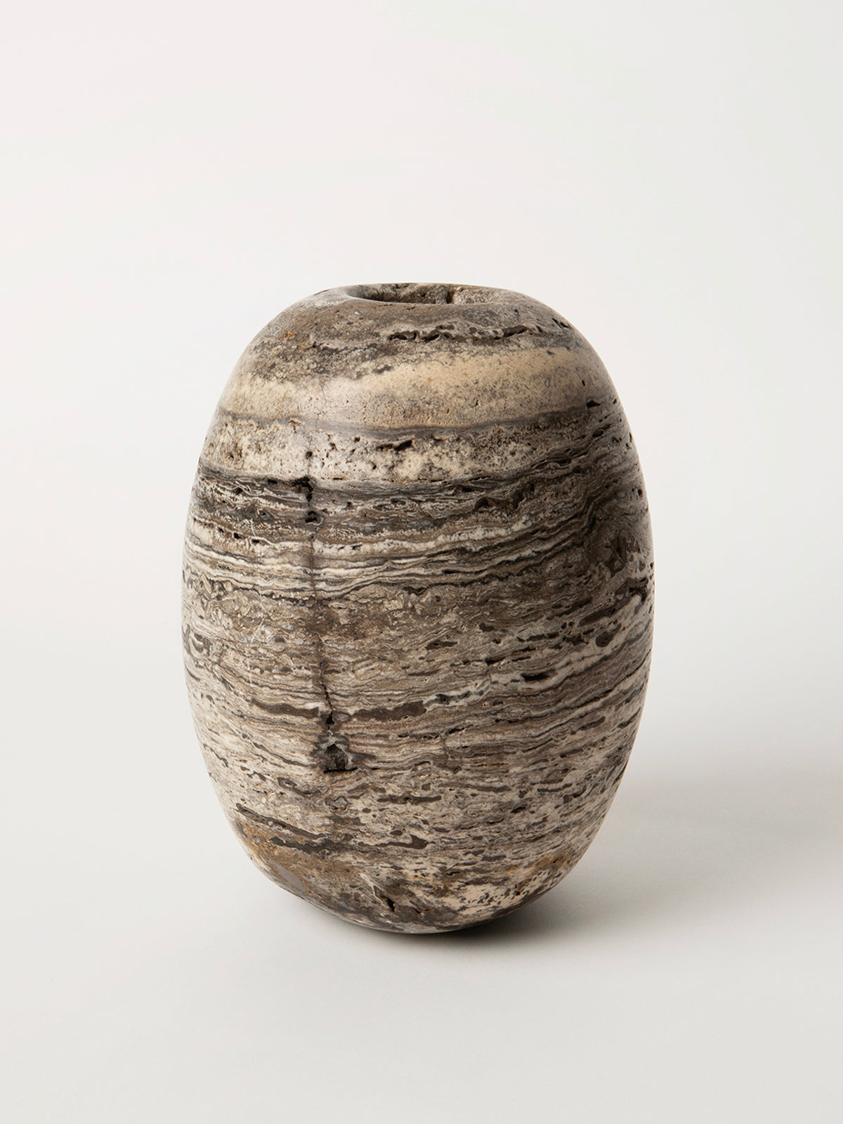Egg-shaped vase handcrafted from one whole piece of marbled brown travertine. Comes with a glass insert to hold flowers and water. Every piece is handmade and unique so finish might vary.