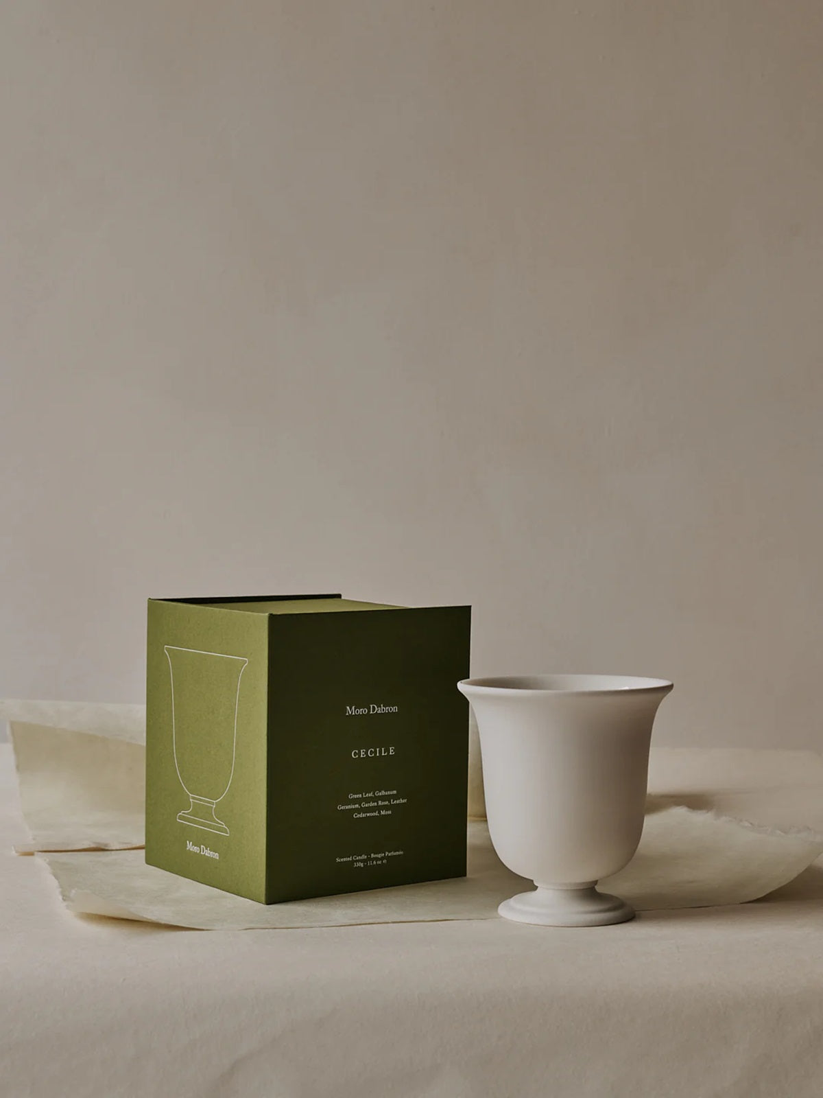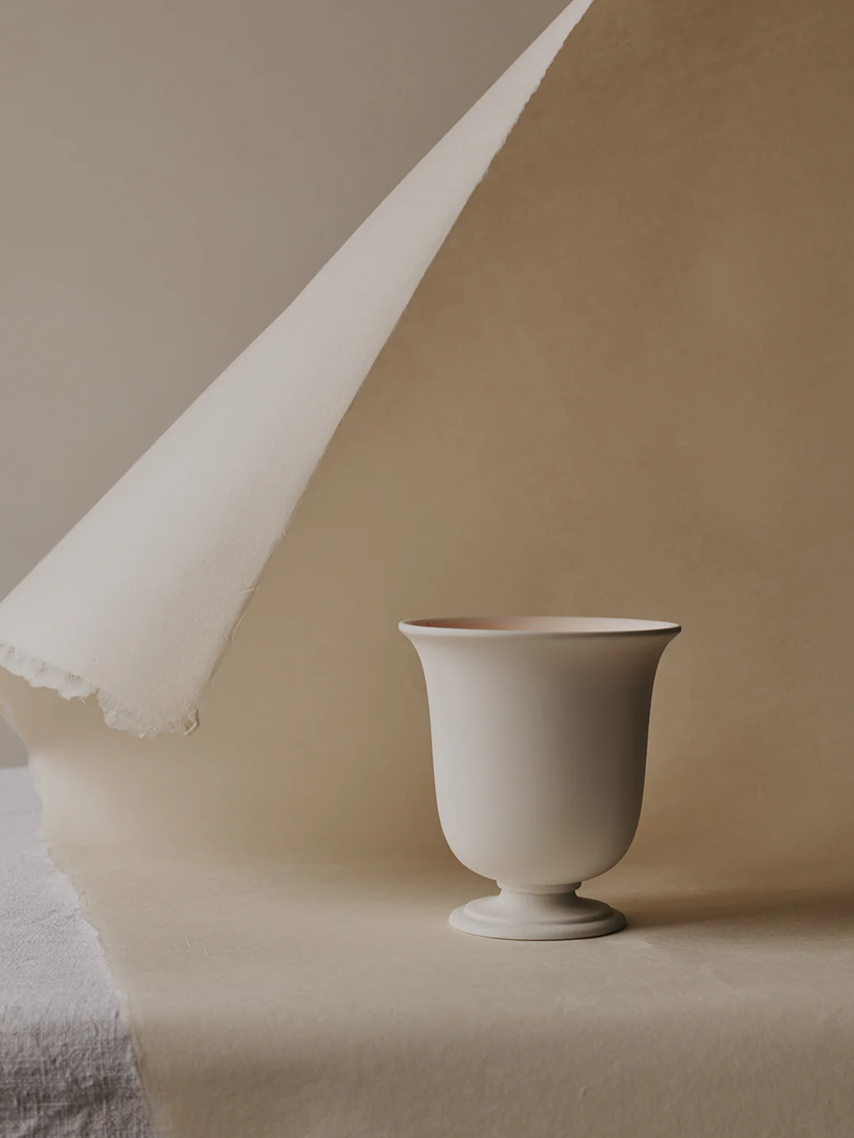 Comes in a porcelain vessel inspired by 8th century stemcups, characterised by a footed base, raised band, and flared rim. After use it can be repurposed as a vase for stems or a decorative object.