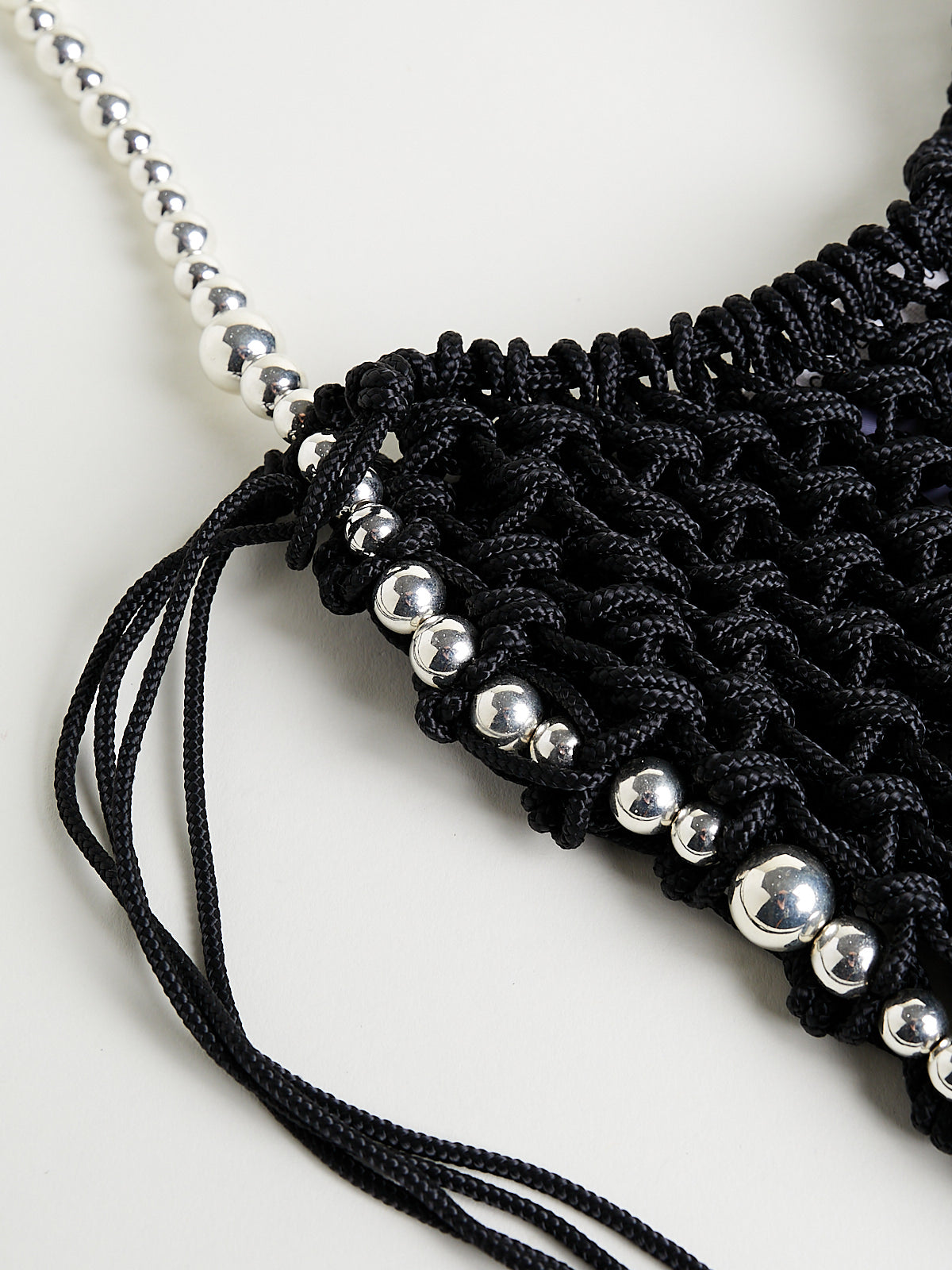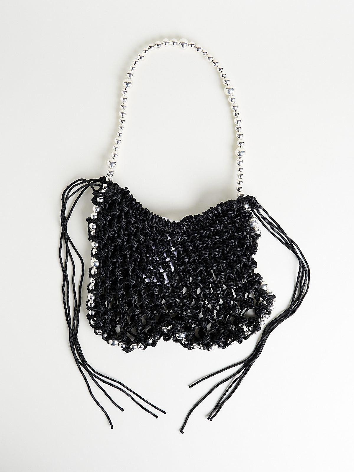 Handmade small woven net bag made from black nylon. Top handle with little silver tone beads in different sizes attached together, draped strap detailing on each side and a main compartment.