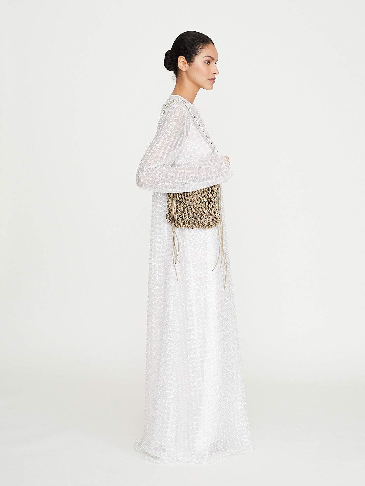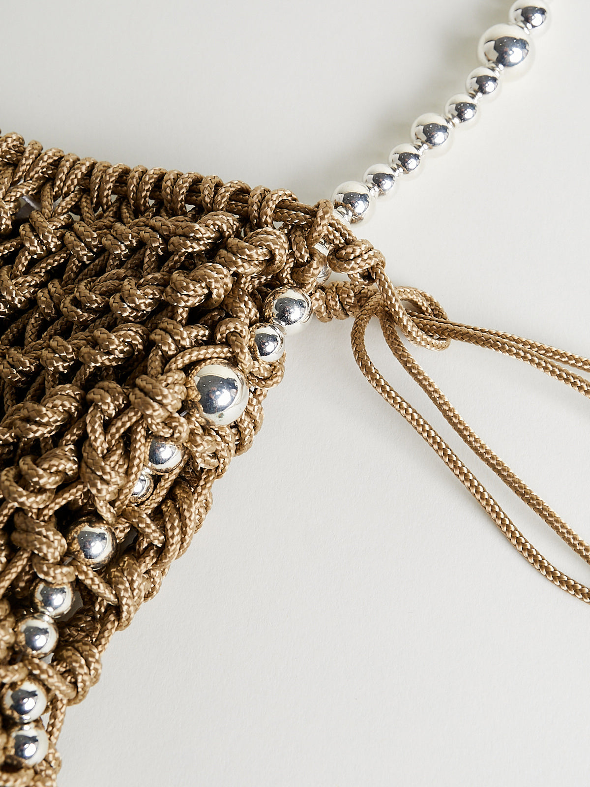 Handmade small woven net bag made from light taupe nylon. Top handle with little silver tone beads in different sizes attached together, draped strap detailing on each side and a main compartment.