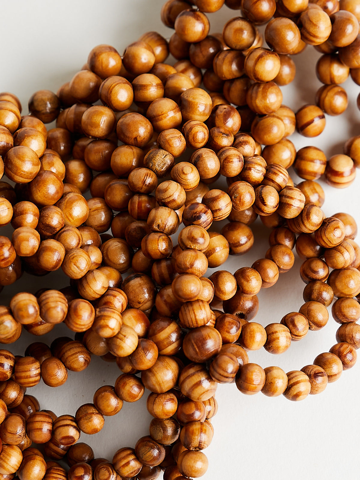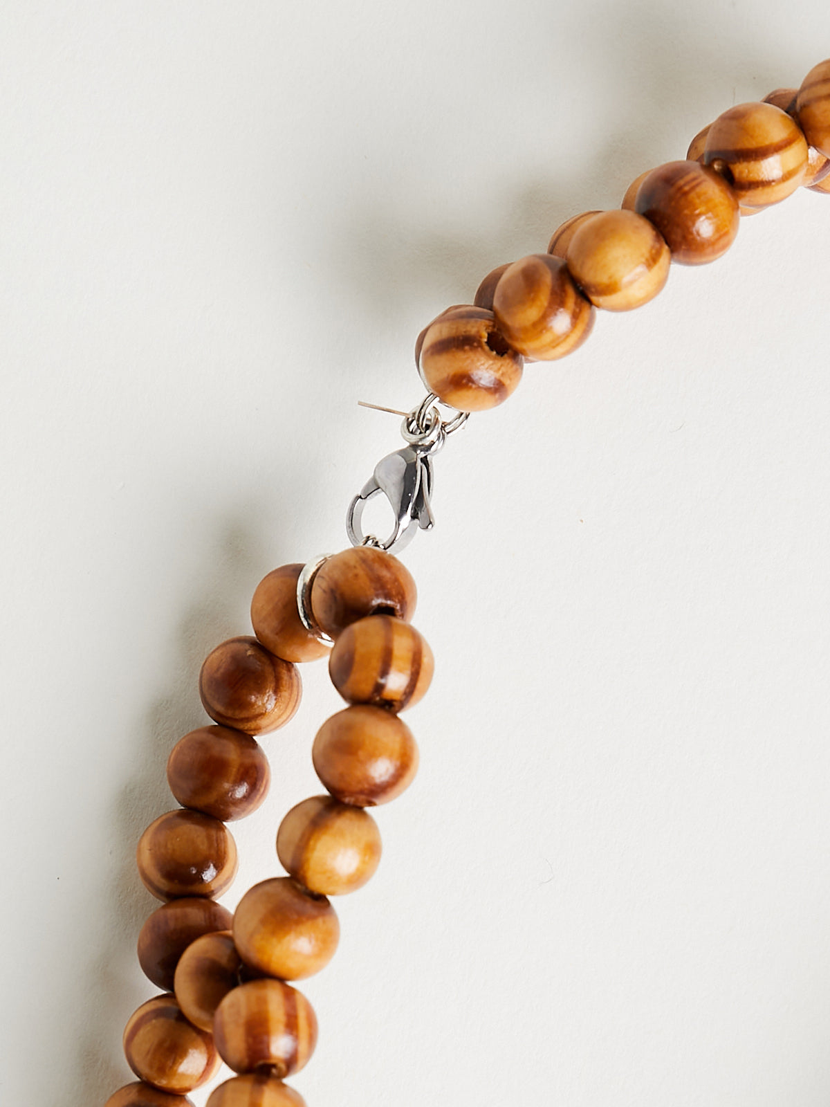 Chunky ornamental necklace made from natural wooden beads. Featuring silver-tone hardware and a lobster claw clasp.