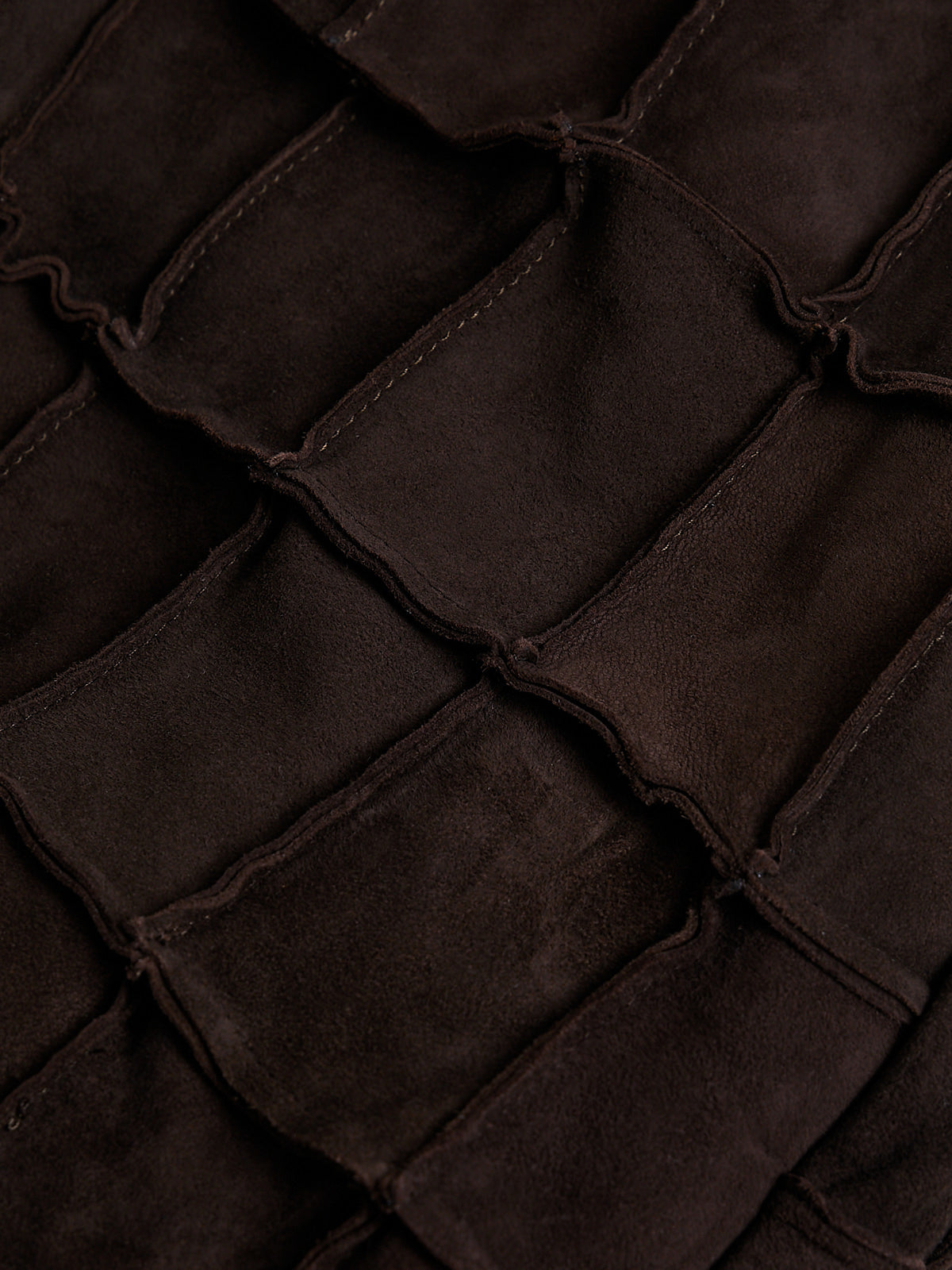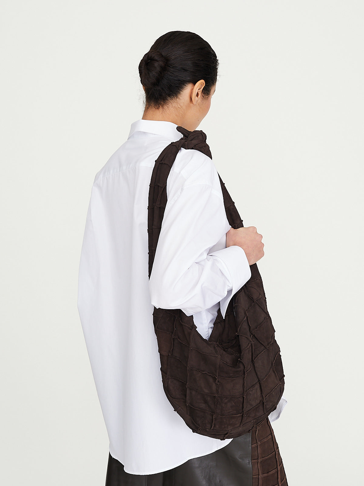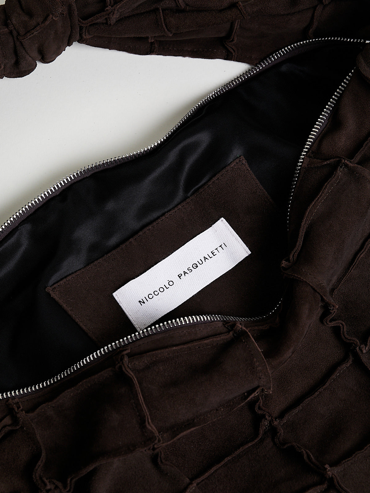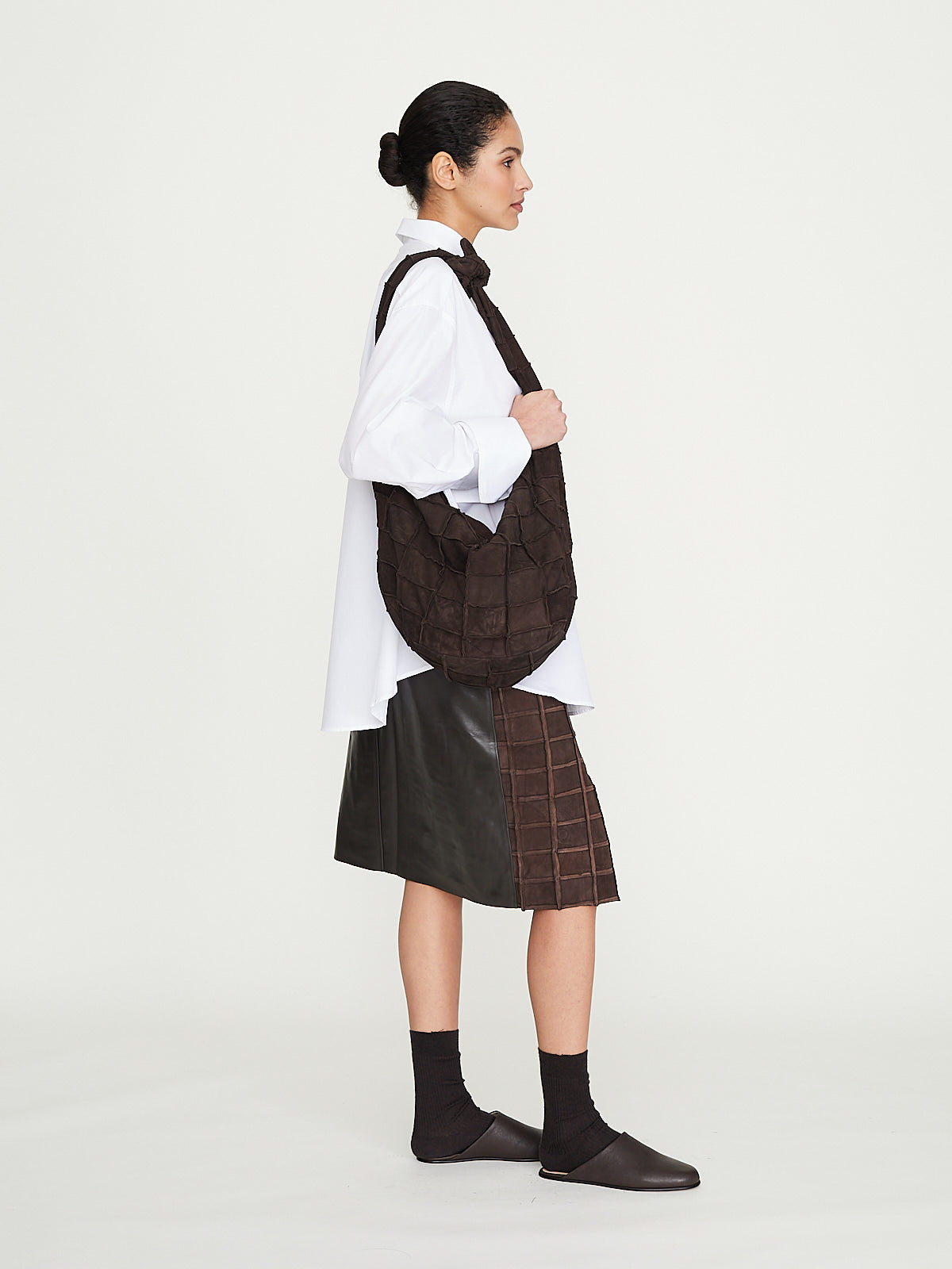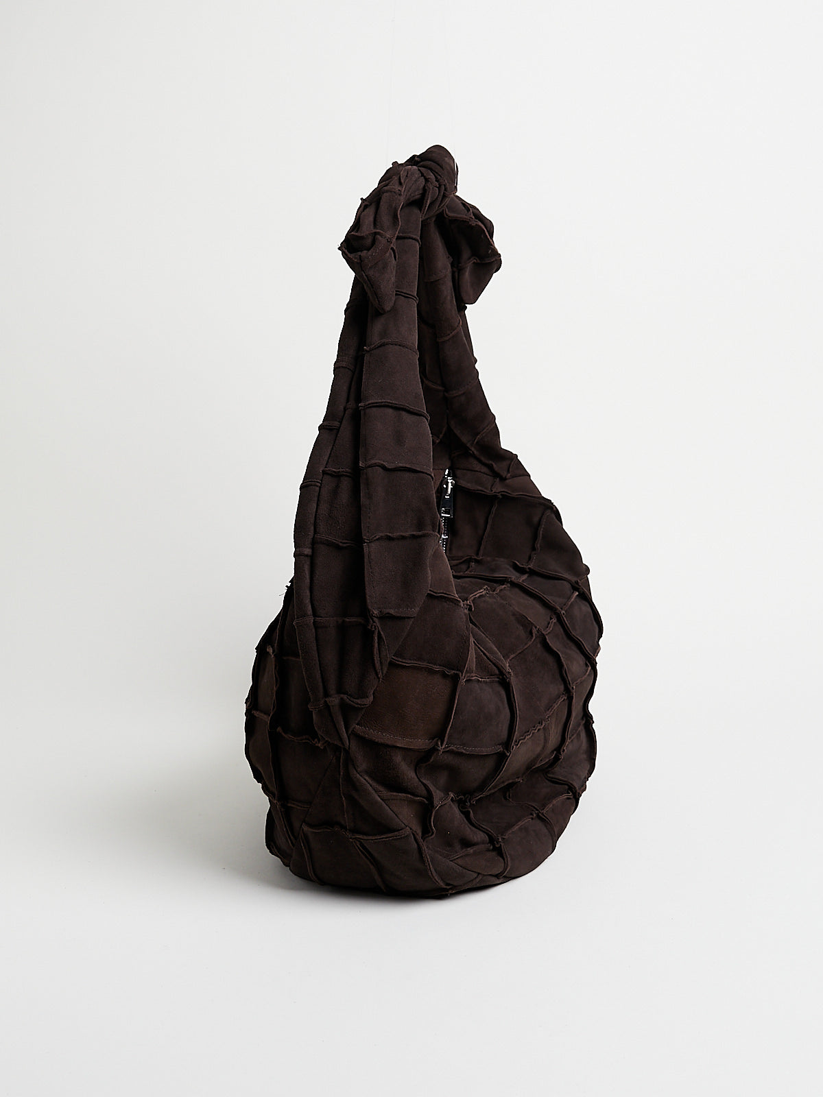Hobo bag in dark brown suede lamb leather with a windowpane patchwork design. Zip fastening and an adjustable shoulder strap with a knot detail. Features an internal flat pocket. Lined in black satin.