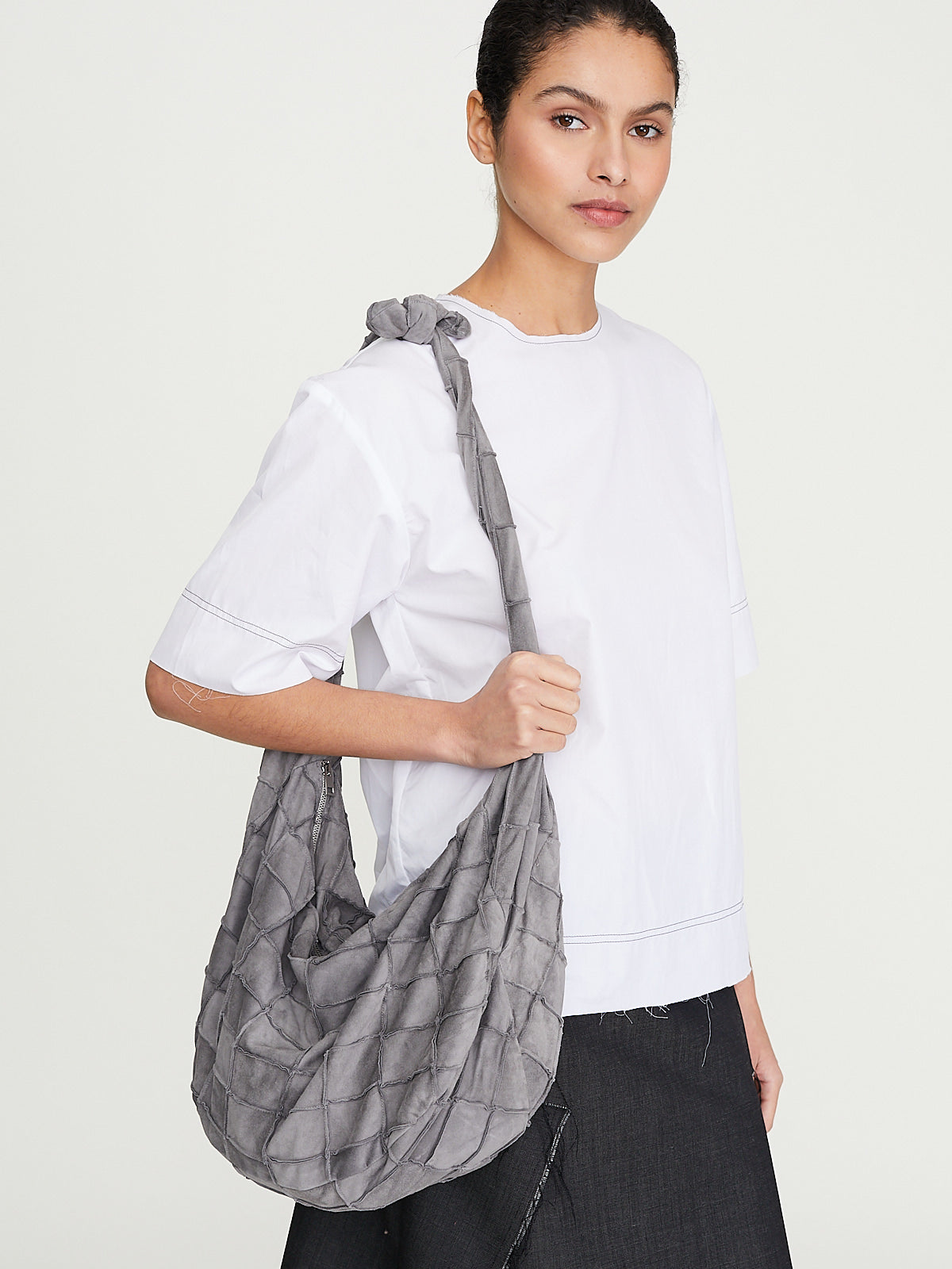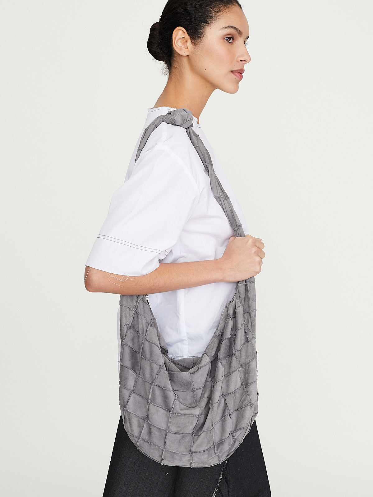 Hobo bag in grey suede lamb leather with a windowpane patchwork design. Zip fastening and an adjustable shoulder strap with a knot detail. Features an internal flat pocket. Lined in black satin.