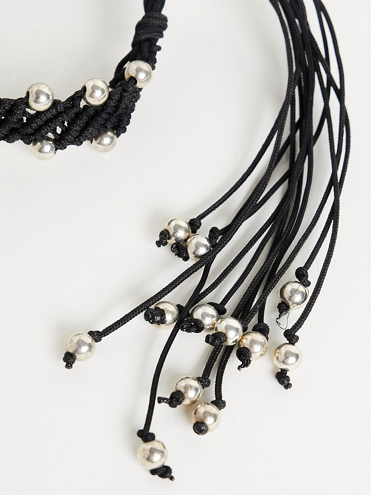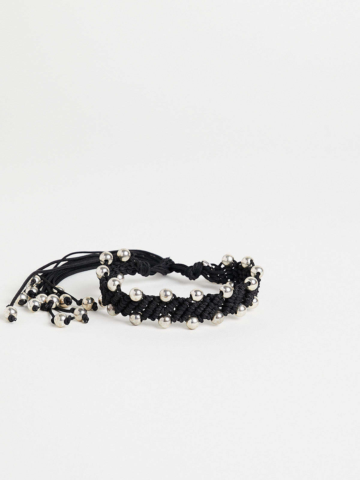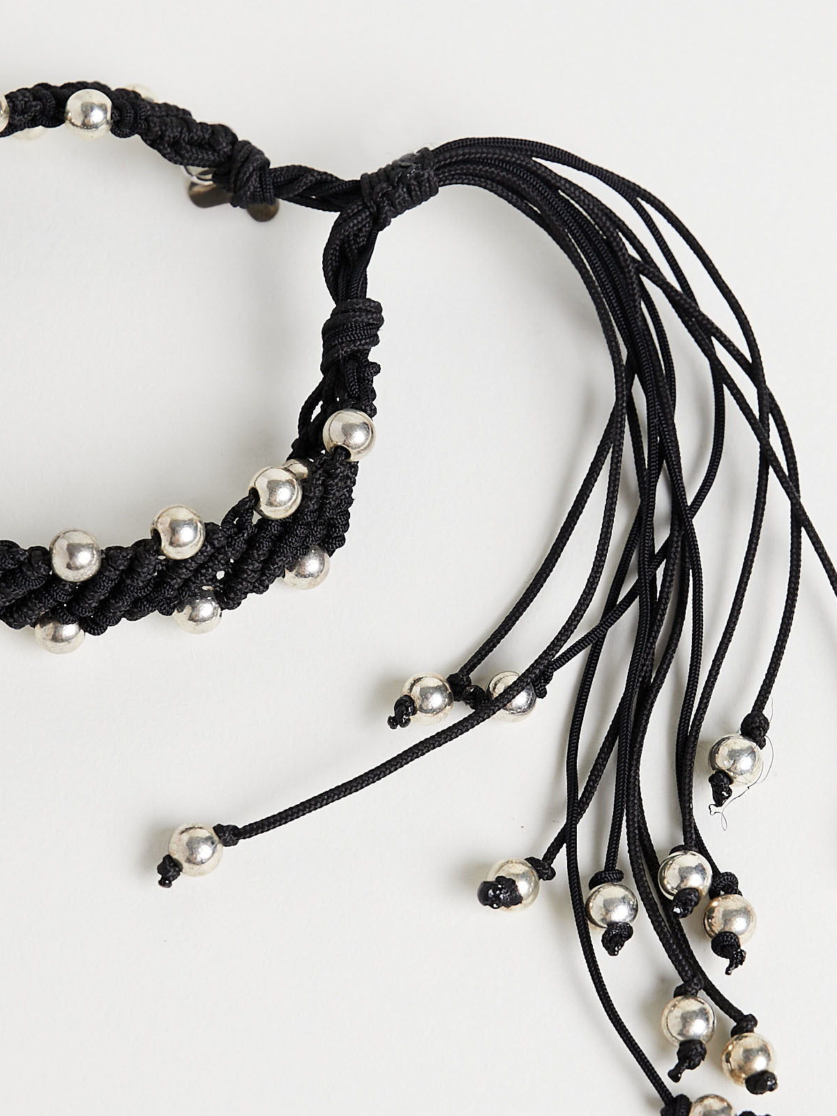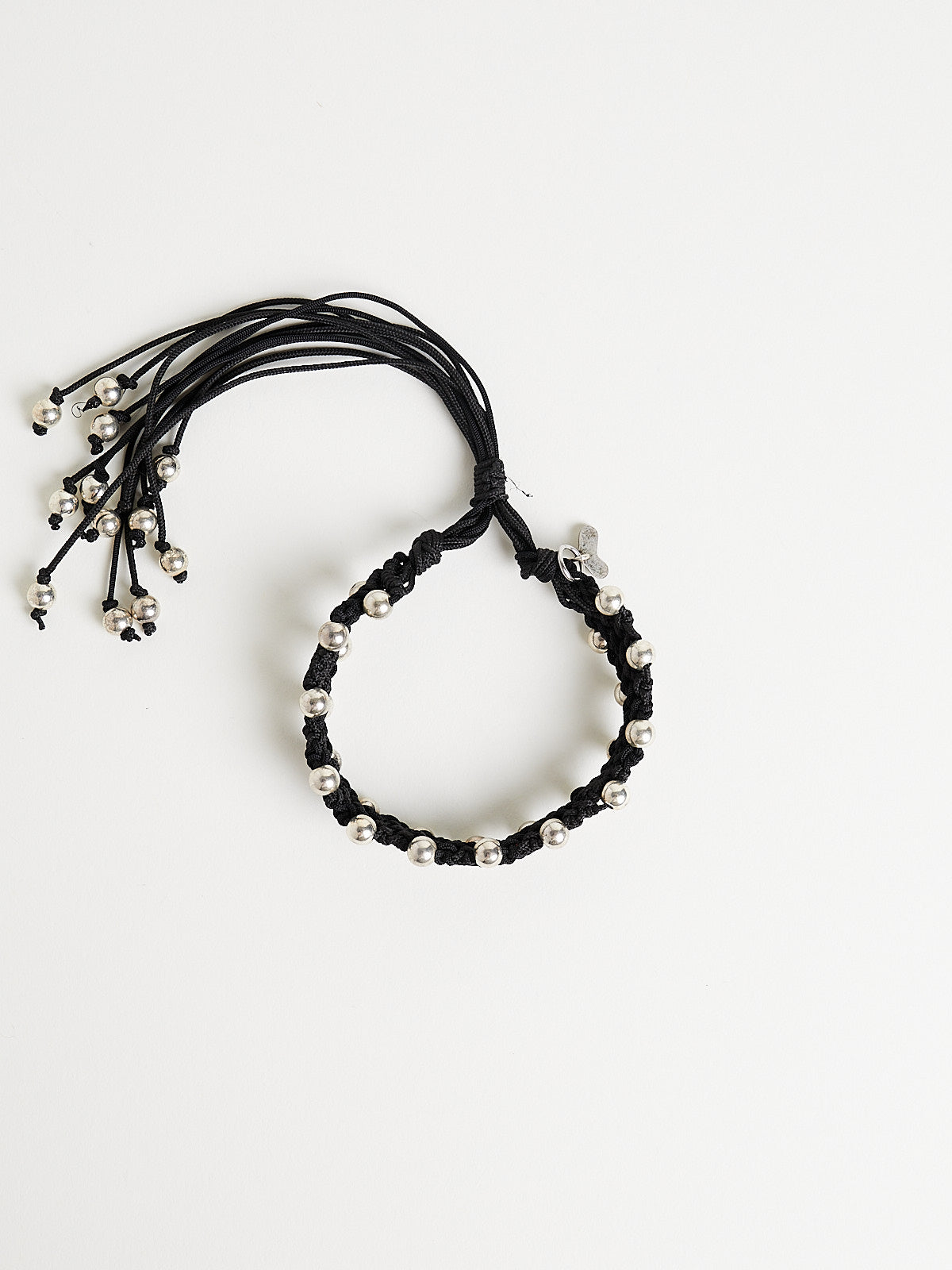 Bracelet made from black nylon cord encrusted with silver beads. Features a logo tag in sterling silver, an adjustable knot function and tassles at the end.