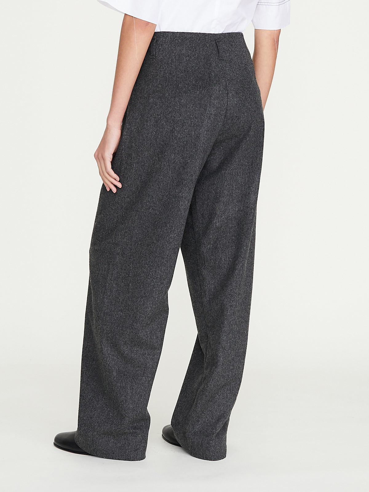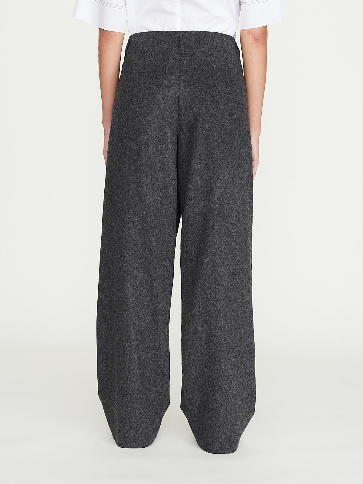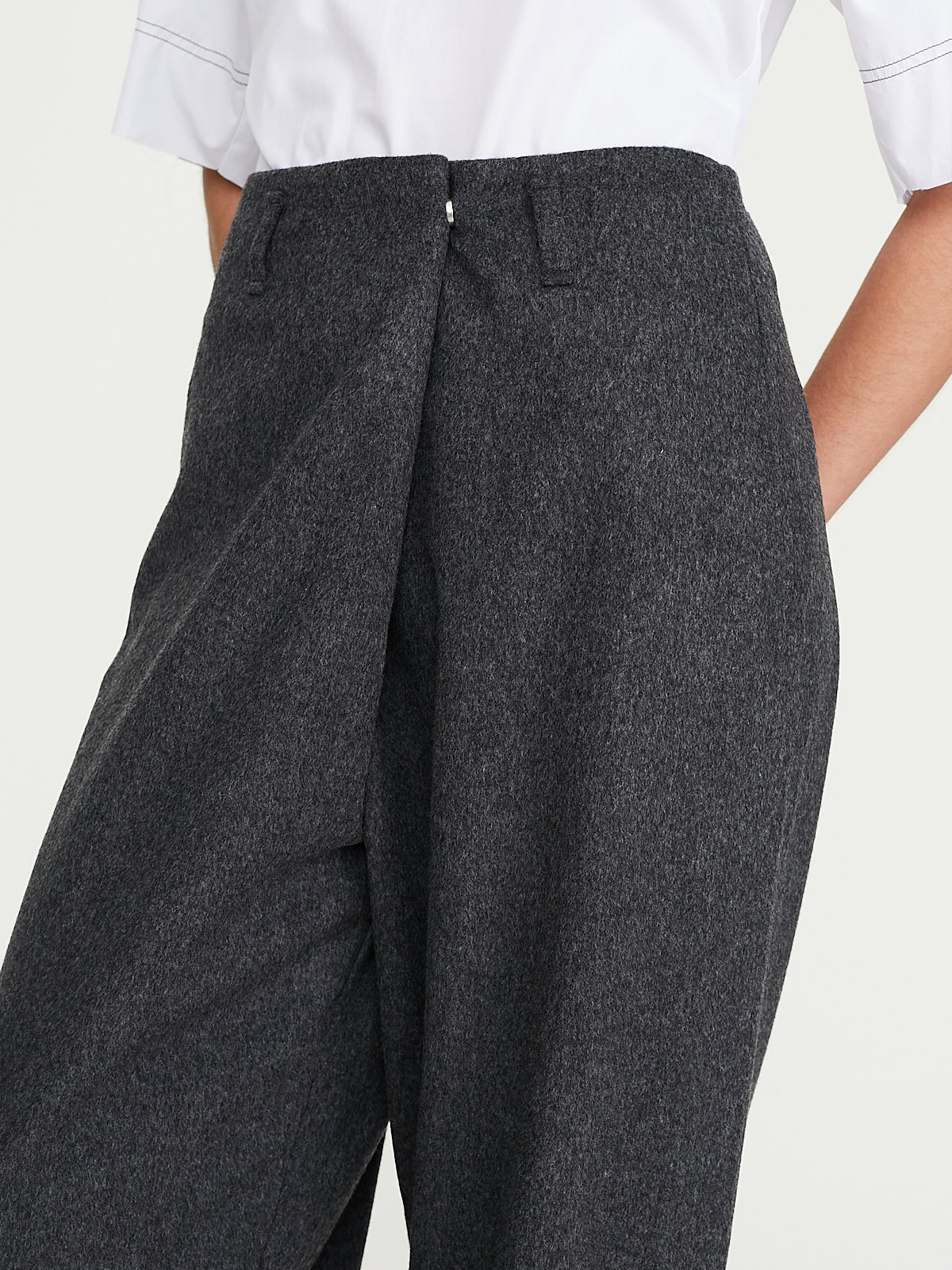 Oversized trouser in taupe virgin wool. Belt loops and a snap button fastening on the front that creates a large pleat detail. Wide straight legs.