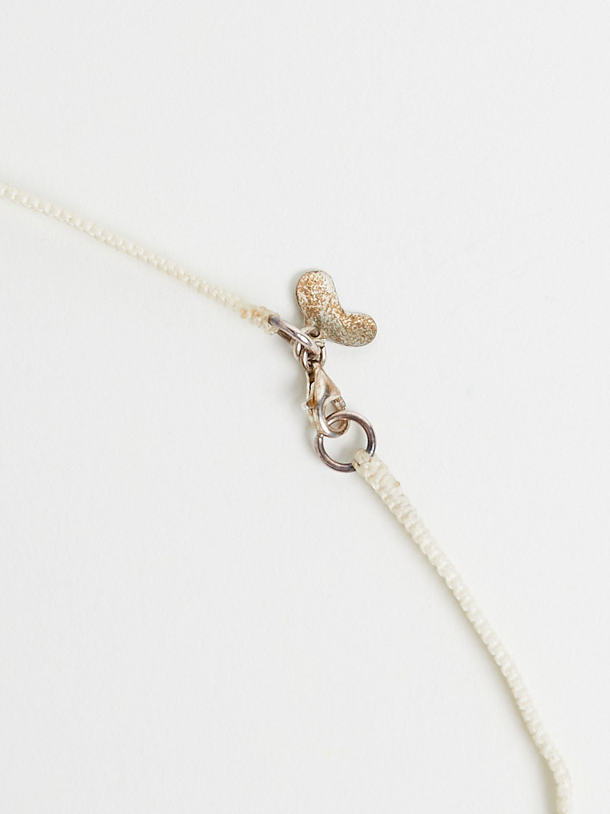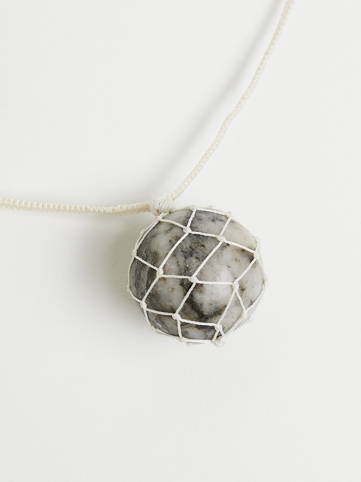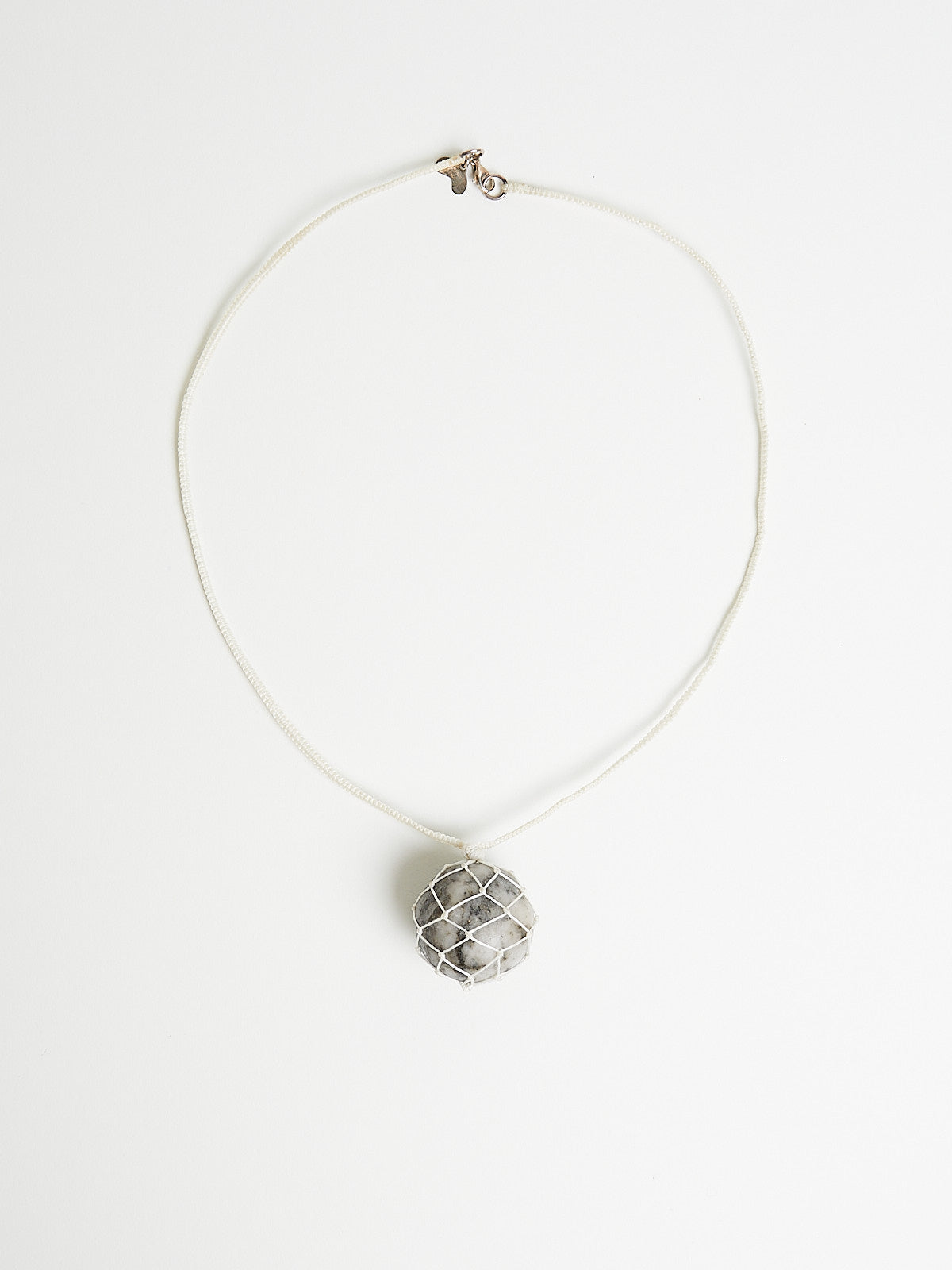 Necklace with a cream nylon cord and an alabaster sphere set in a net design. Features a lobster claw clasp and a logo tag in oxidised sterling silver.