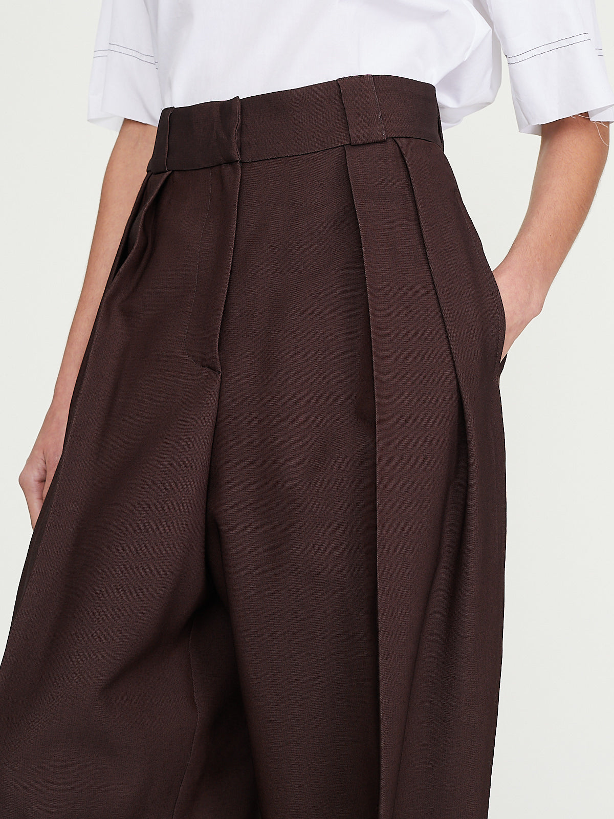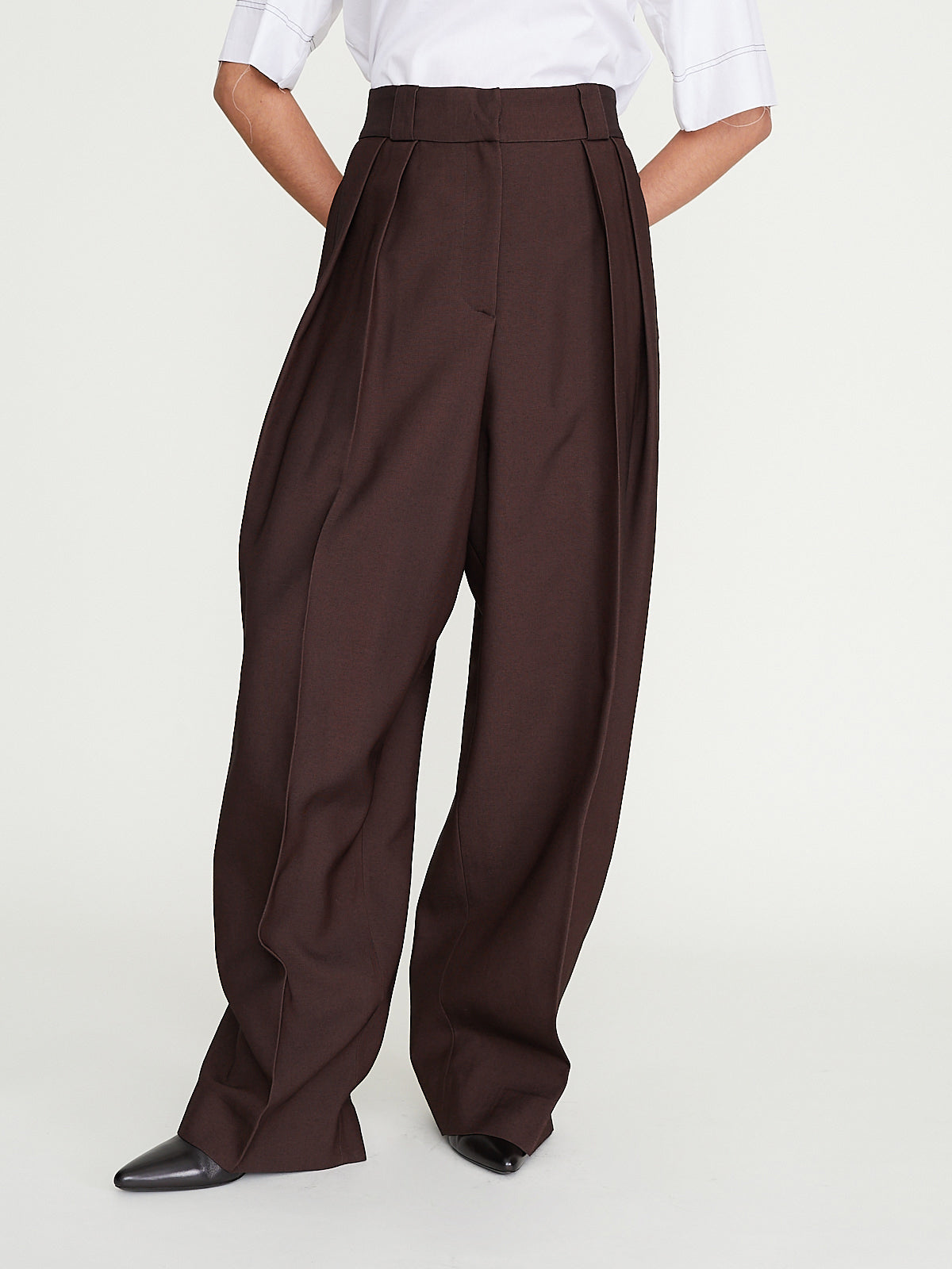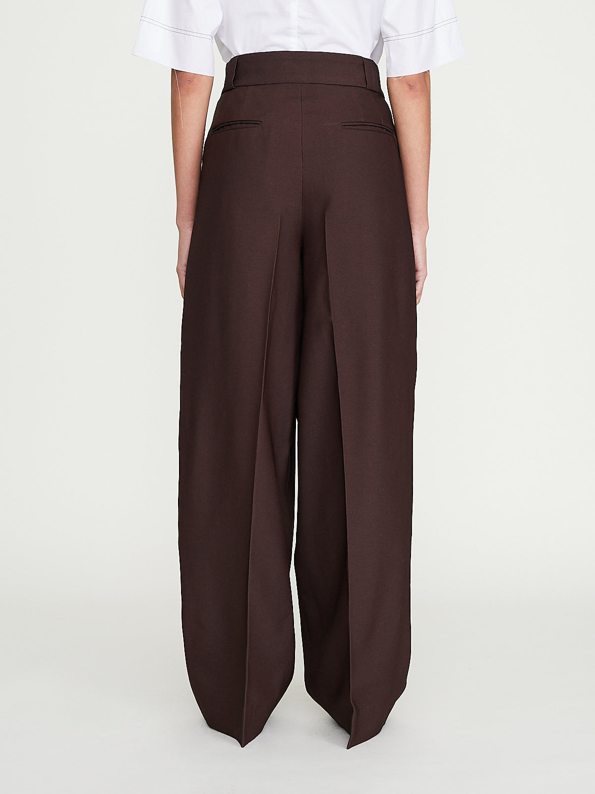 Oversized tailored trouser in brown virgin wool. High waist, belt loops and a concealed zip fastening. Pleated front and a traveller's crease on the front and back of the legs. Side seam pockets and welted pockets on the back. Fully lined.