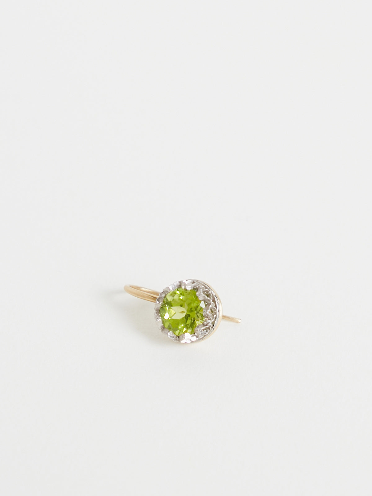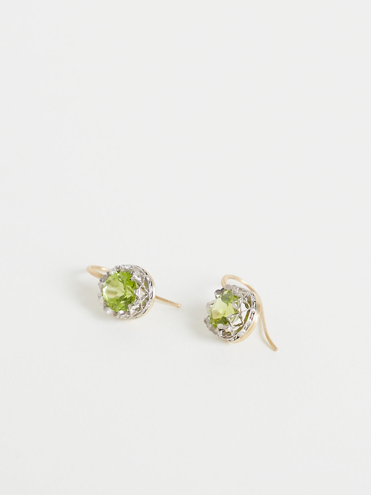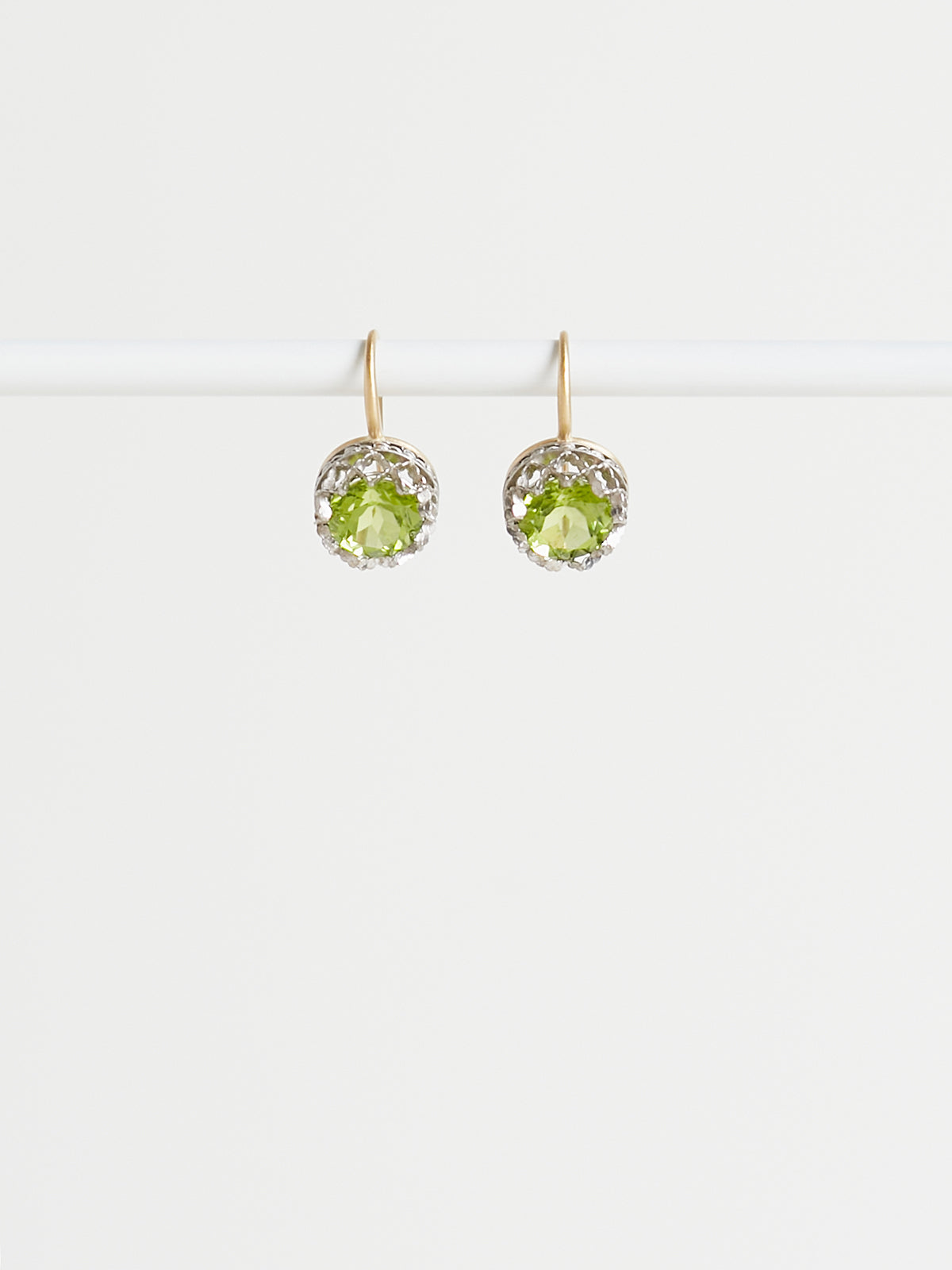 Earrings in 18k yellow gold with round faceted peridots. Features an ornamental platinum lace-like detail around the stone. The platinum detail is created by manipulating the finest platinum strands, by hand, to create delicate, intricate patterns. Ear wire backing.