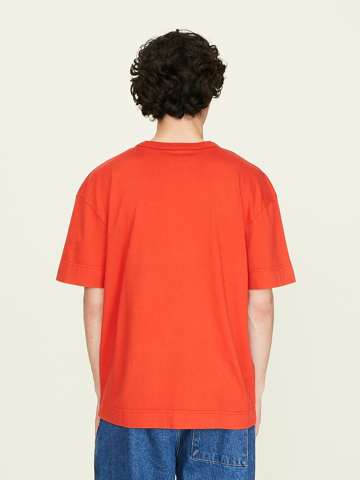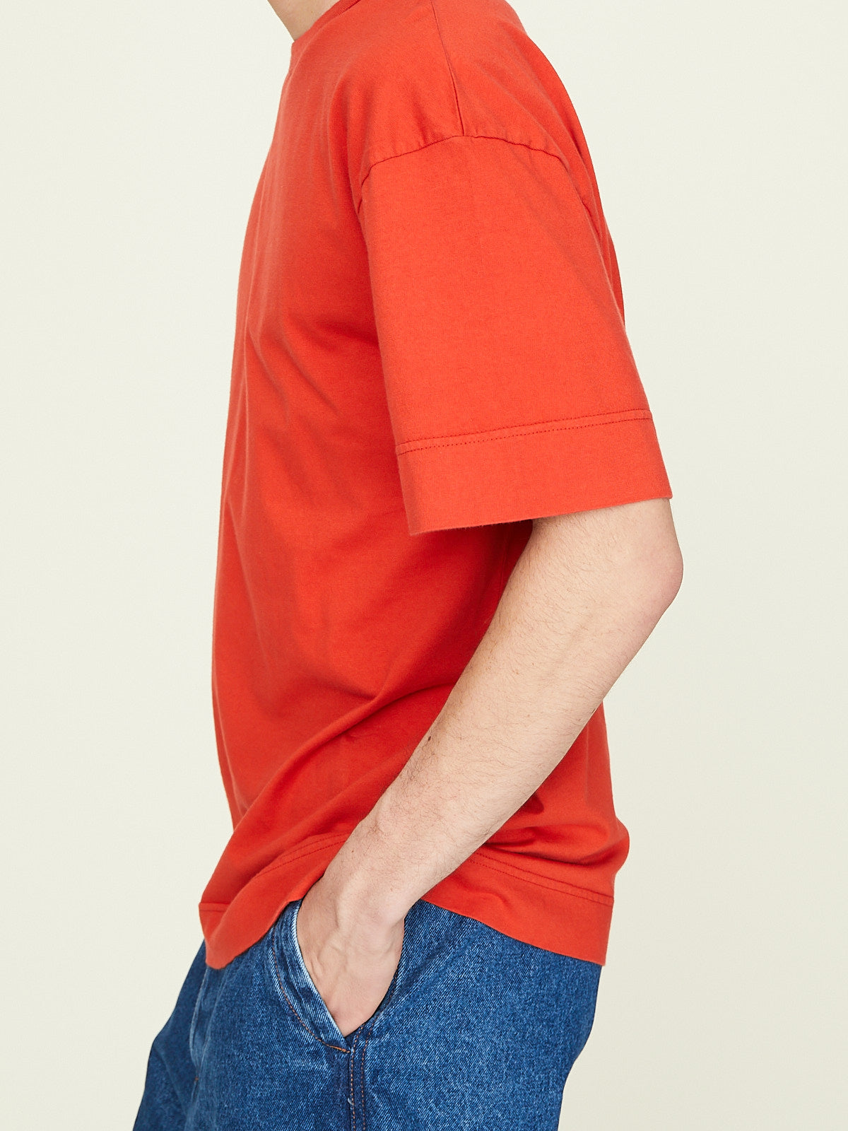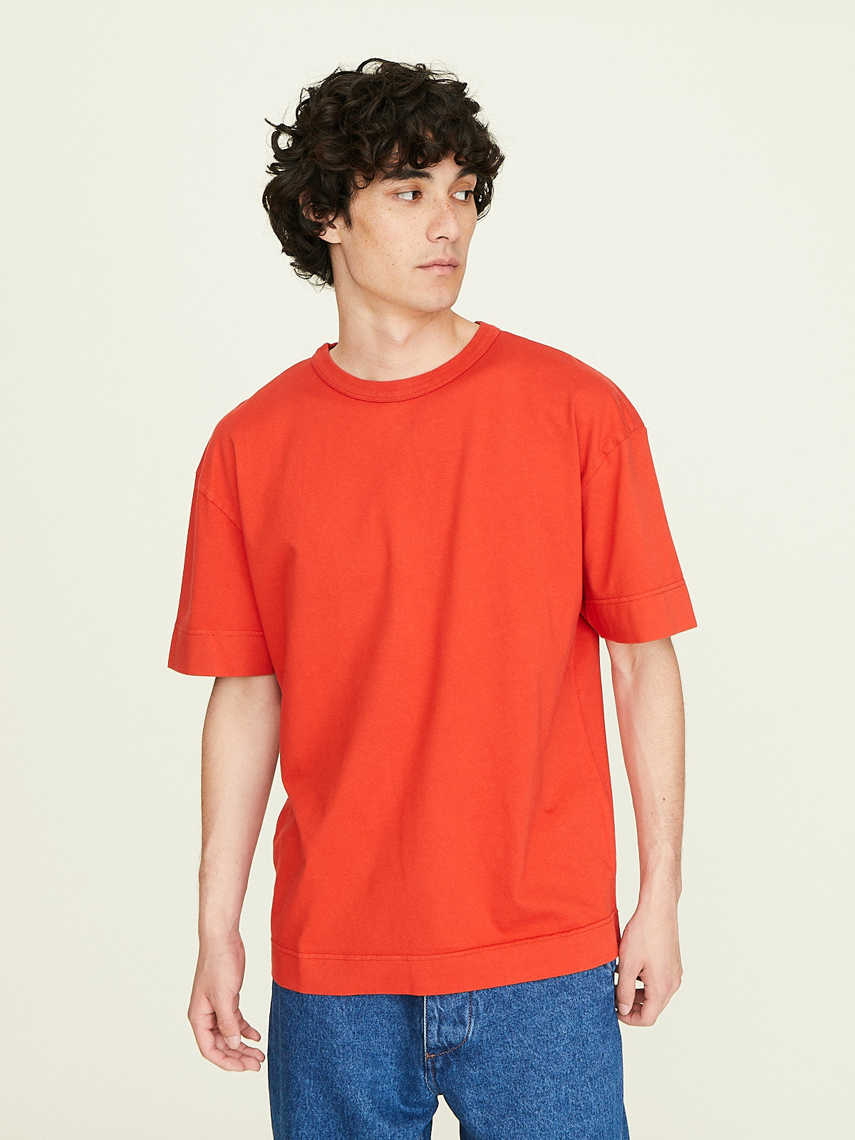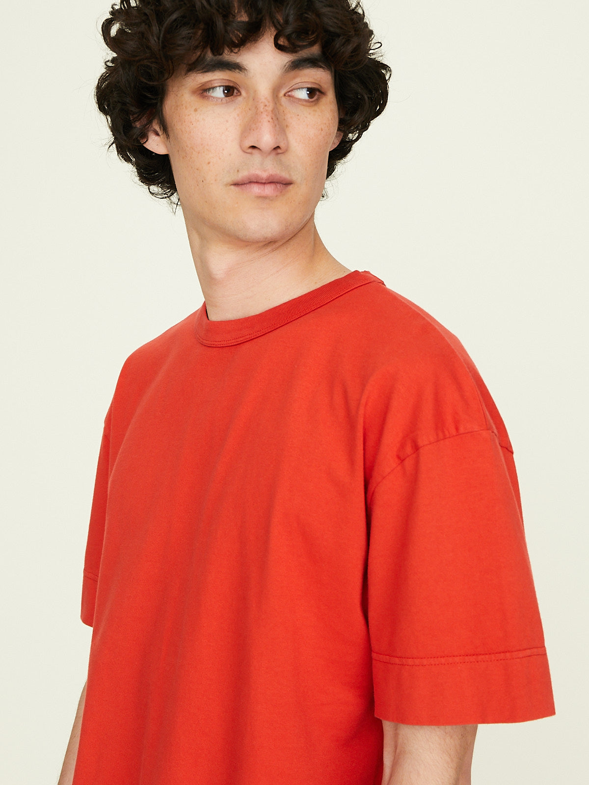 Oversized t-shirt in garment-dyed red organic cotton jersey. Crewneck and short sleeves with a dropped shoulder.