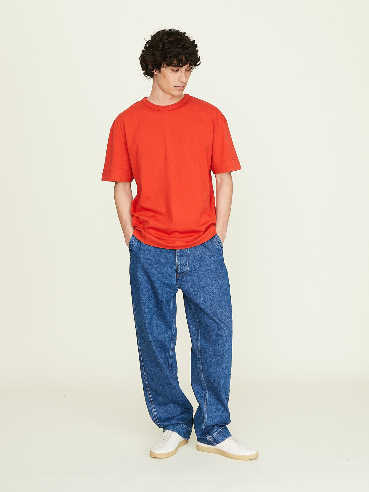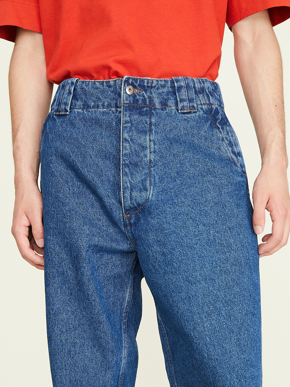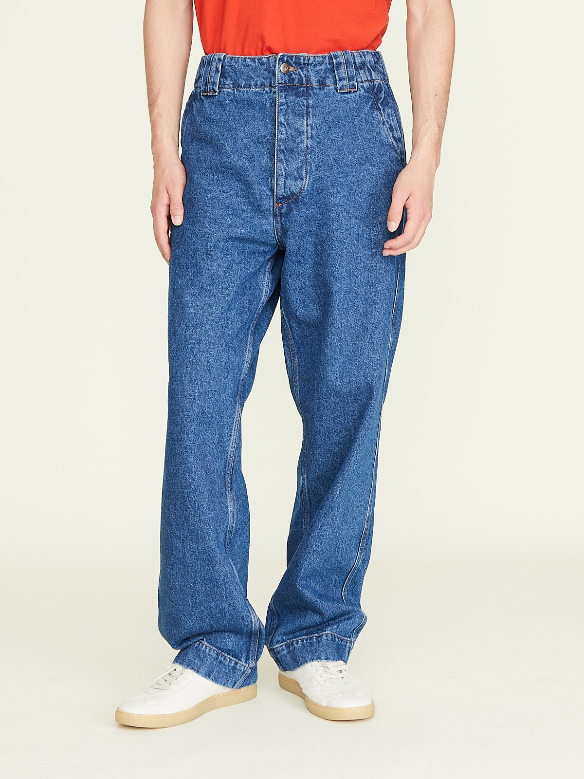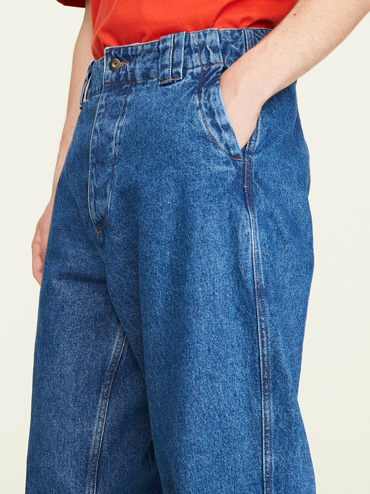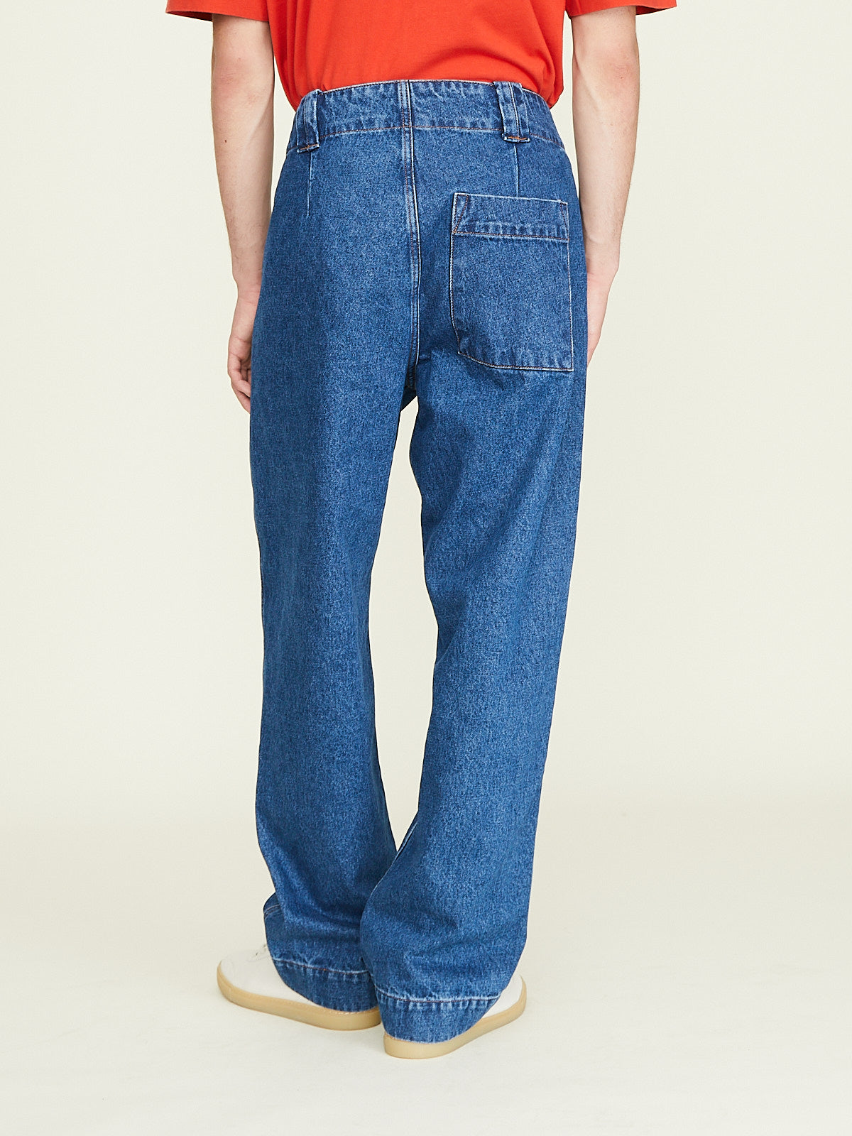 Oversized workwear-inspired pants in blue cotton denim with a stonewash finish. Button fly, belt loops and slash pockets on the front. One patch pocket on the back. Wide legs.