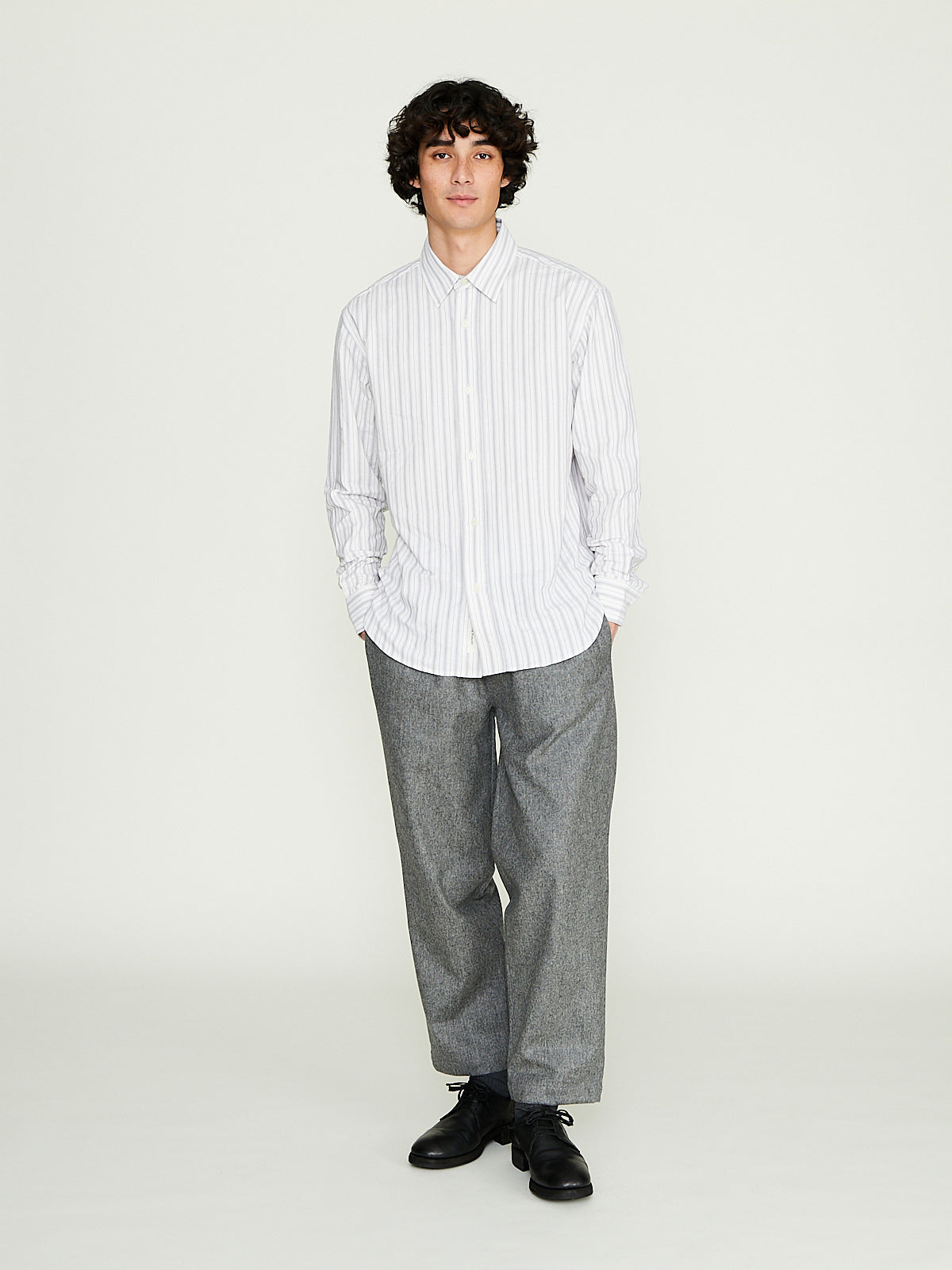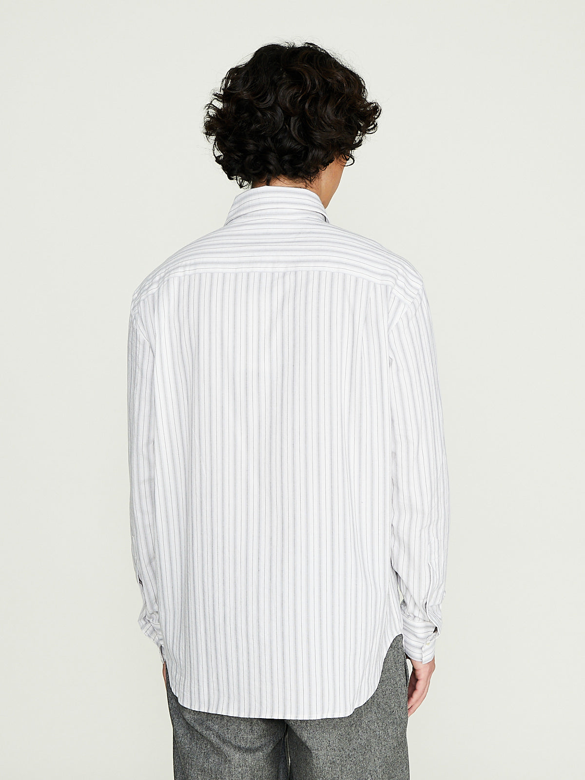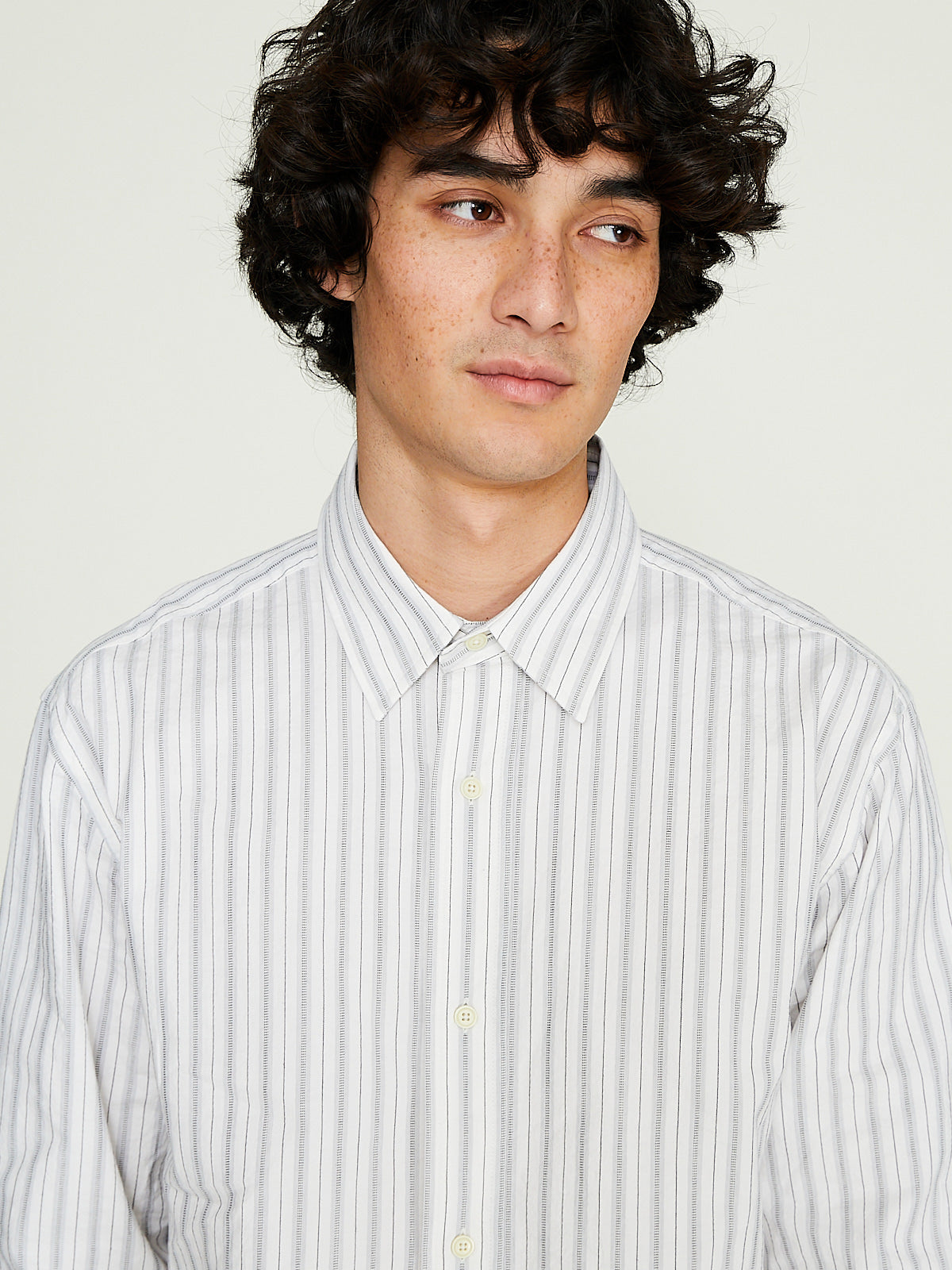 Casual shirt in striped off white/grey French organic cotton poplin. Pointed collar, front button fastening and long sleeves with buttoned cuffs. Features a back yoke and a curved hemline. Regular fit.