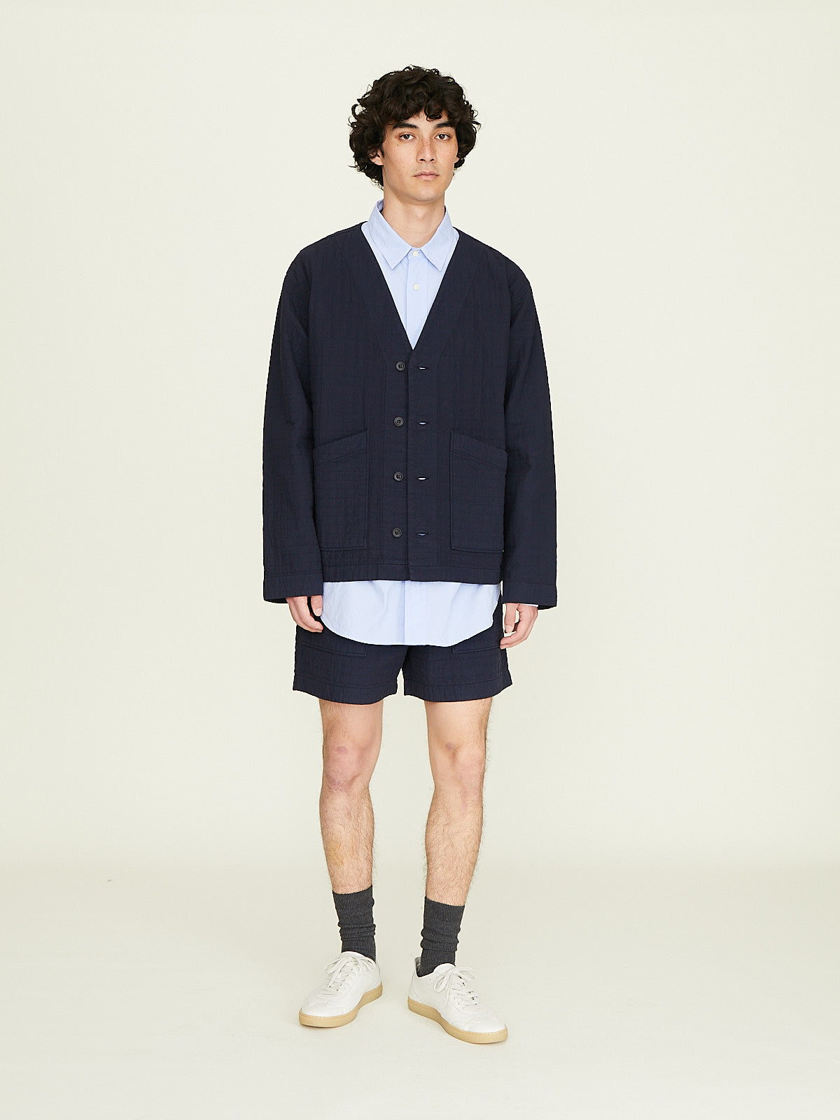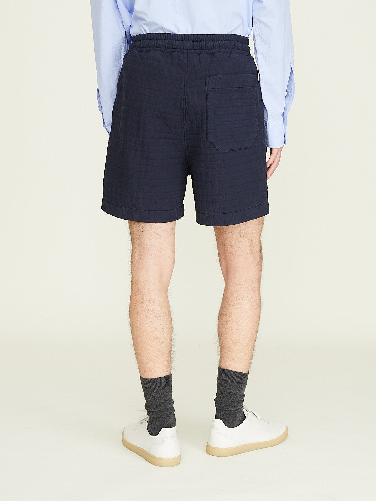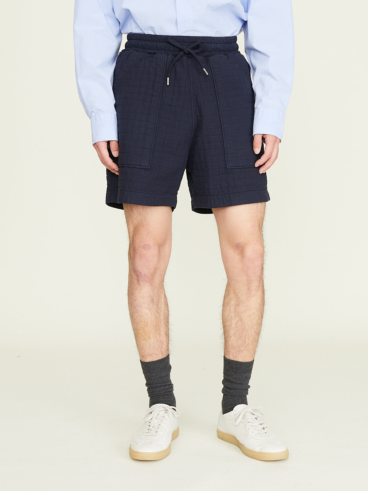 Oversized sport-style shorts in heavy textured navy cotton. Elasticated waistband with an adjustable drawstring and large patch pockets on the front. Single patch pocket on the back.