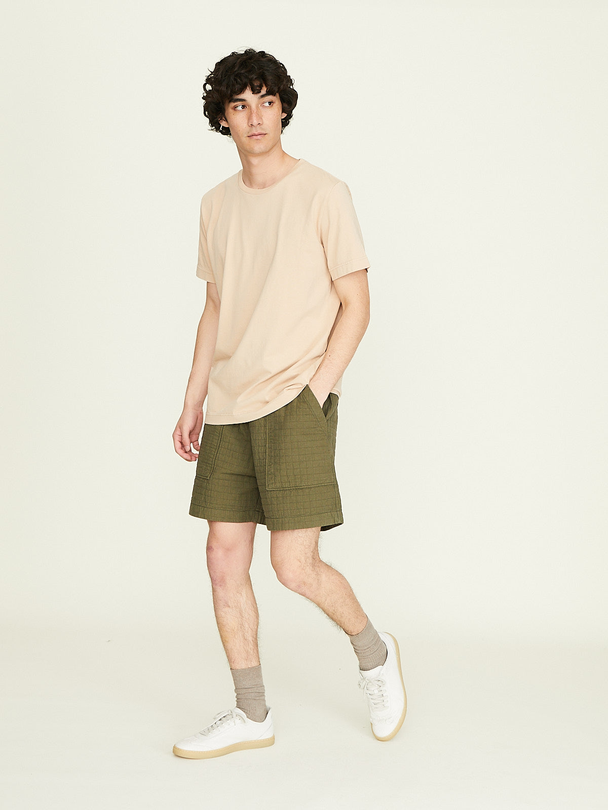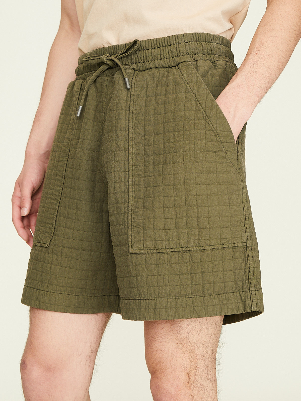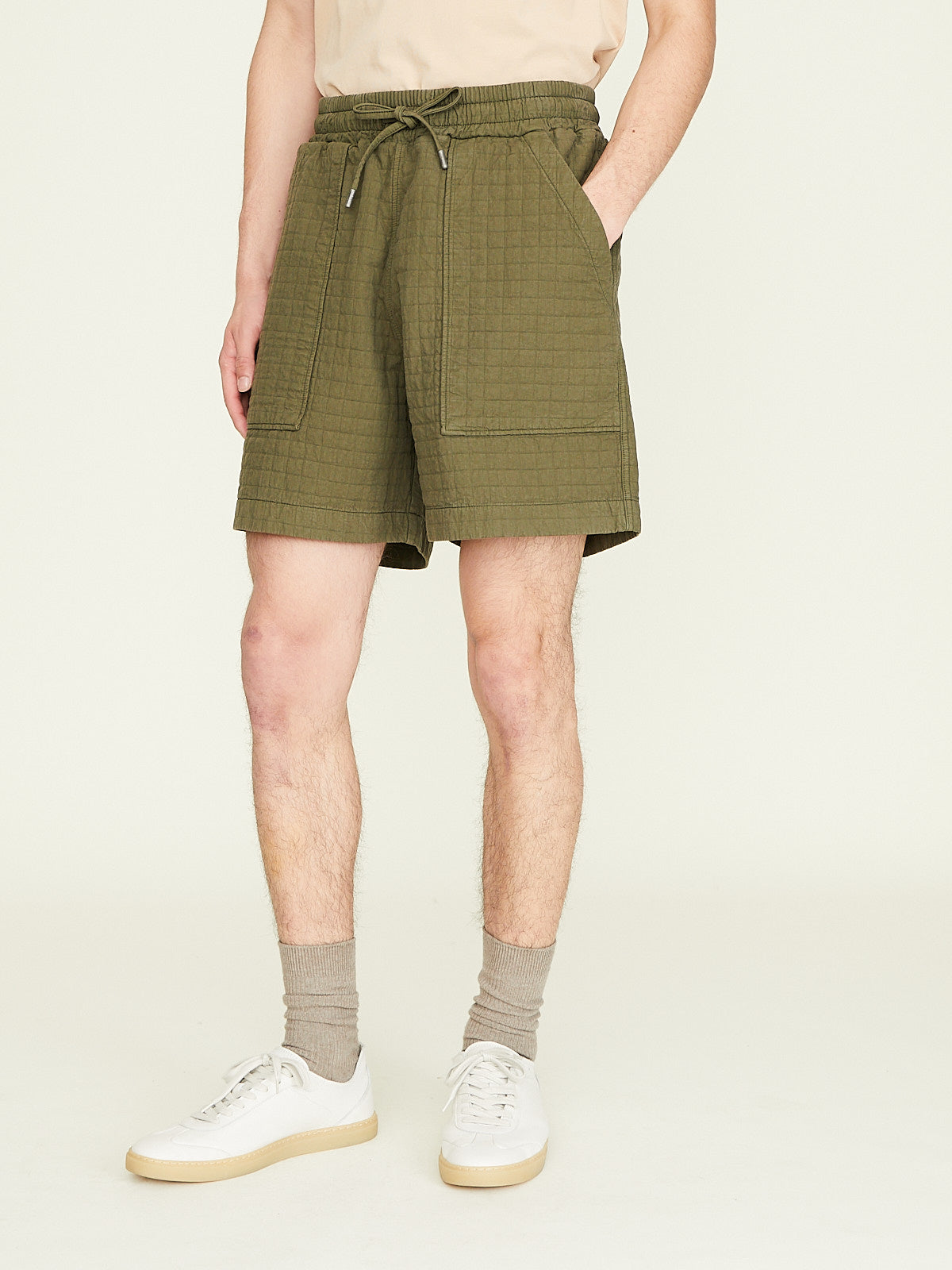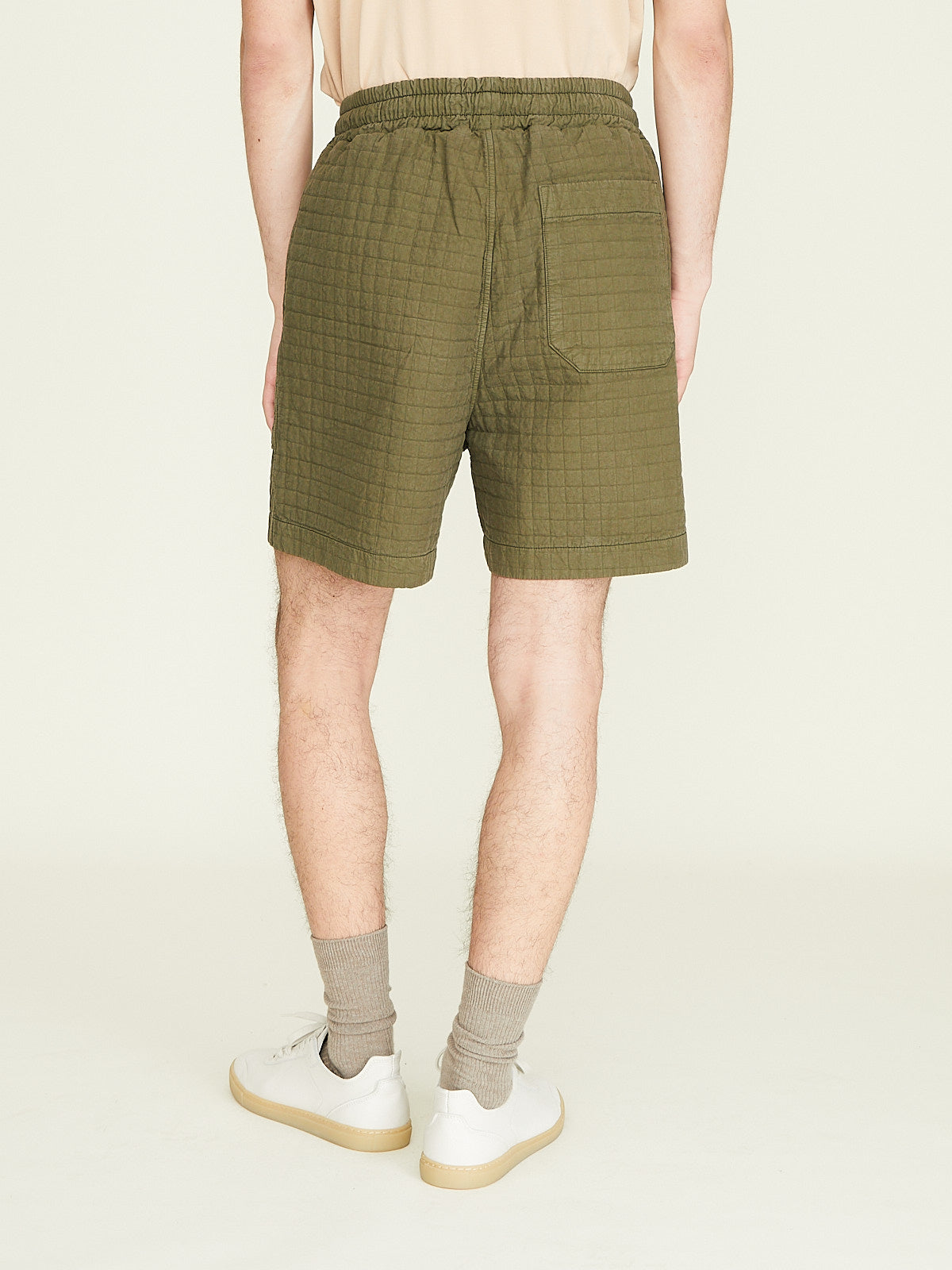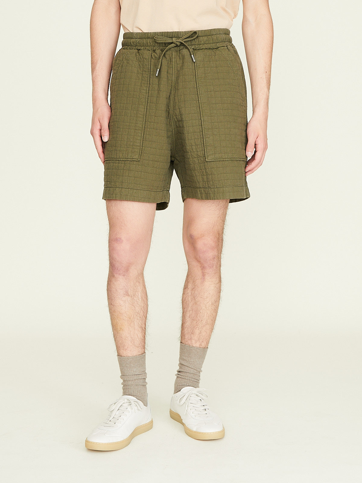 Oversized sport-style shorts in heavy textured olive cotton. Elasticated waistband with an adjustable drawstring and large patch pockets on the front. Single patch pocket on the back.