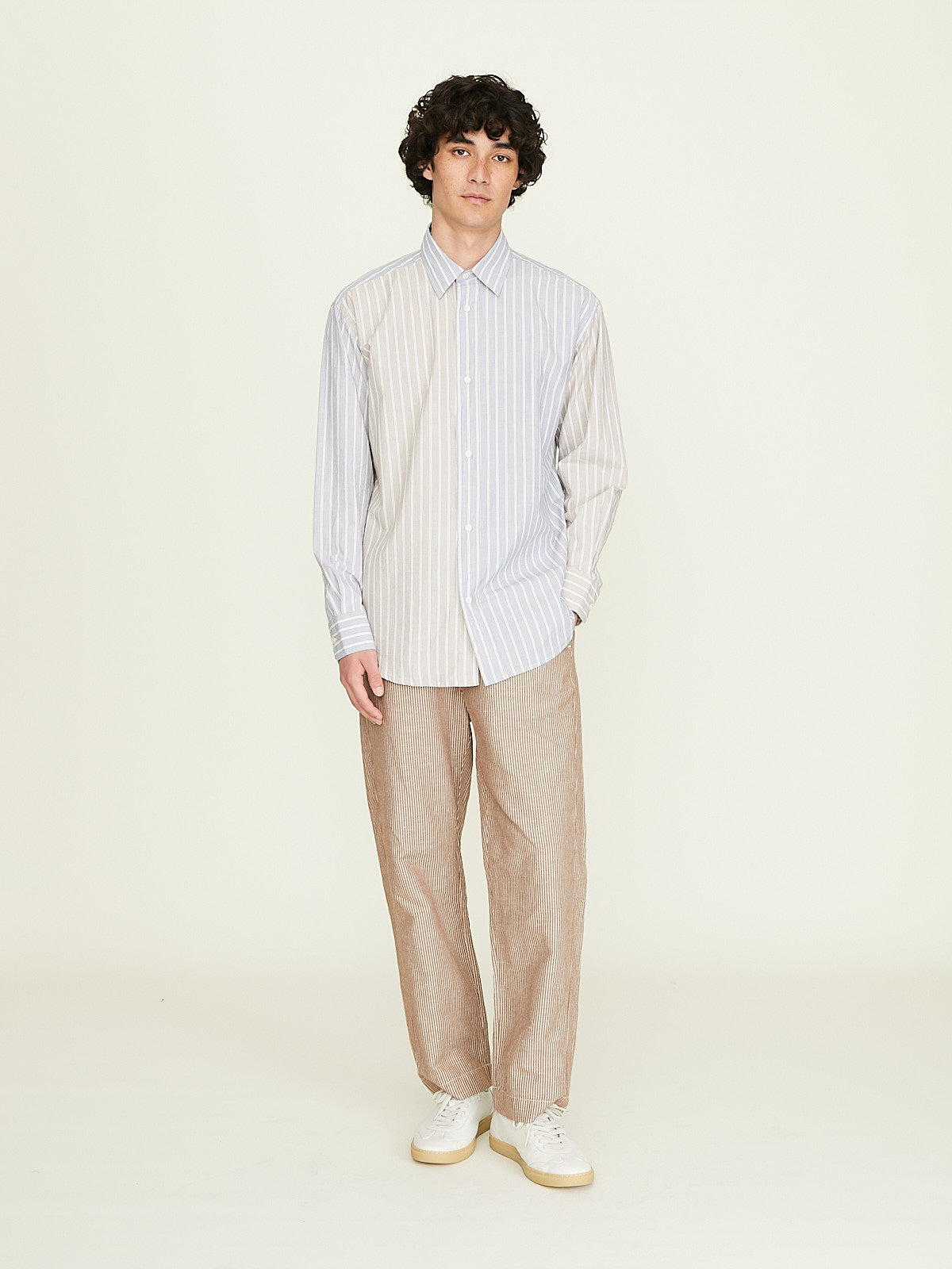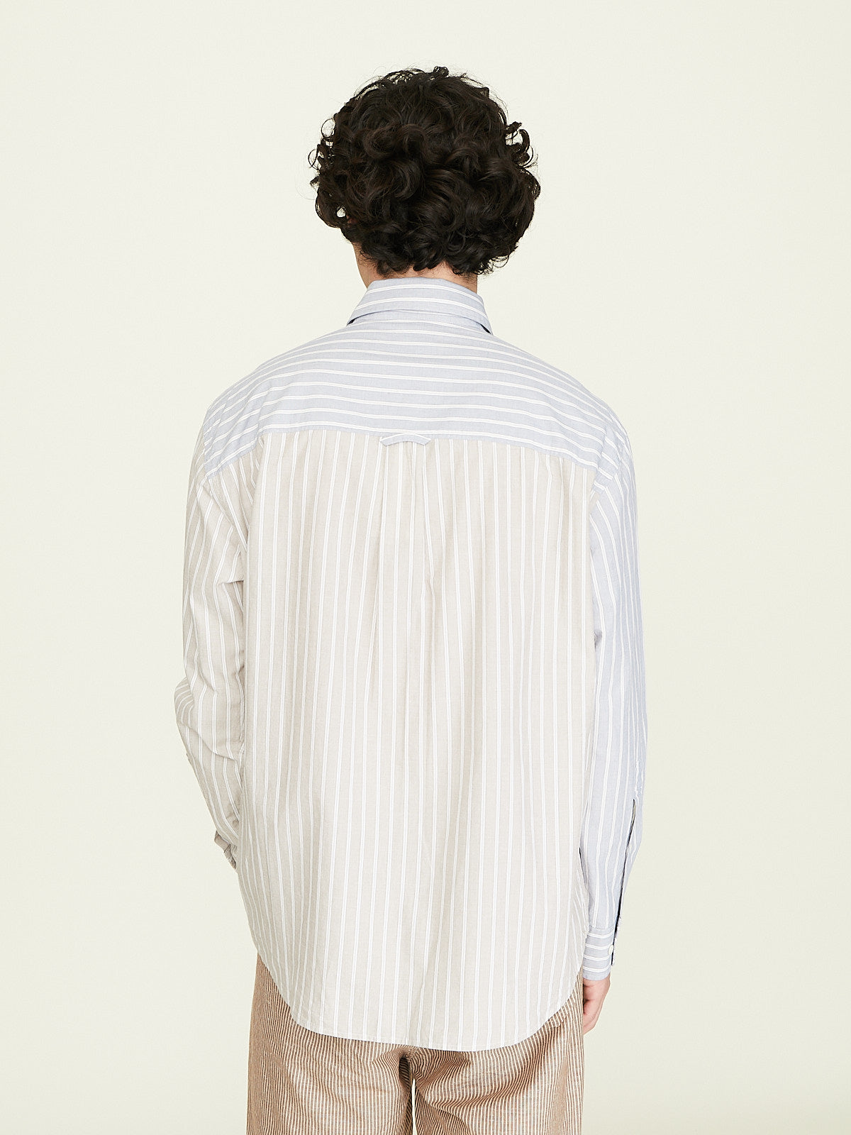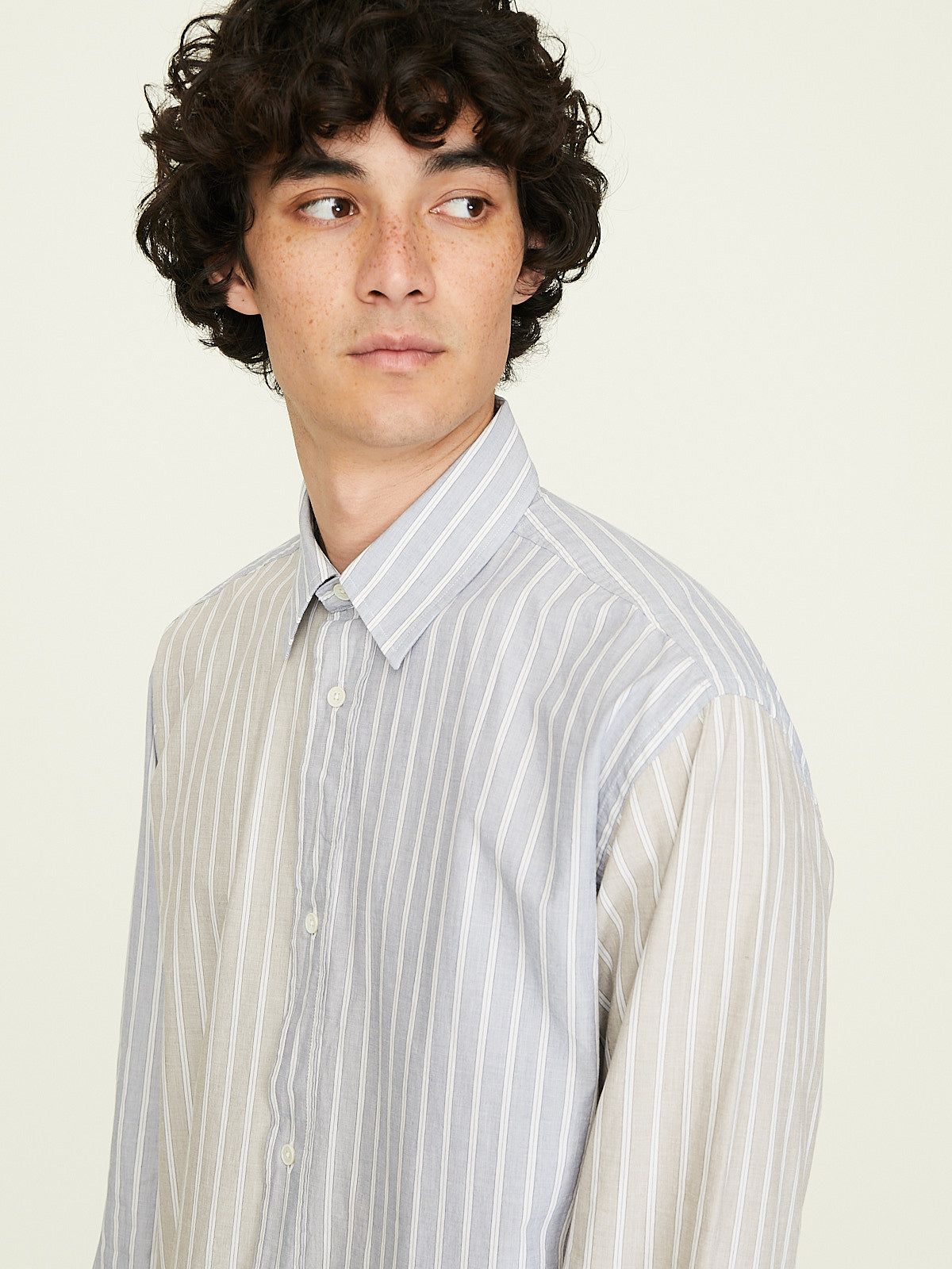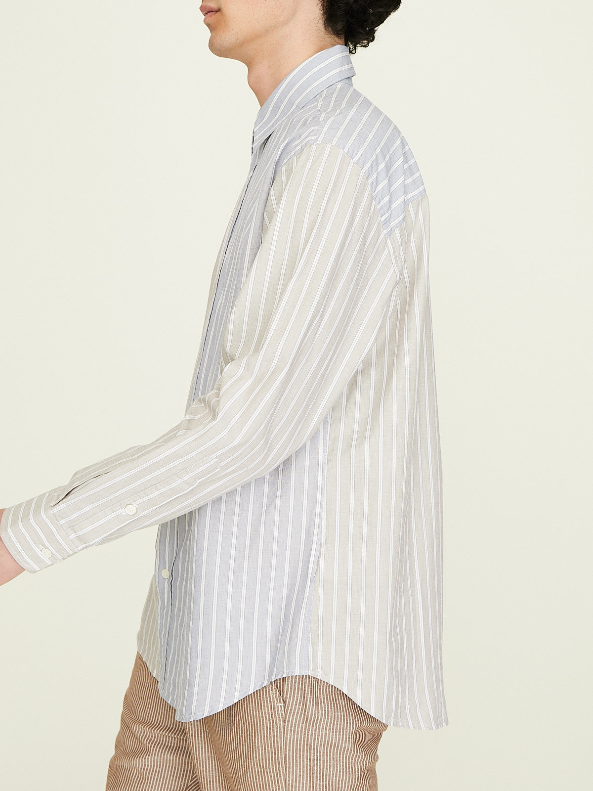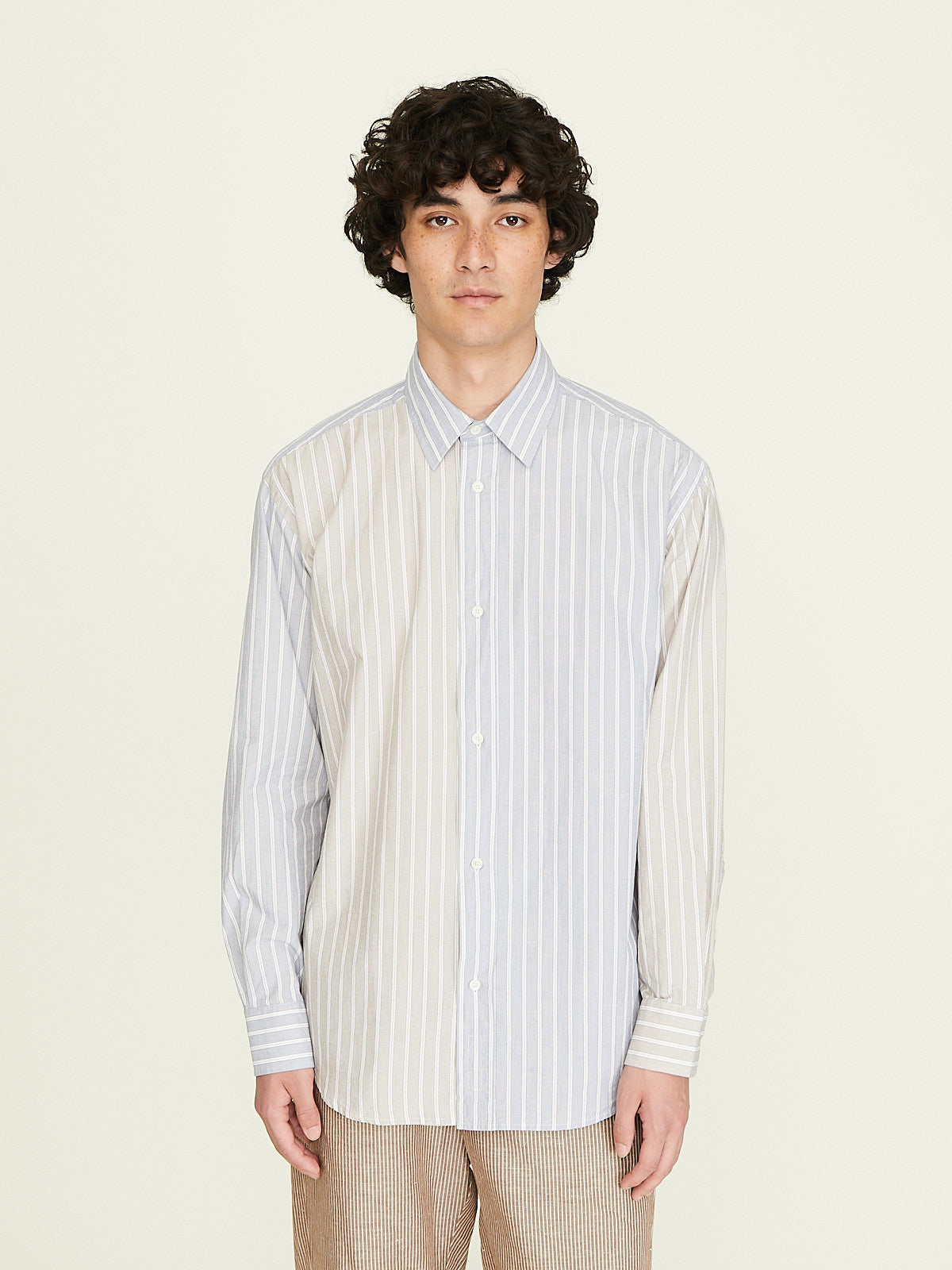 Oversized classic shirt in beige and blue striped light cotton poplin with a mismatch design. Shirt collar, font button fastening and long sleeves with buttoned cuffs. Features a back yoke with a pleat detail. Curved hemline with side slits.