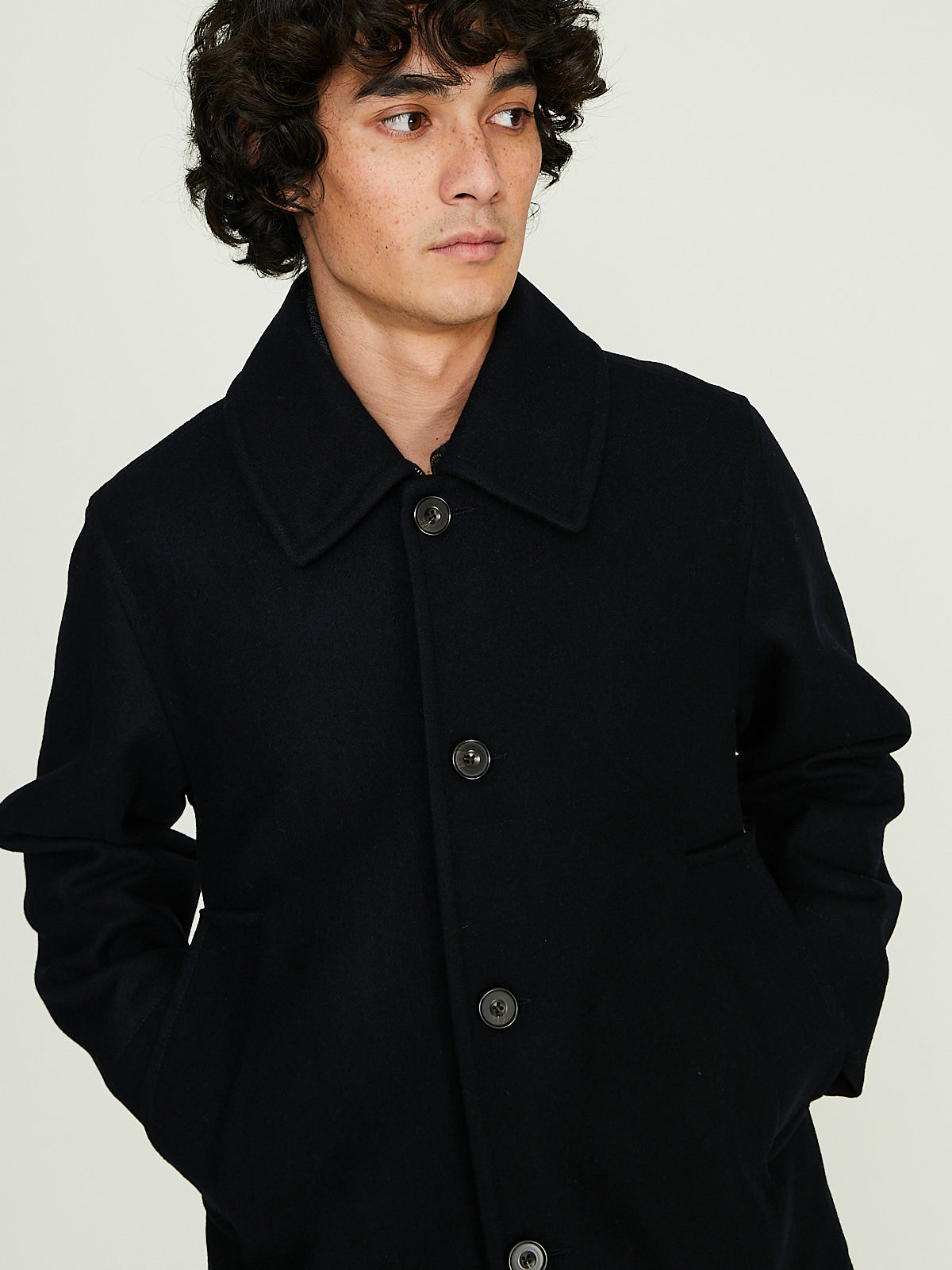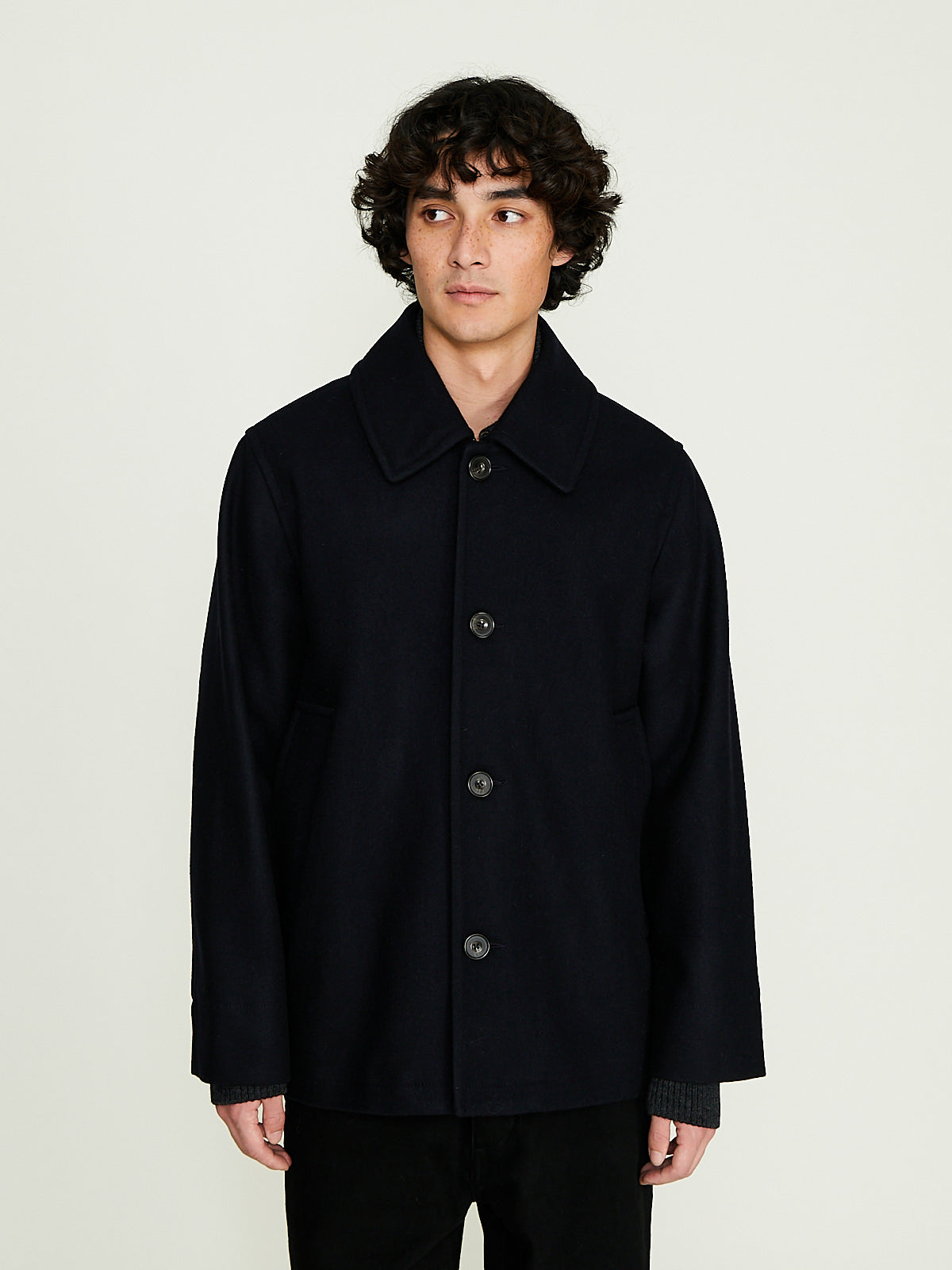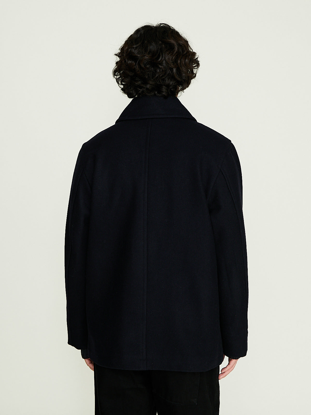 Peacoat-inspired jacket in thick navy wool. Pointed collar and a front button fastening. Welted pockets on the front and an internal pocket. Fully lined in cotton. Straight cut.