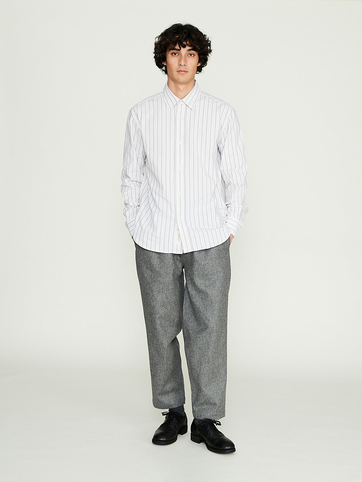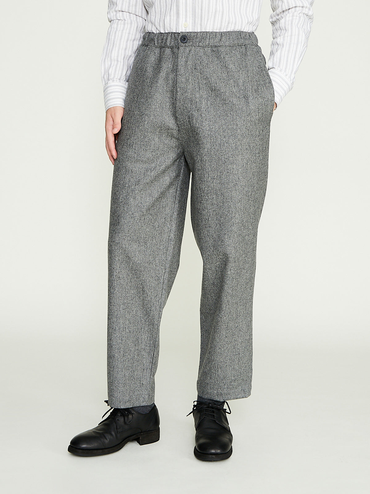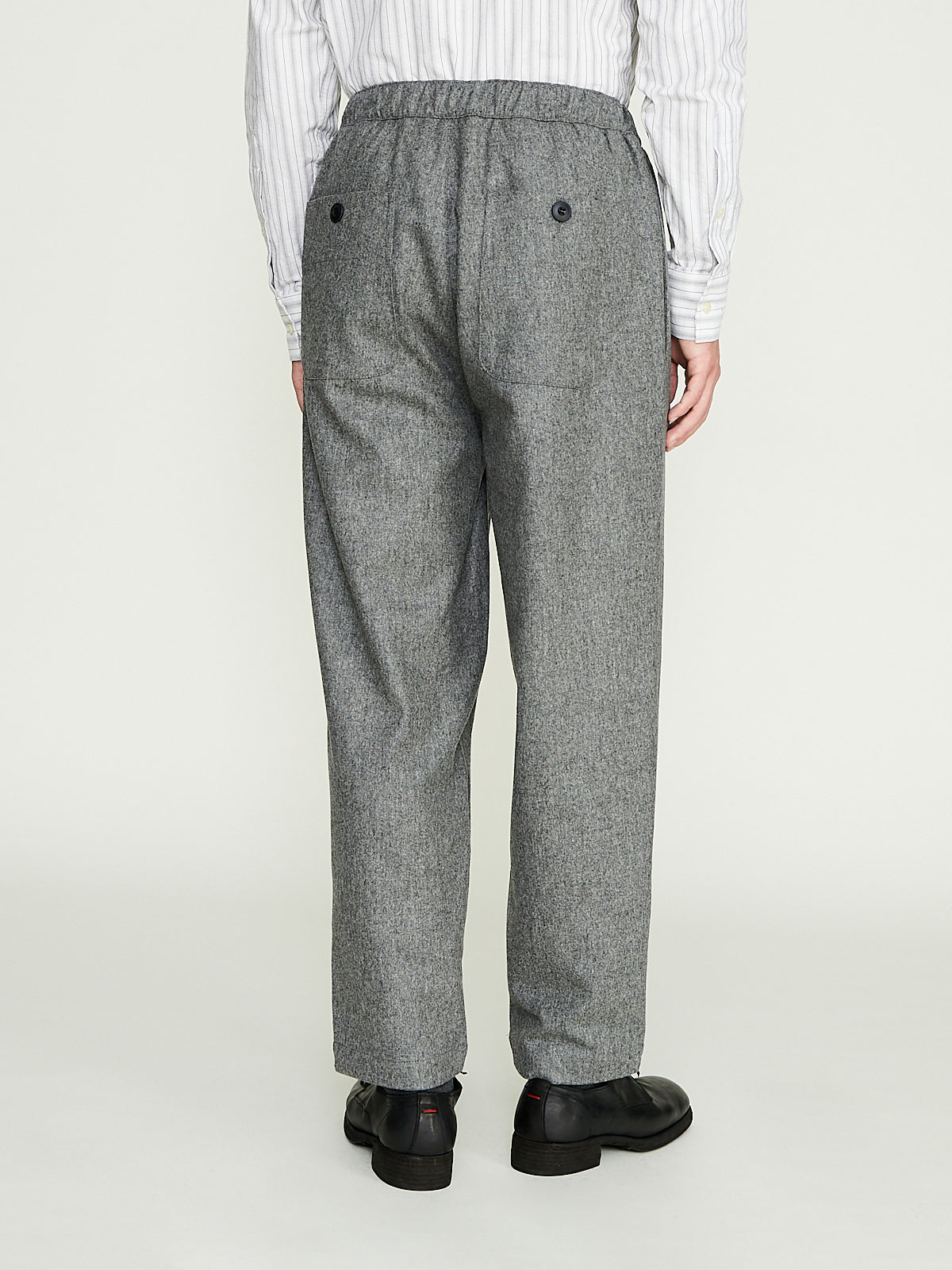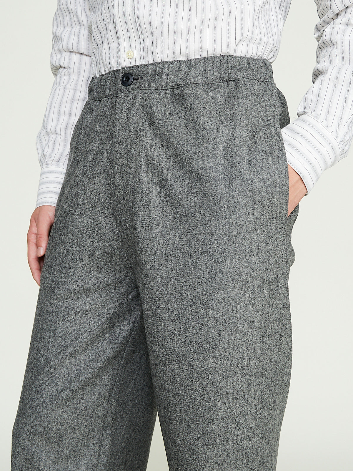 Wide leg trouser in light grey wool melange flannel. Singe button fastening, zip fly and with an elasticated waistband. Side seam pockets and buttoned patch pockets on the back.