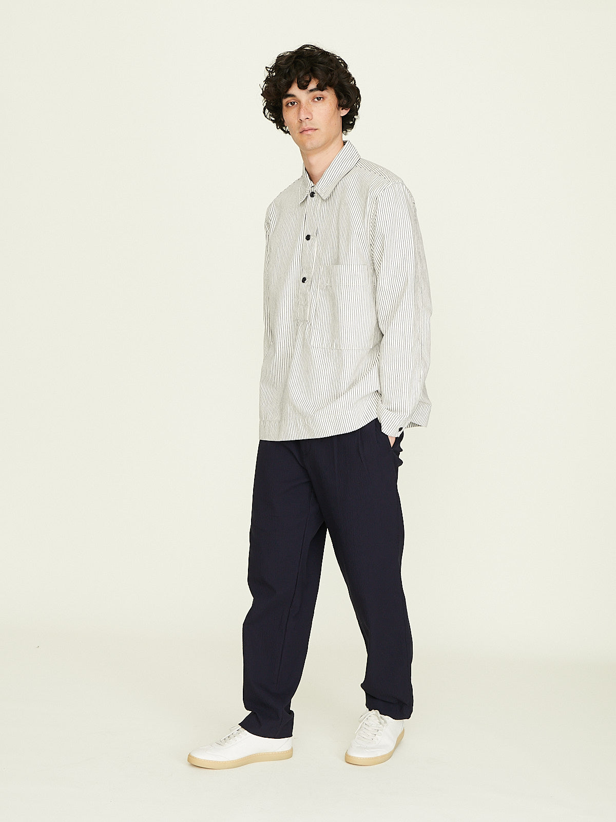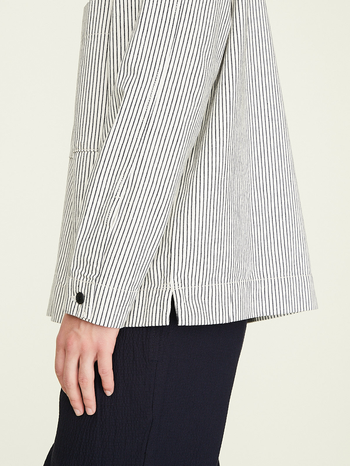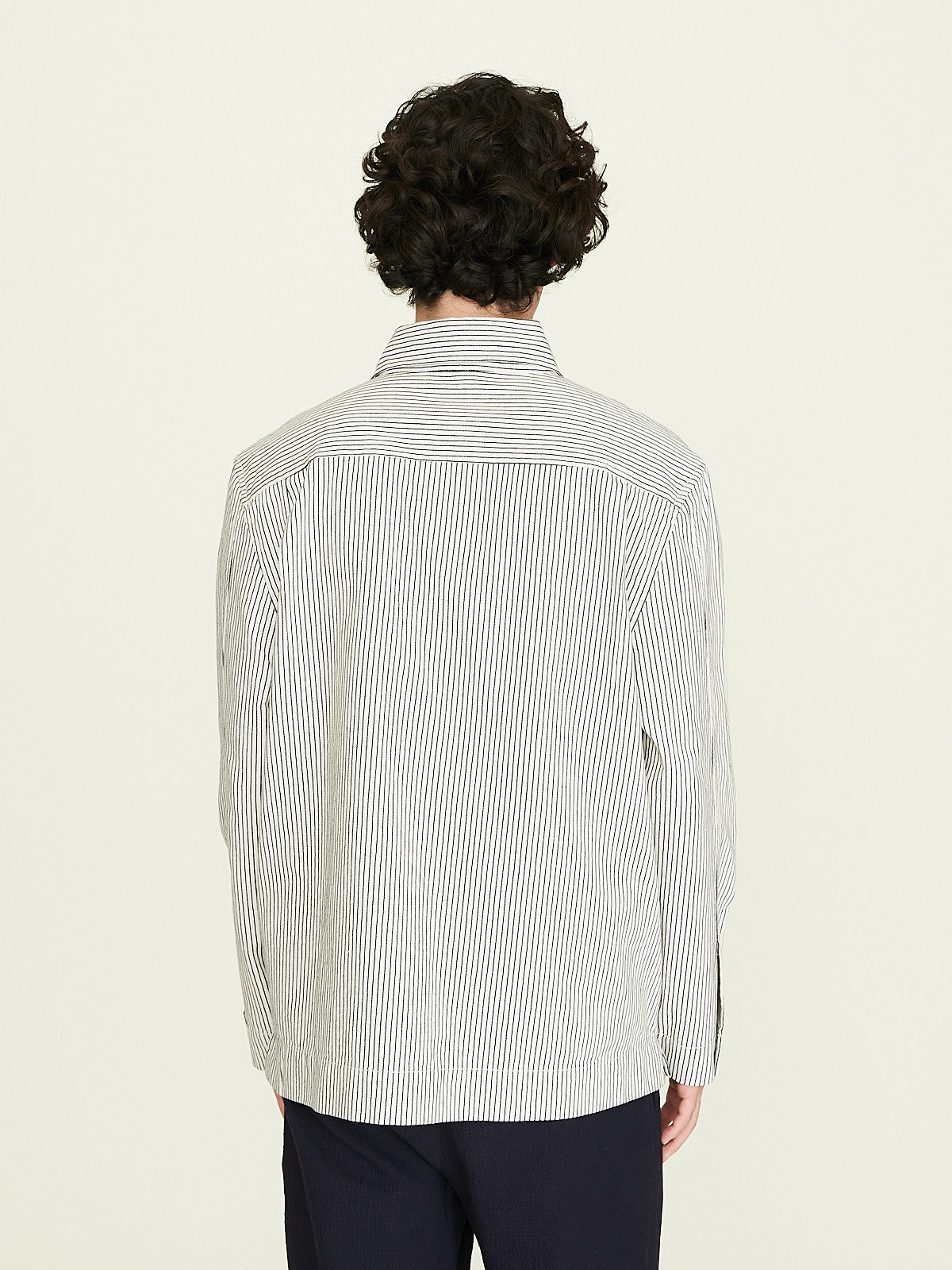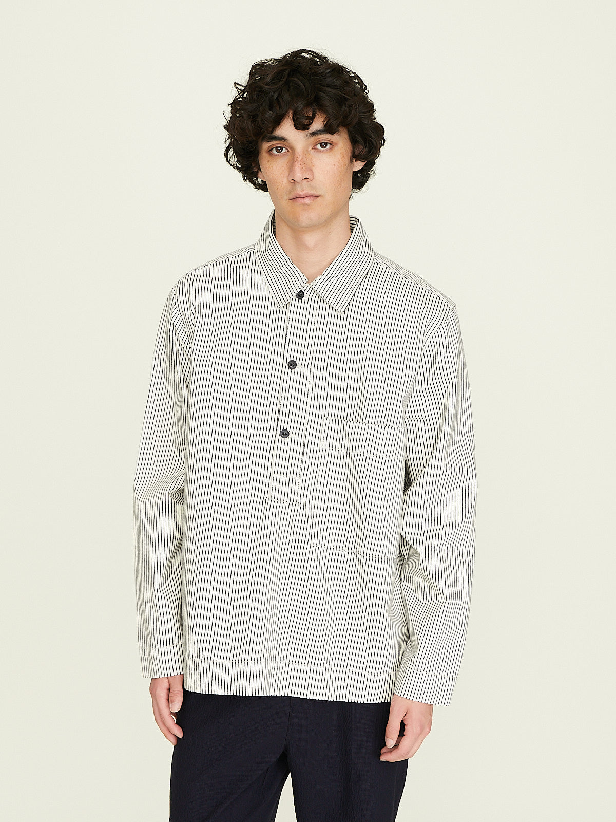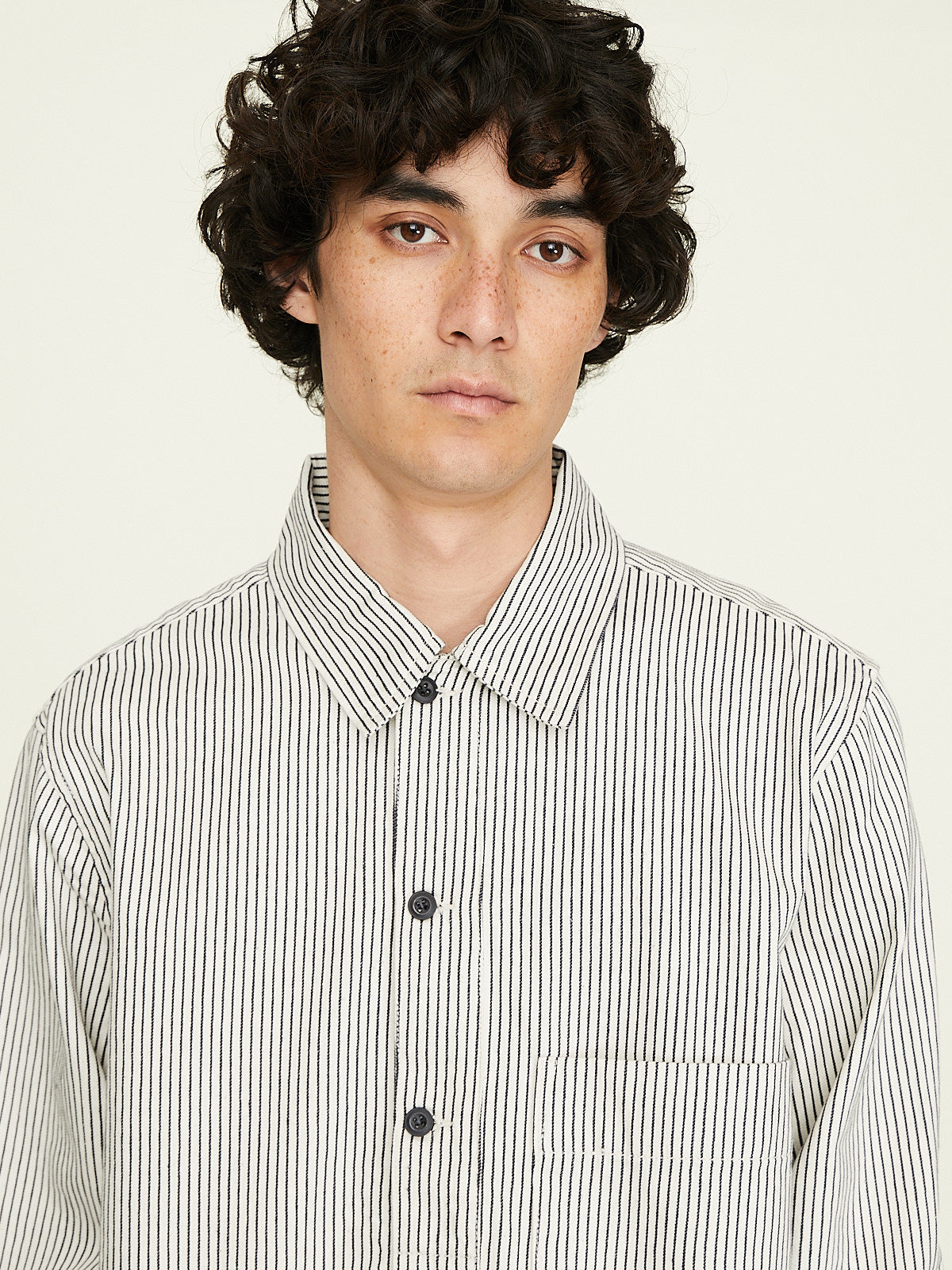 Overshirt in striped off white/navy organic cotton twill blend combining a nautical-inspired design with American hickory striped workwear. Large shirt collar, partial front button fastening and long sleeves with buttoned cuffs. Features a back yoke and a single chest pocket. Straight hemline. Loose fit.