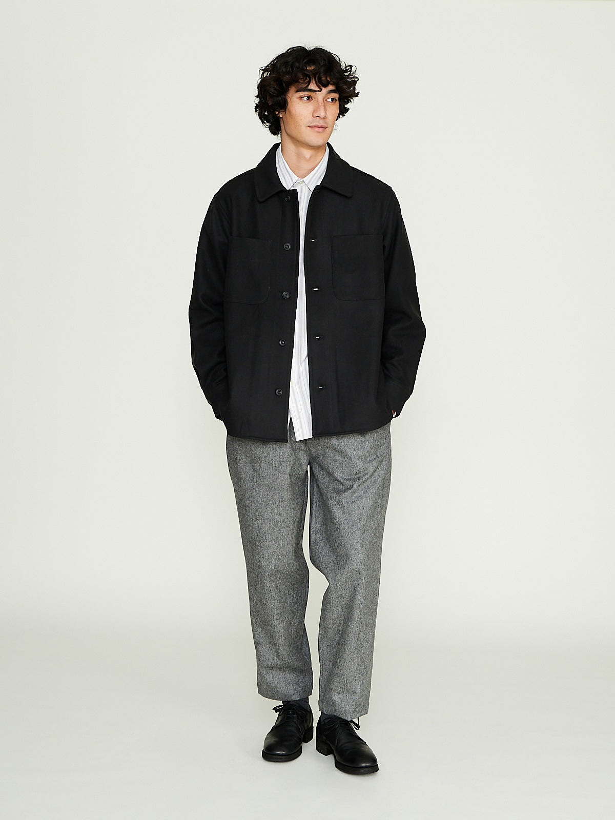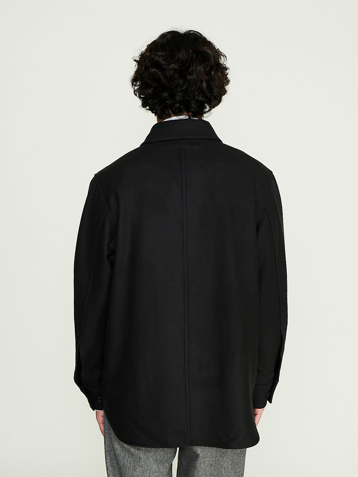 Overshirt in a dark grey thick wool blend. Flat collar, front button fastening and long sleeves with buttoned cuffs. Features two chest pockets and a side seam pockets. Curved hemline. Relaxed fit.