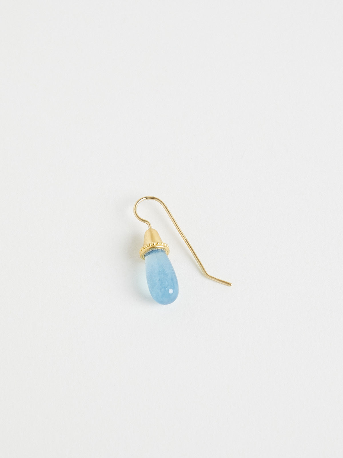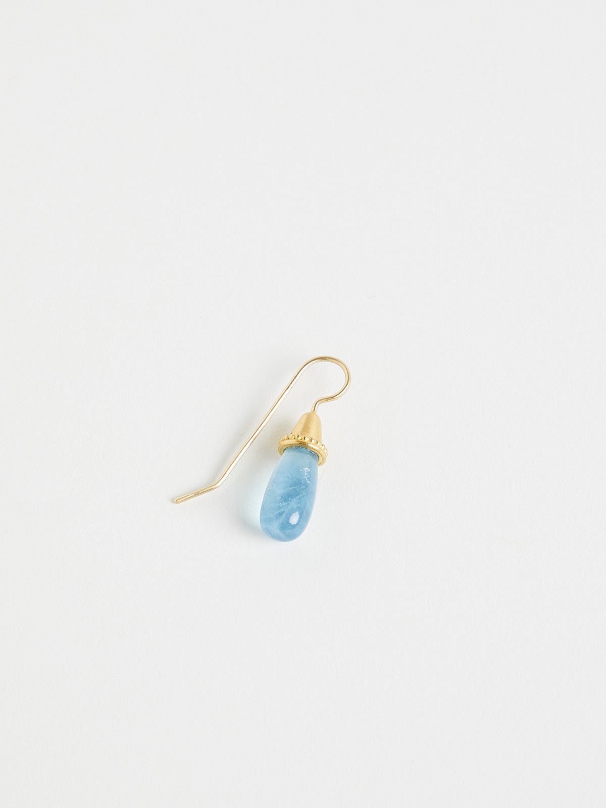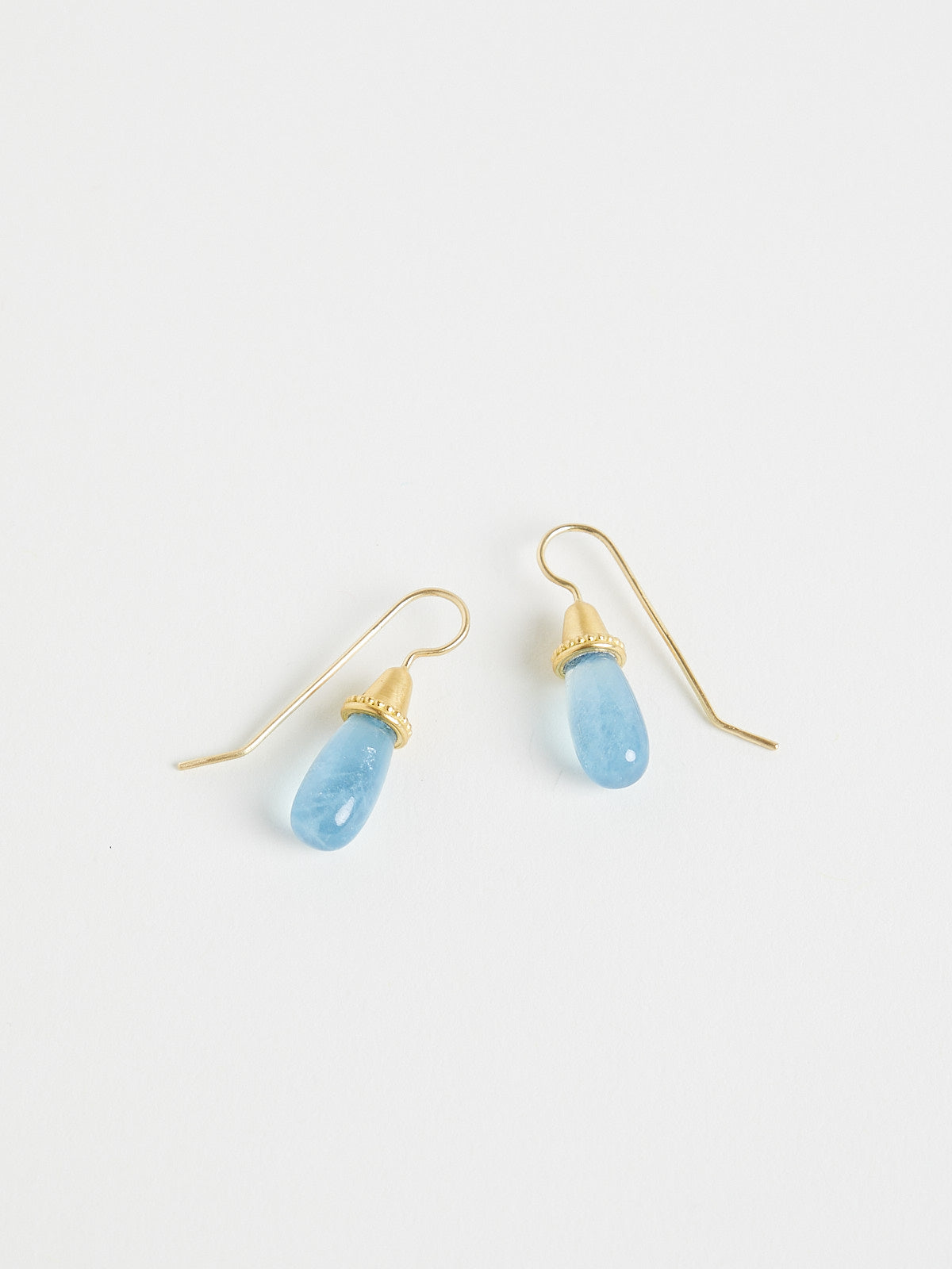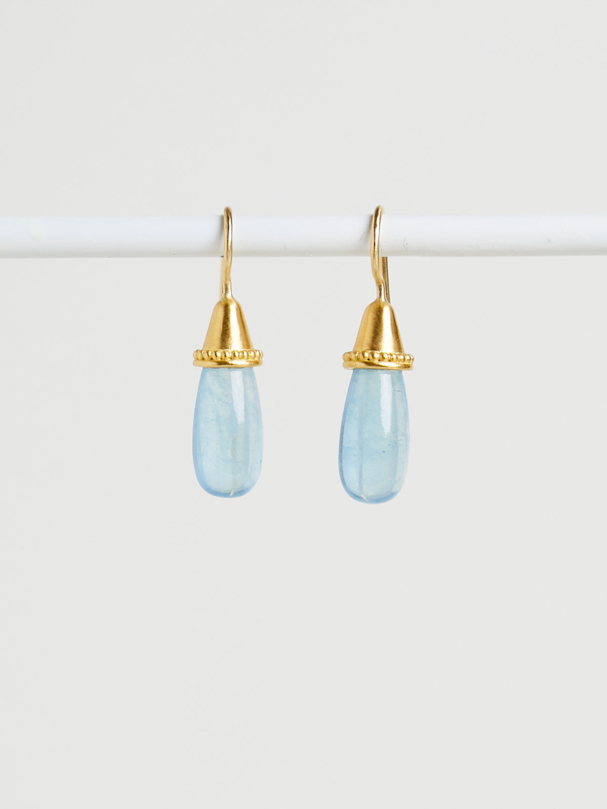 Handmade earrings in 22k yellow gold with aquamarine drops cap-set with granulated rims. Features an ear wire backing.