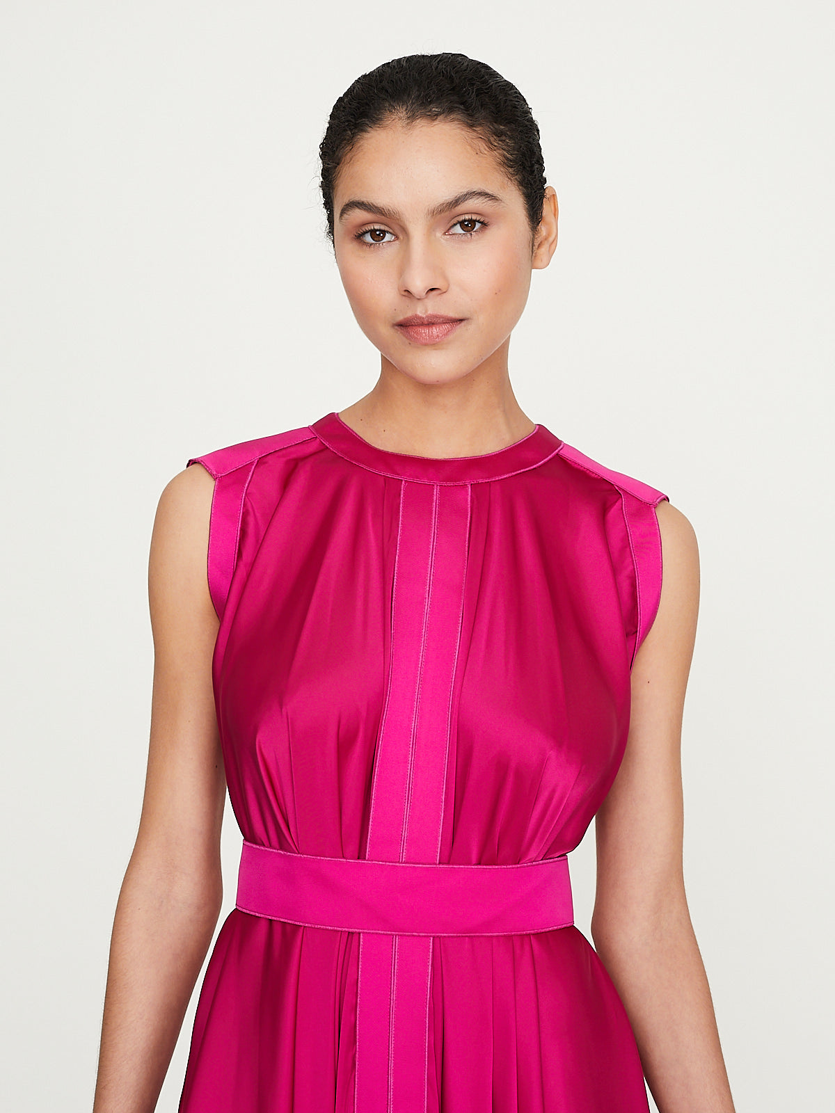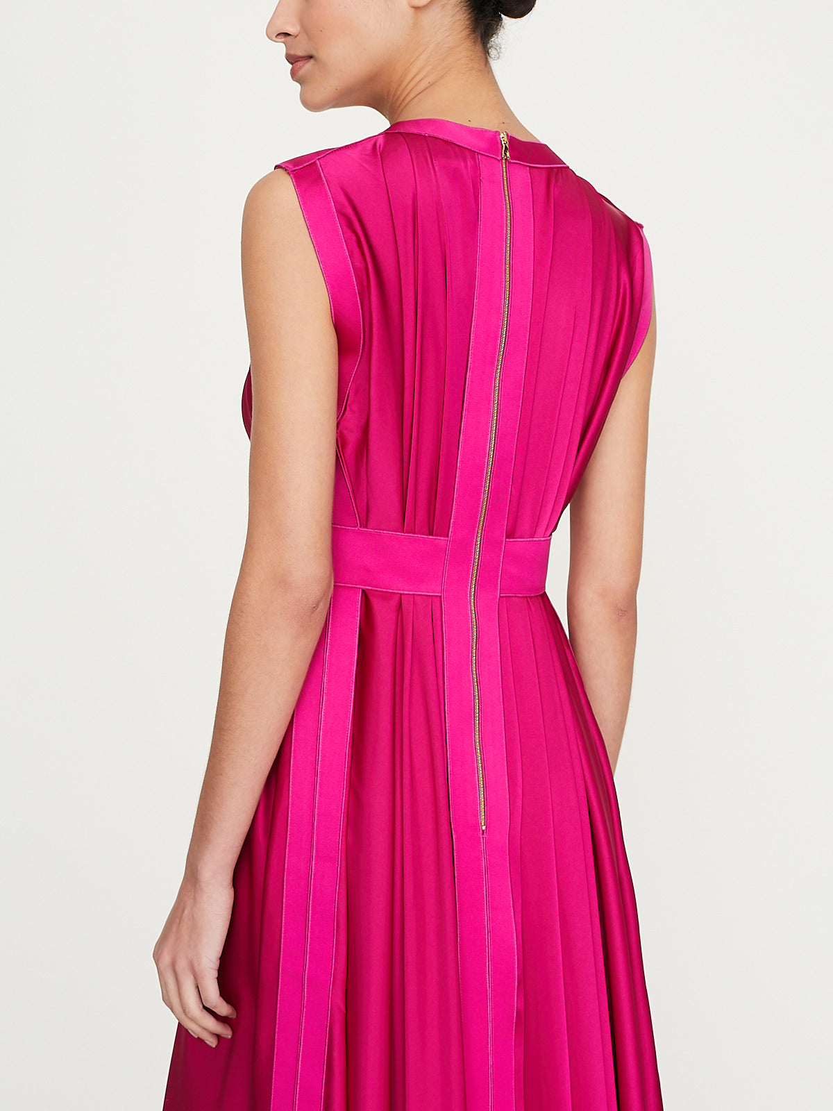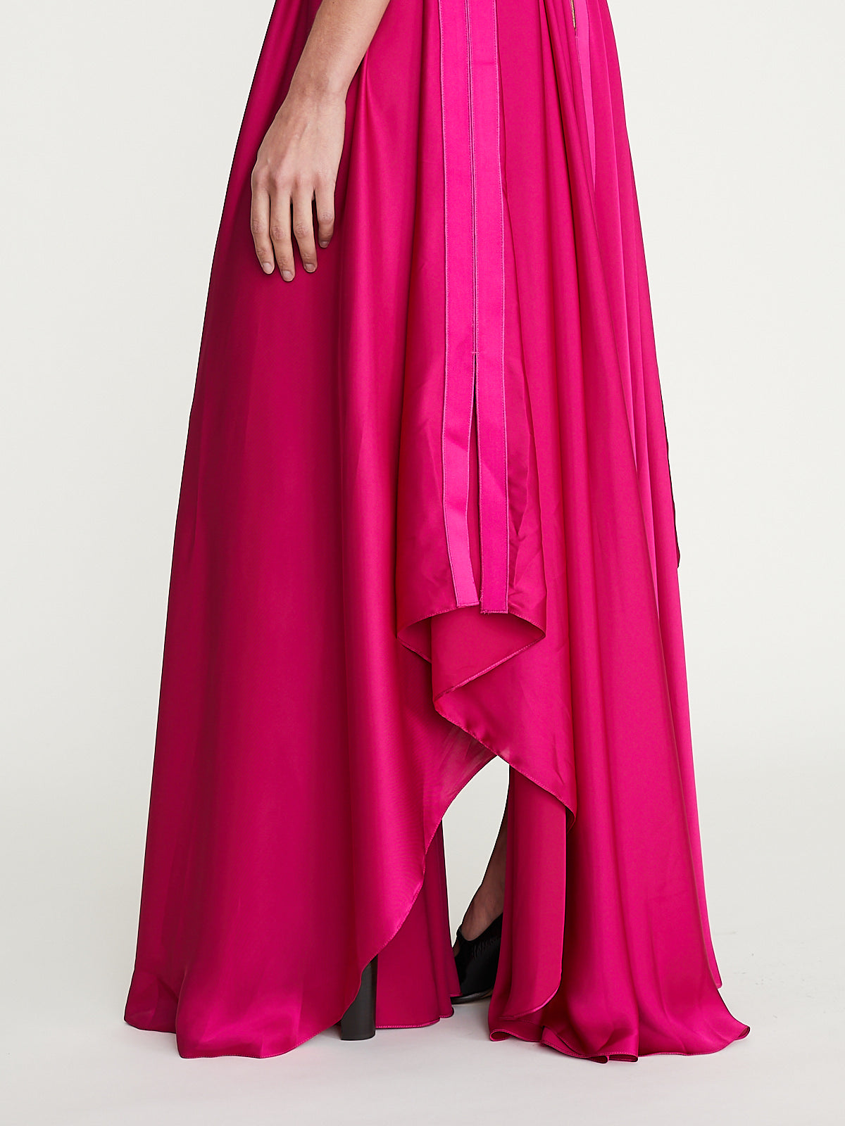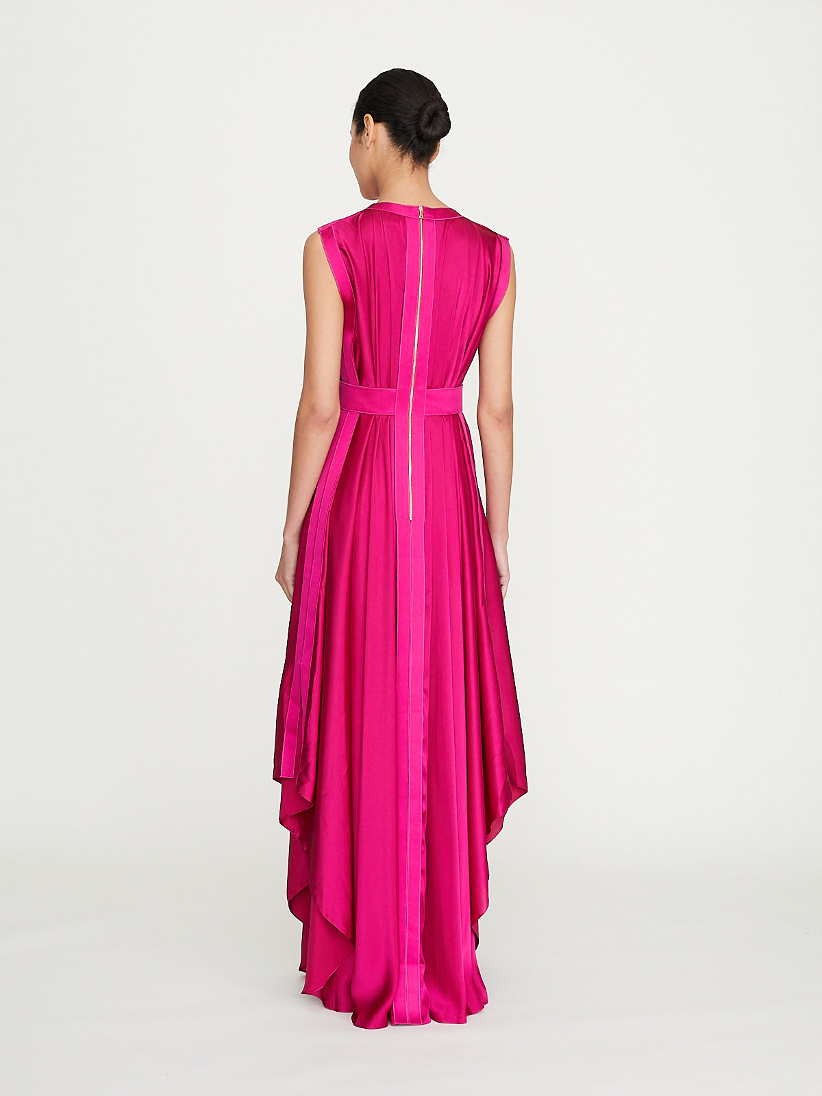 Flowy sleeveless maxi dress in fuschsia pink charmeuse. Round neckline and an exposed zip fastening at the back. Pleating on the front and back. Ribbon detail around the waist, on the front, back and sides and around the armholes. Features an asymmetric handkerchief hem.