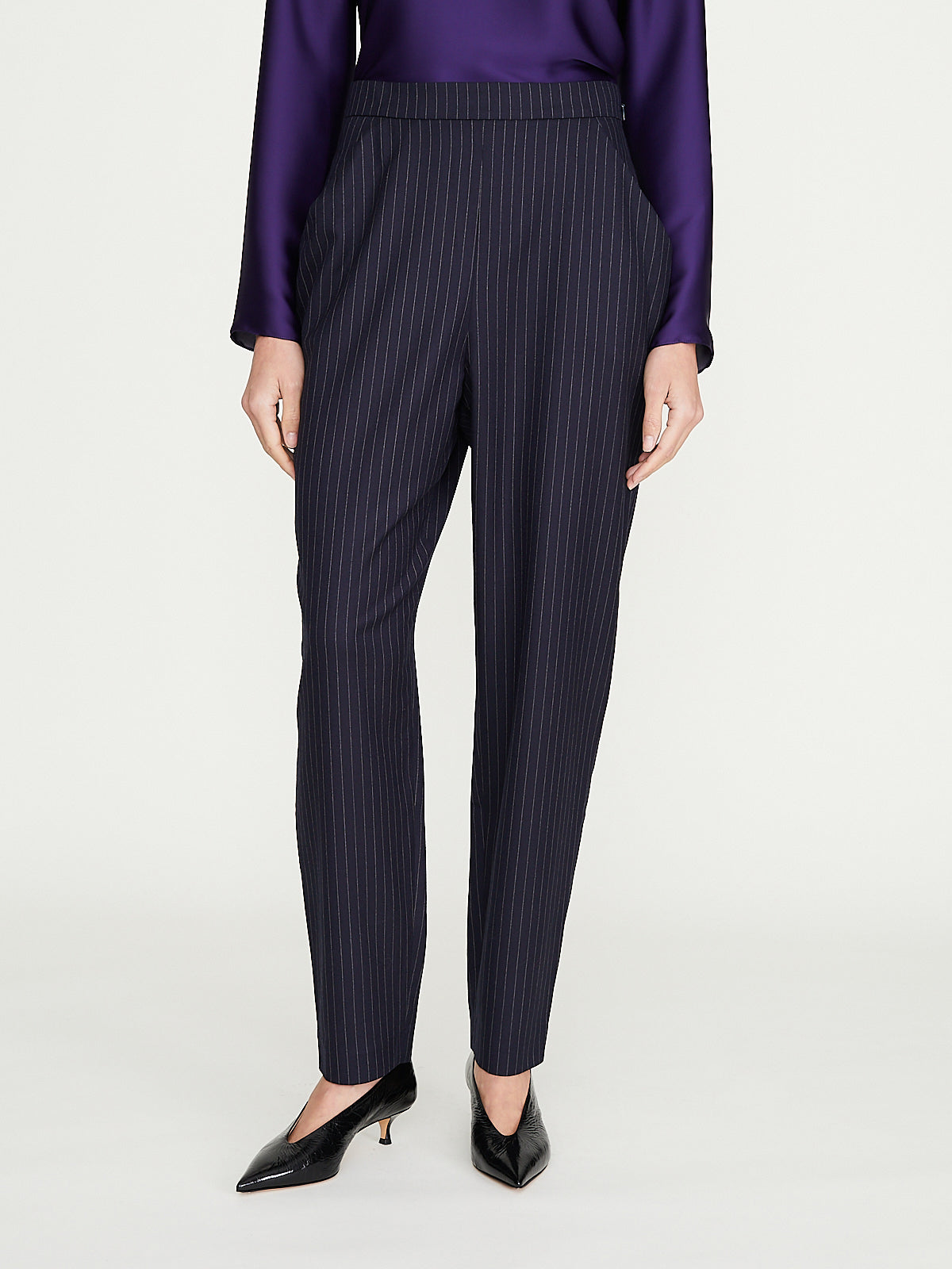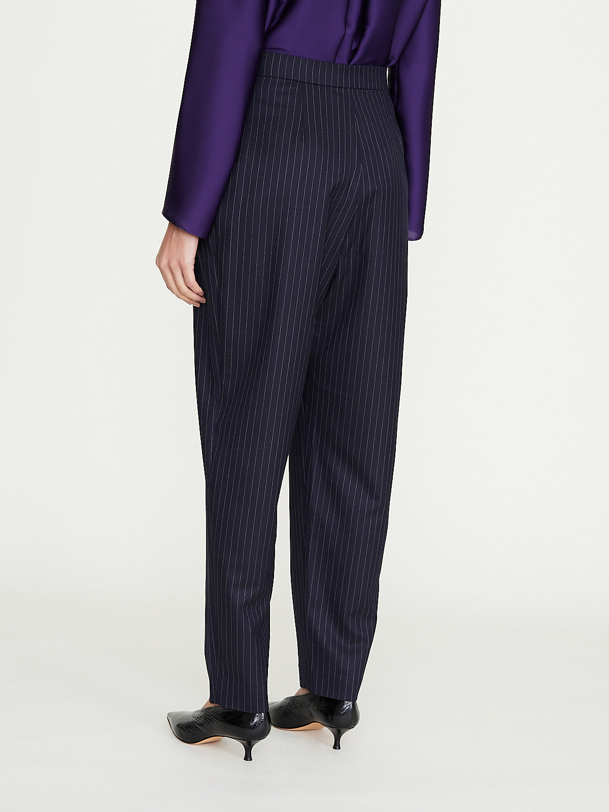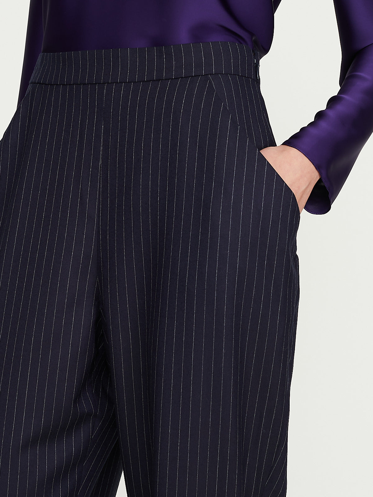 Tailored pants in striped navy virgin wool flannel. High waist with a concealed zip fastening on the side. Structured side pockets. Legs taper at the cuffs.