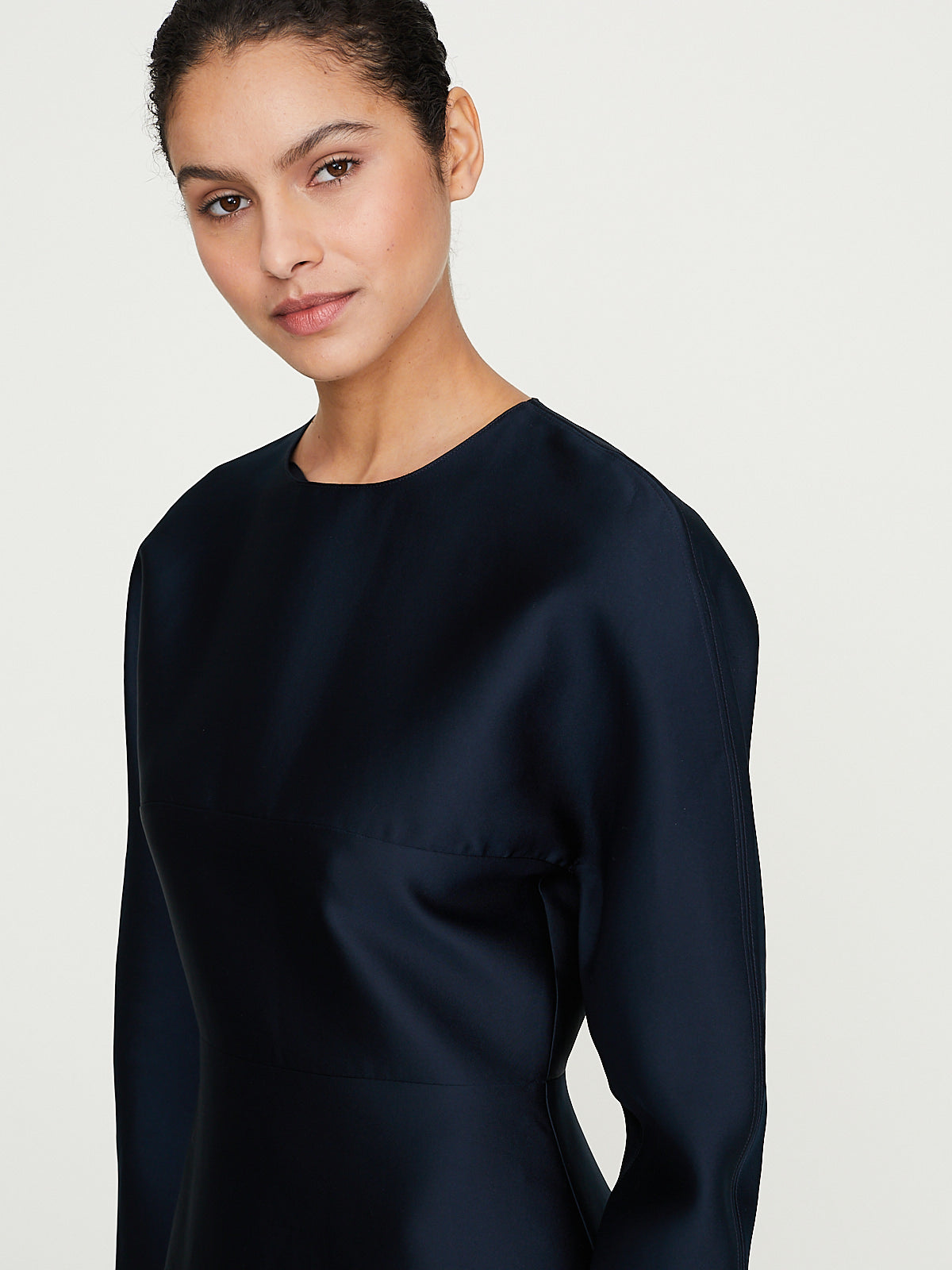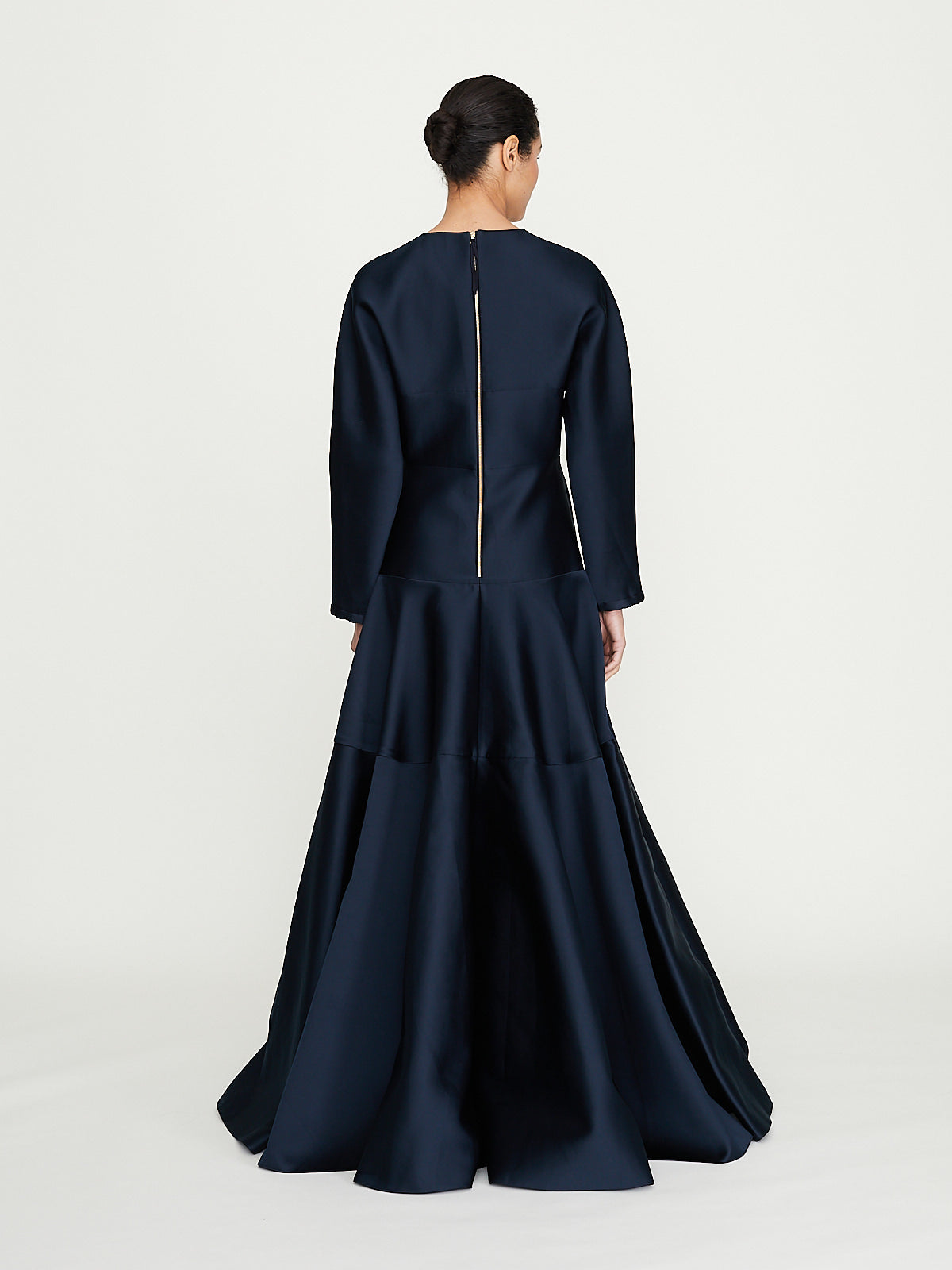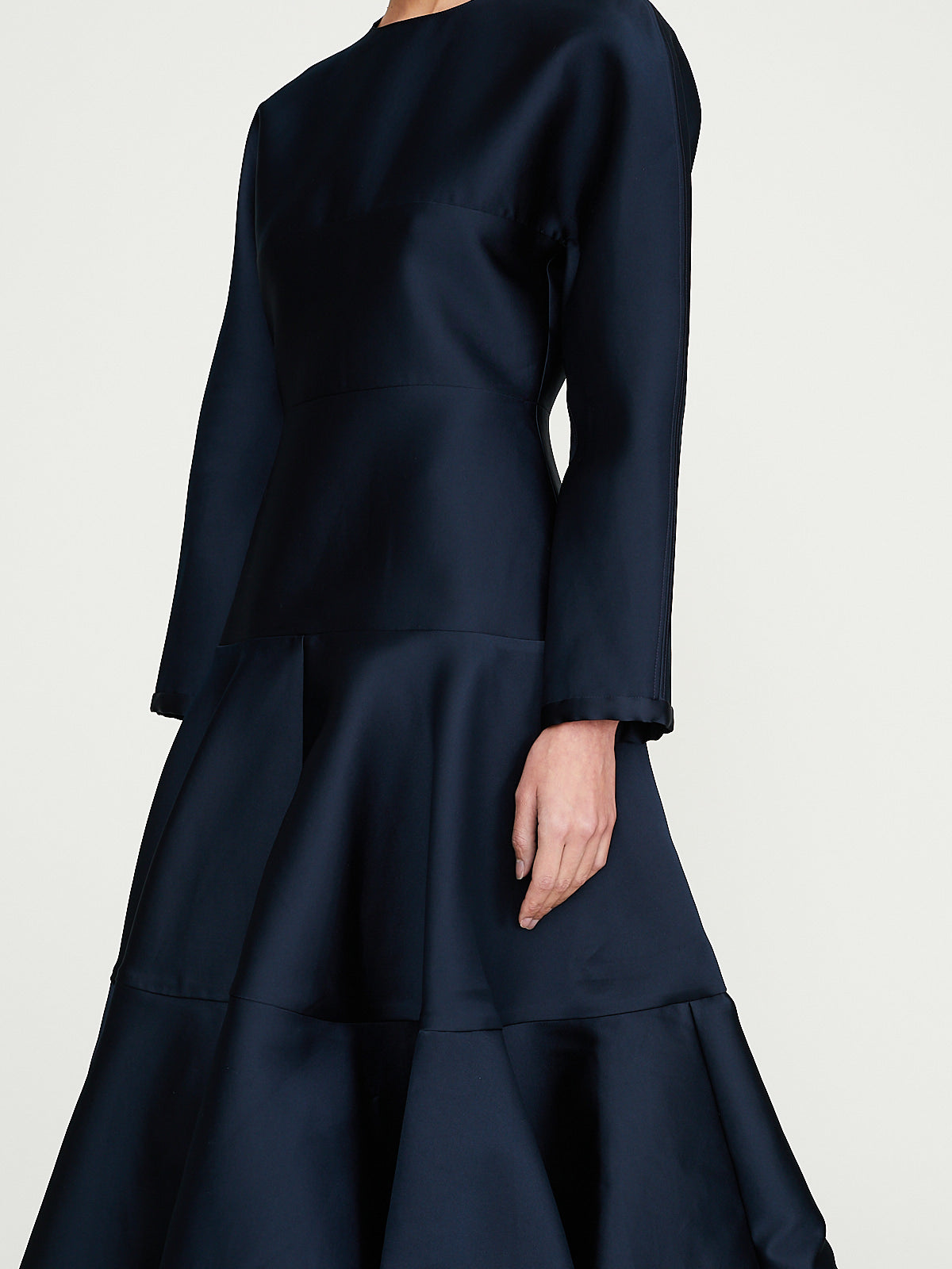 Sculptural maxi dress in navy satin. Round neckline, exposed zip fastening at the back and long dolman sleeves. Features a dropped waist and a pleated skirt.