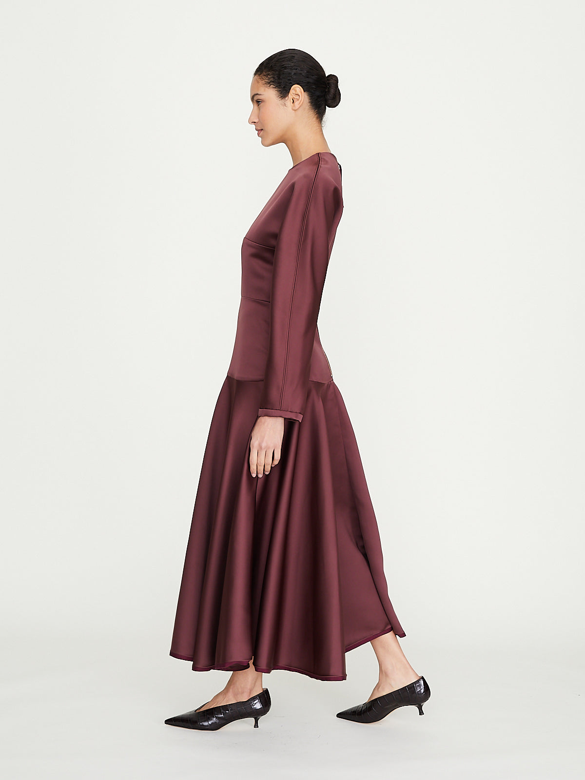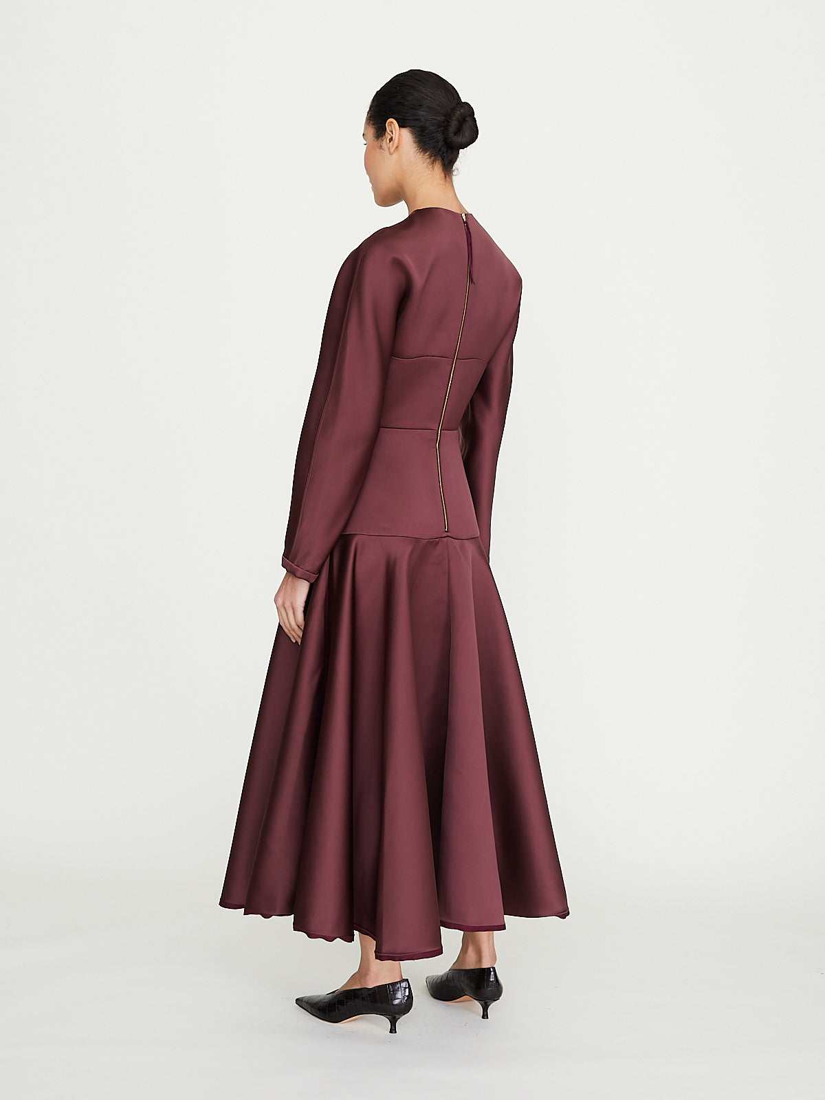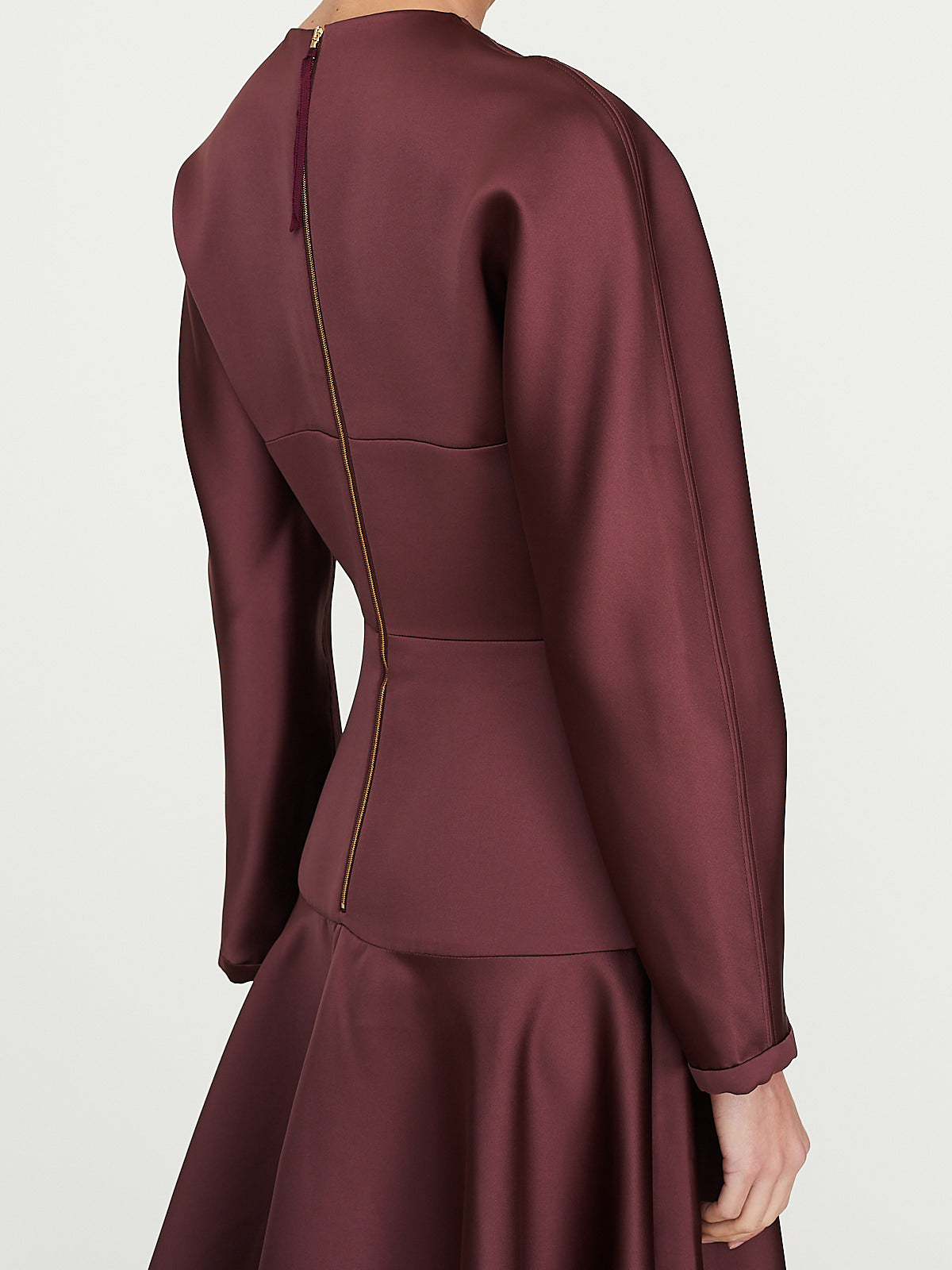 Sculptural midi dress in burgundy satin. Round neckline, exposed zip fastening at the back and long dolman sleeves. Features a dropped waist and a wide pleated skirt.