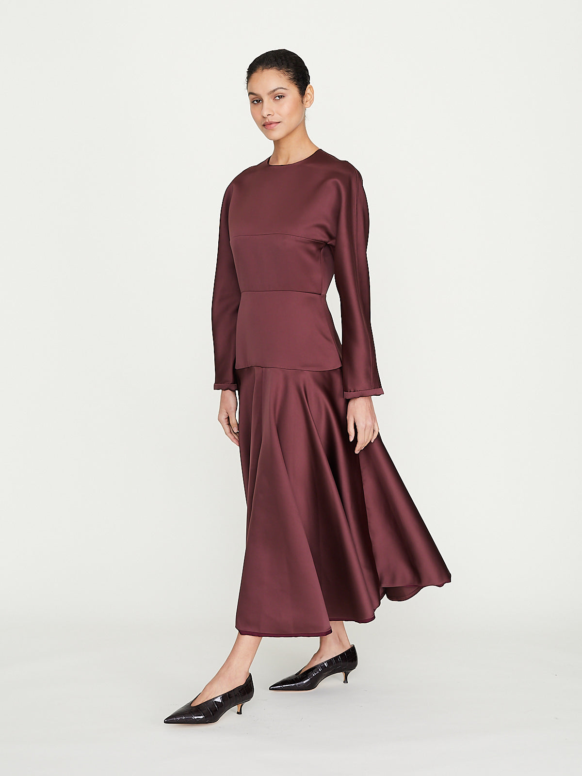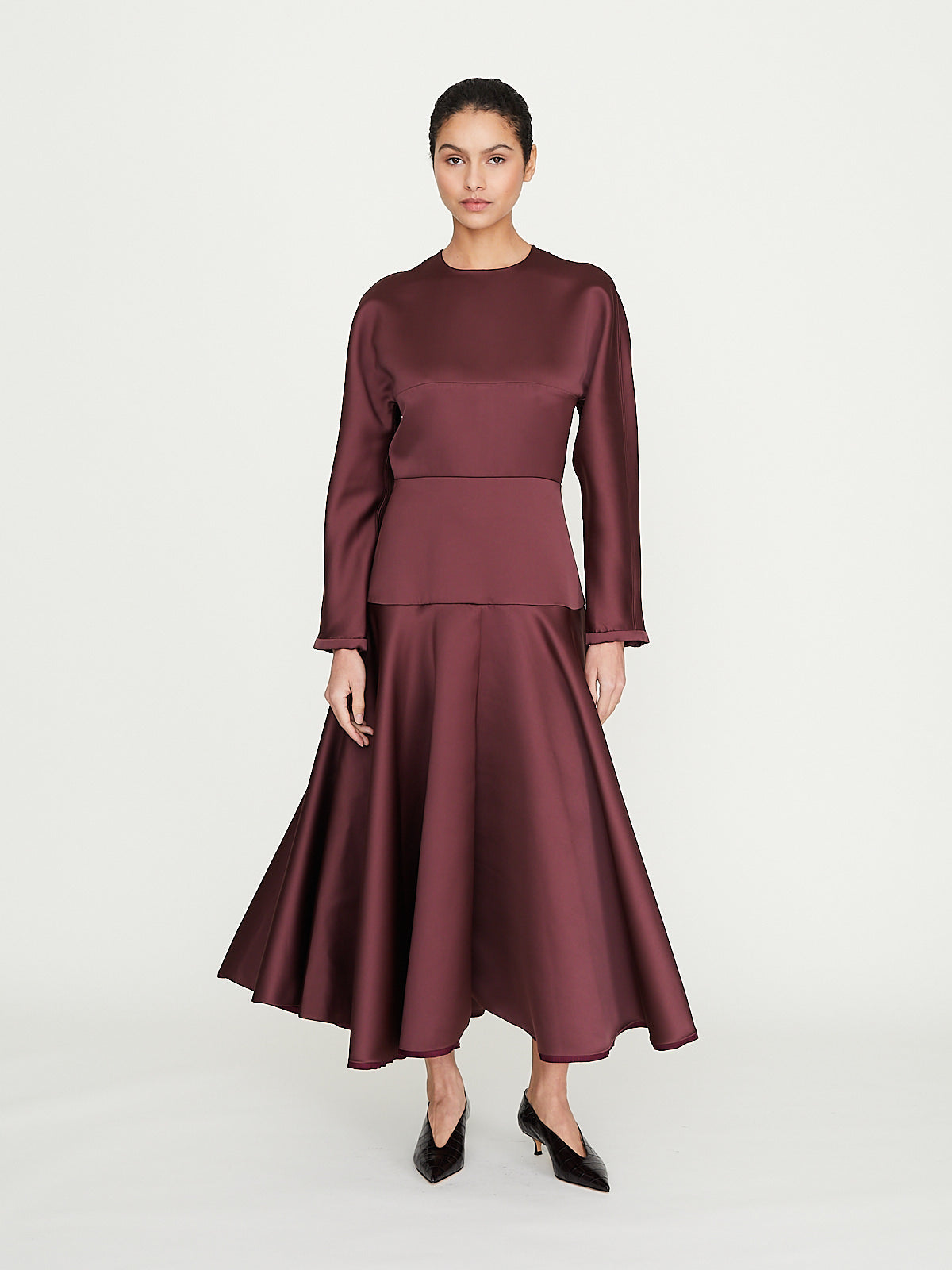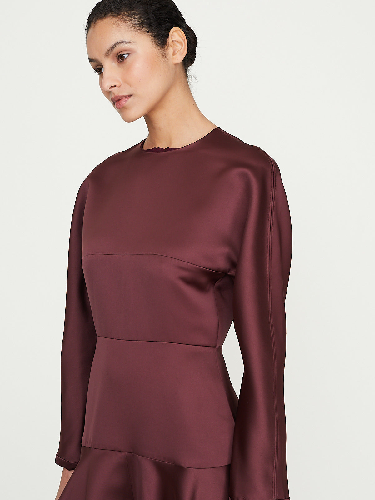 Sculptural midi dress in burgundy satin. Round neckline, exposed zip fastening at the back and long dolman sleeves. Features a dropped waist and a wide pleated skirt.