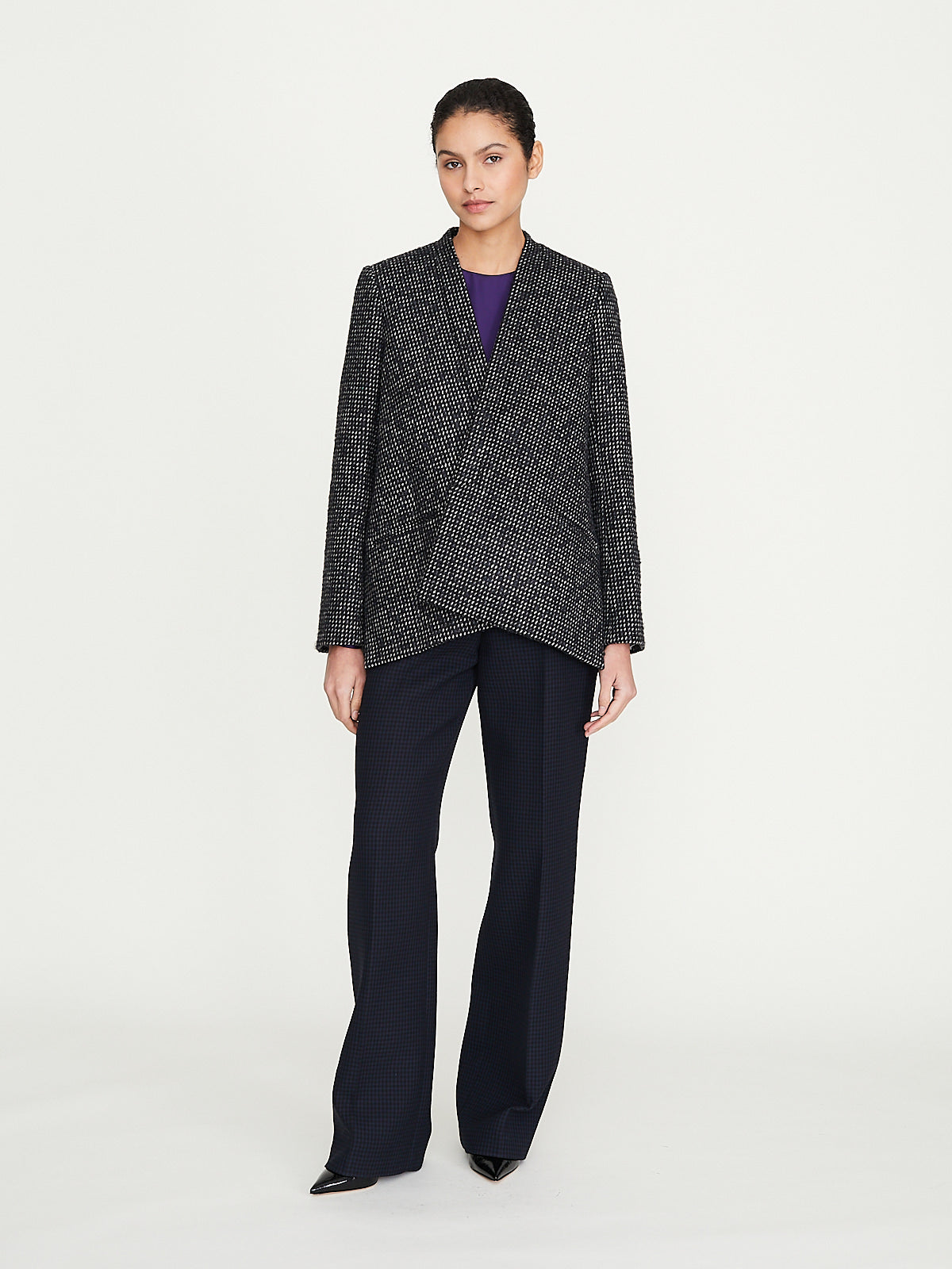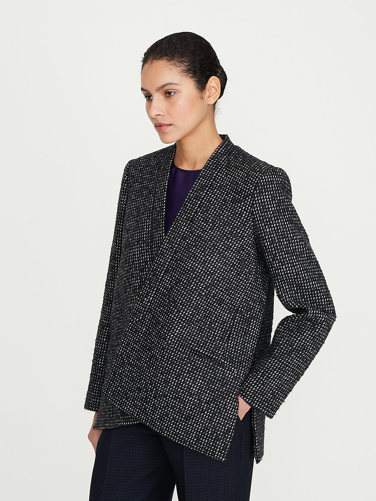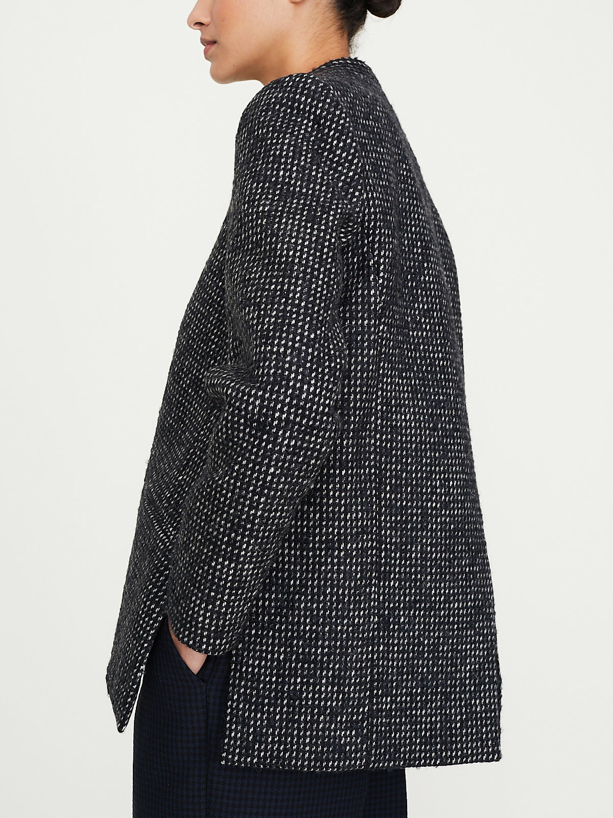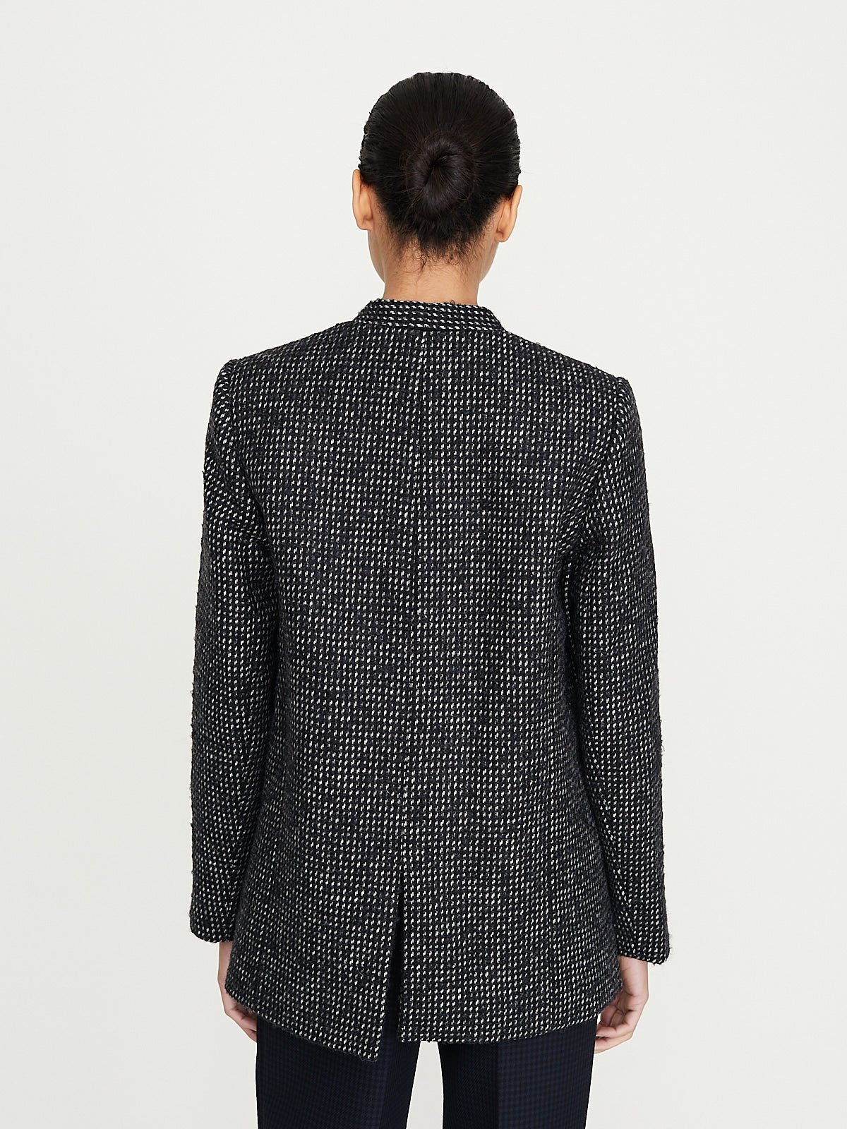 Tweed blazer in a black and white wool blend. Collarless, open front with a subtle crossbody effect. Jetted slip pockets on the front and a back vent. Features side slits.