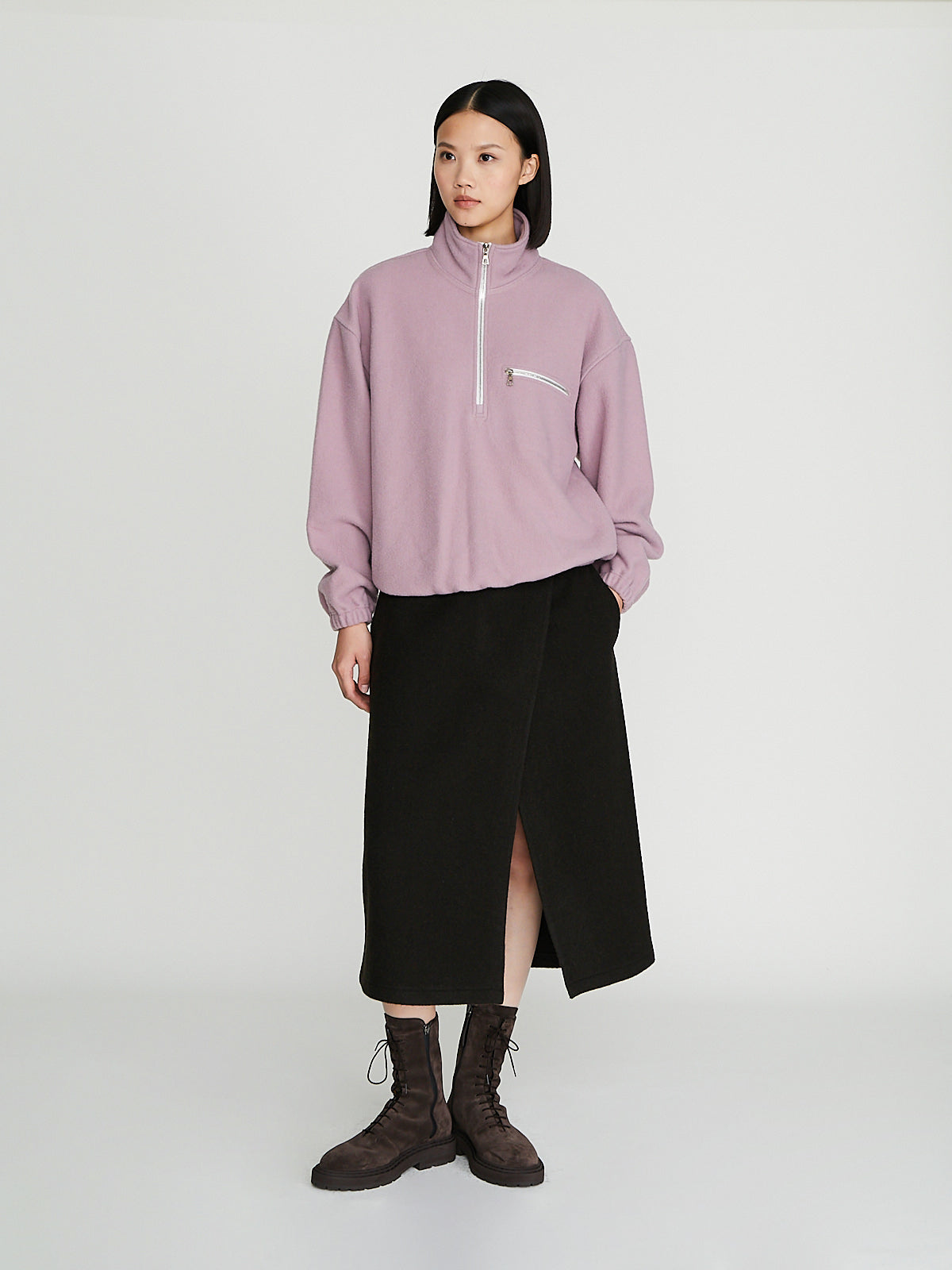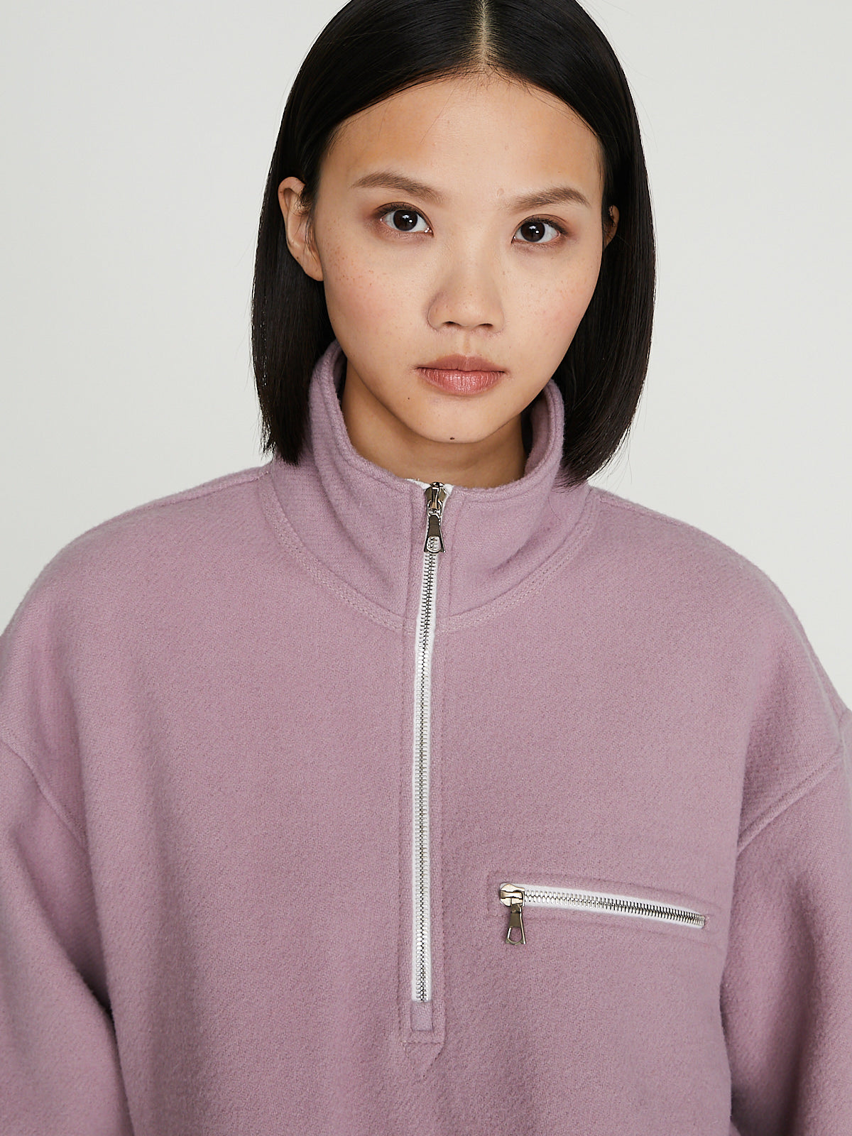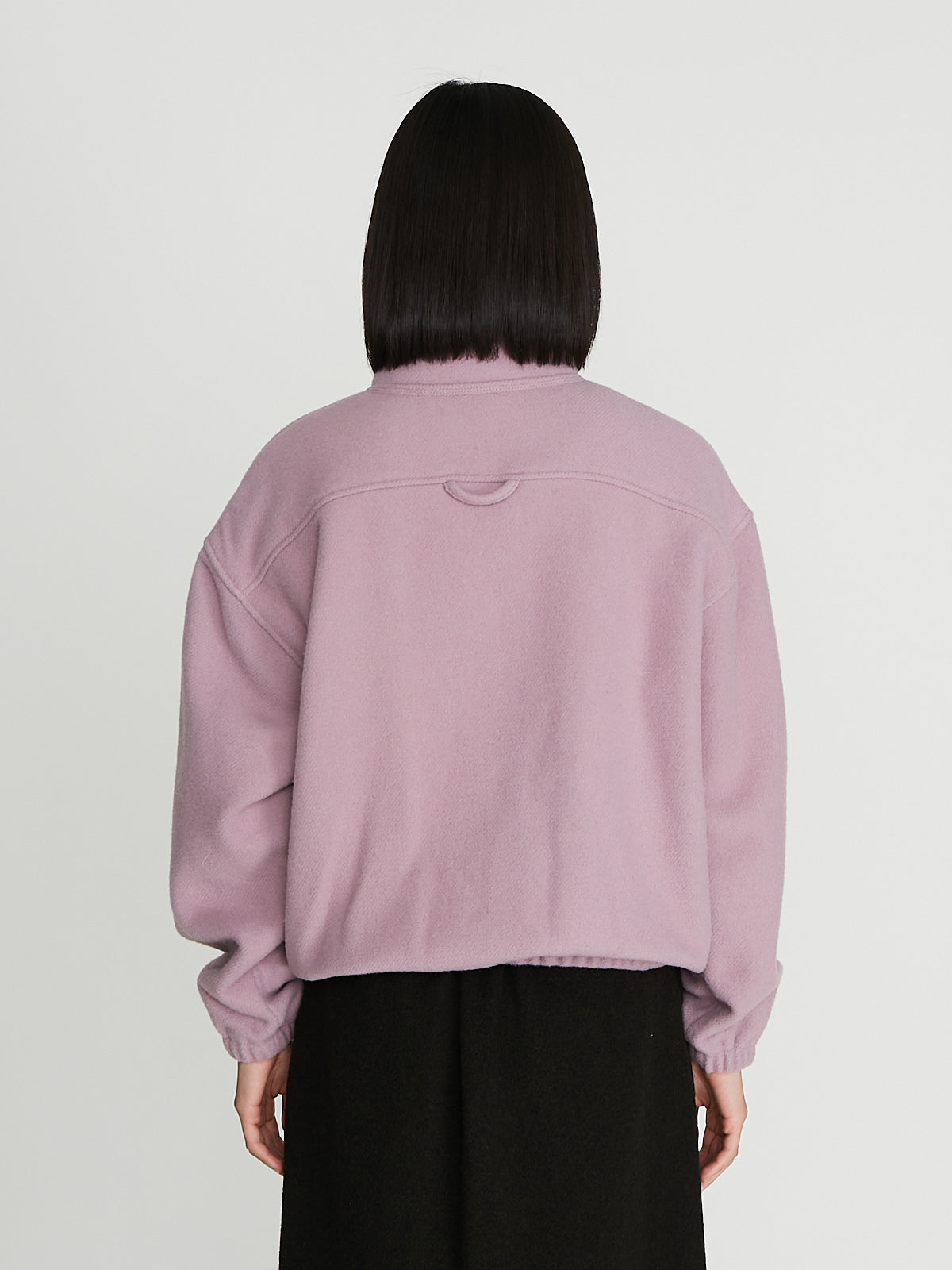 Unisex jacket in lightweight, natural and biodegradable pink wool fleece-pile. Stand collar, a partial front zip fastening and long sleeves with a dropped shoulder with elasticated cuffs. Chest pocket with a zip fastening. Back yoke with a loop detail. Elasticated bottom hem. Regular fit. Unlined.