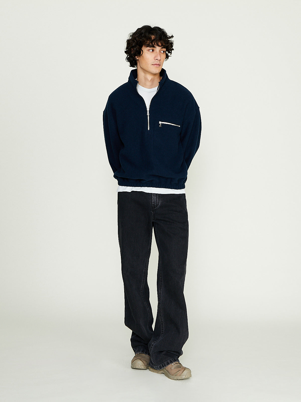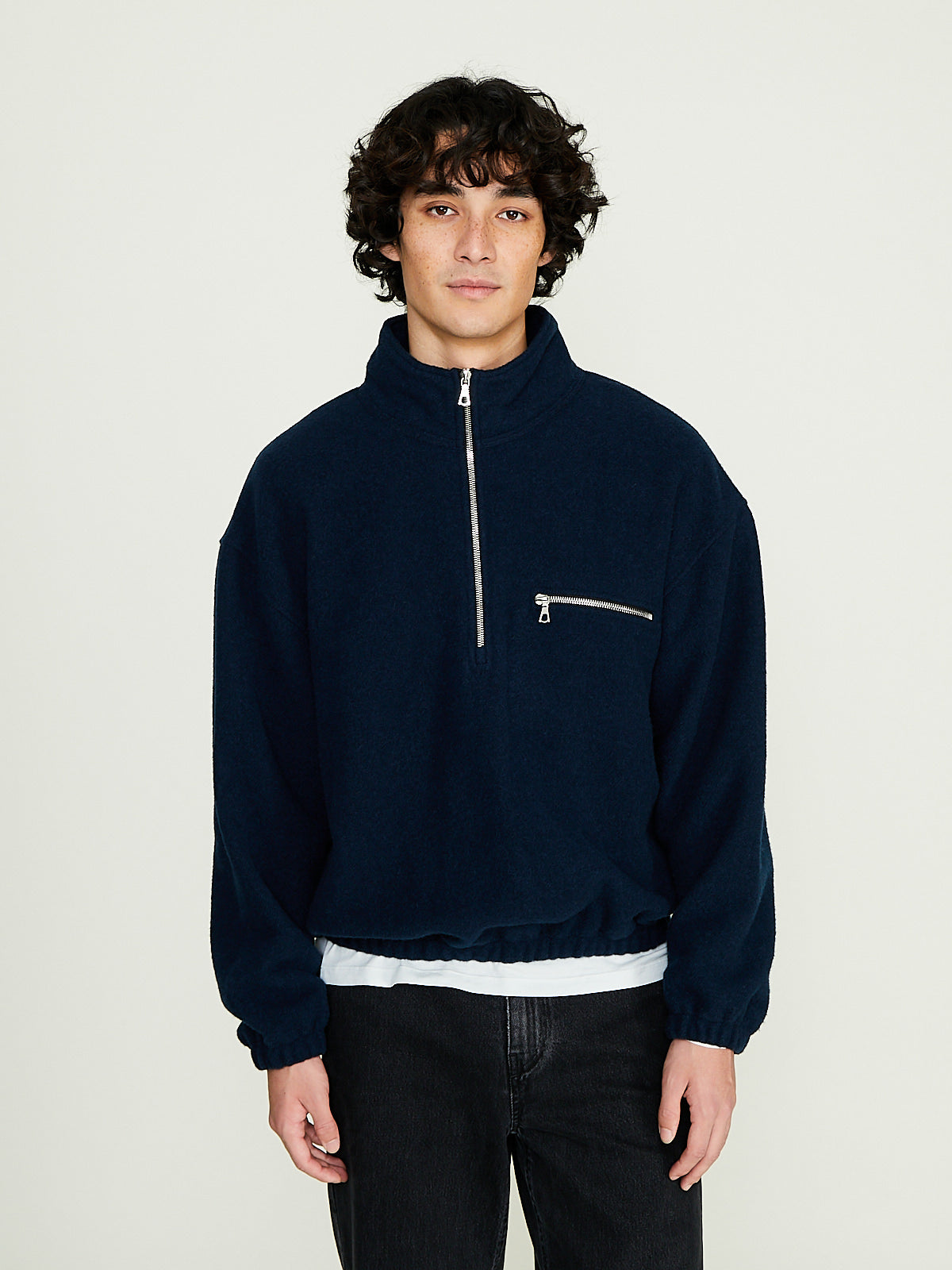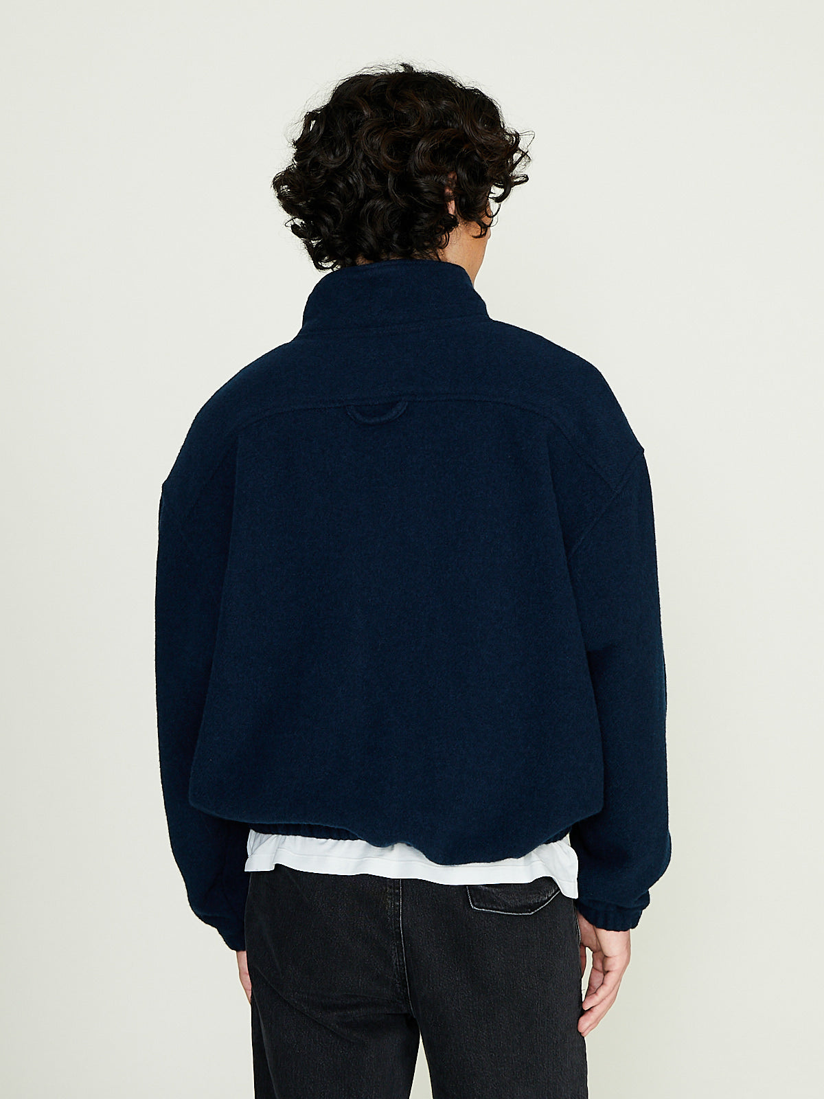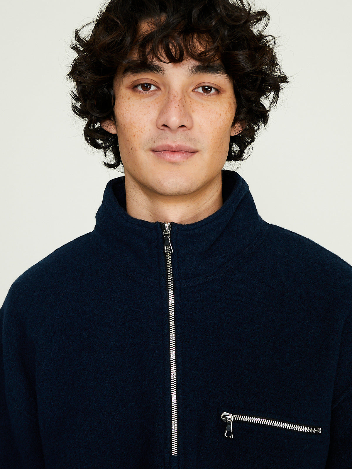 Unisex jacket in lightweight, natural and biodegradable dark blue wool fleece-pile. Stand collar, a partial front zip fastening and long sleeves with a dropped shoulder with elasticated cuffs. Chest pocket with a zip fastening. Back yoke with a loop detail. Elasticated bottom hem. Regular fit. Unlined.