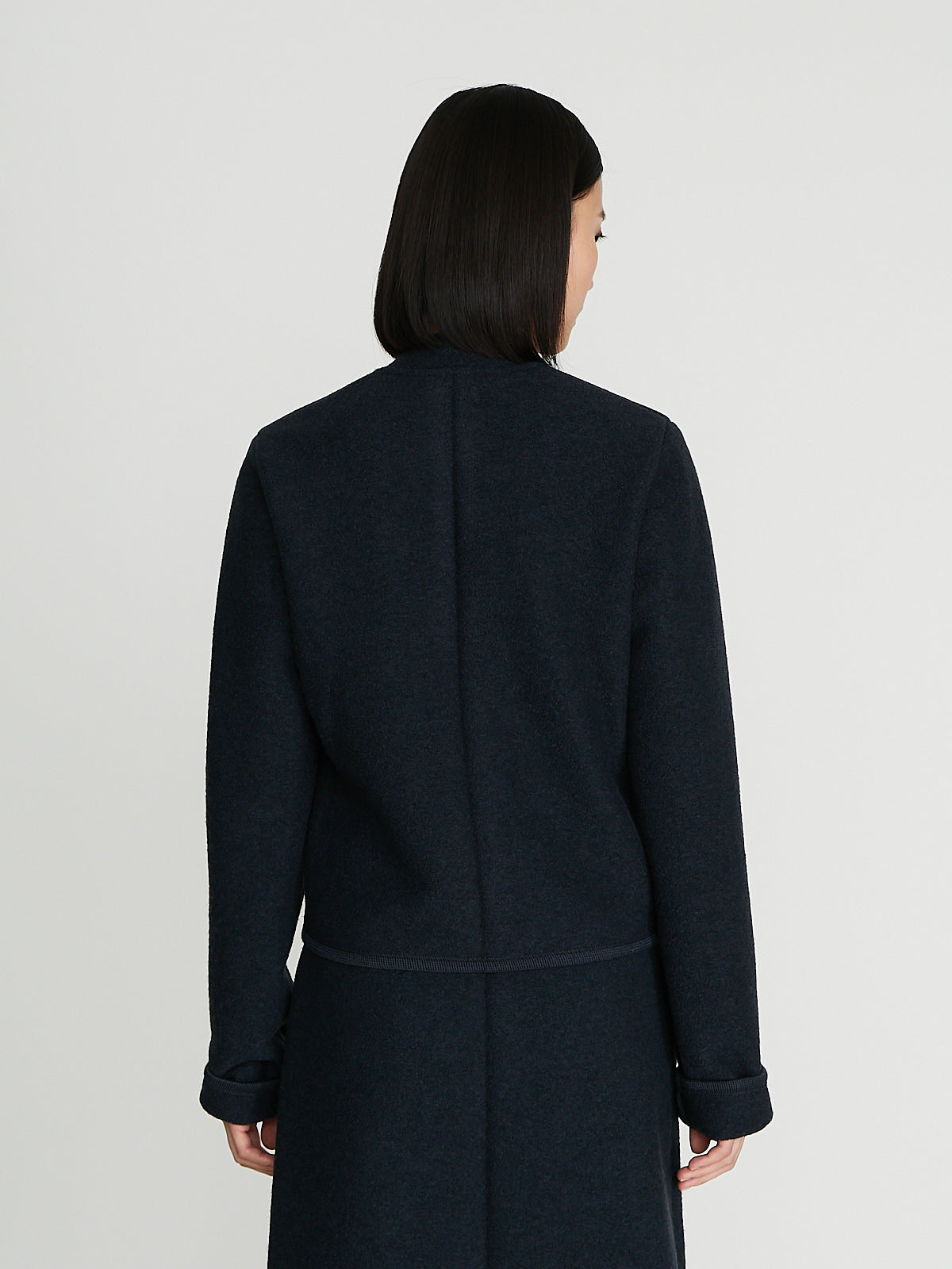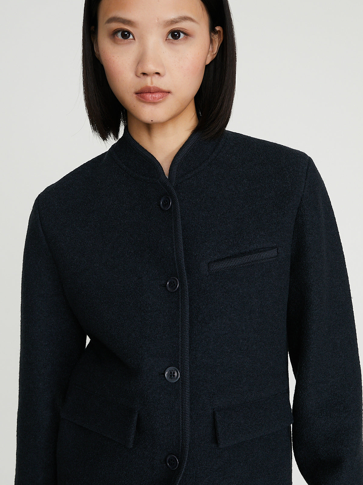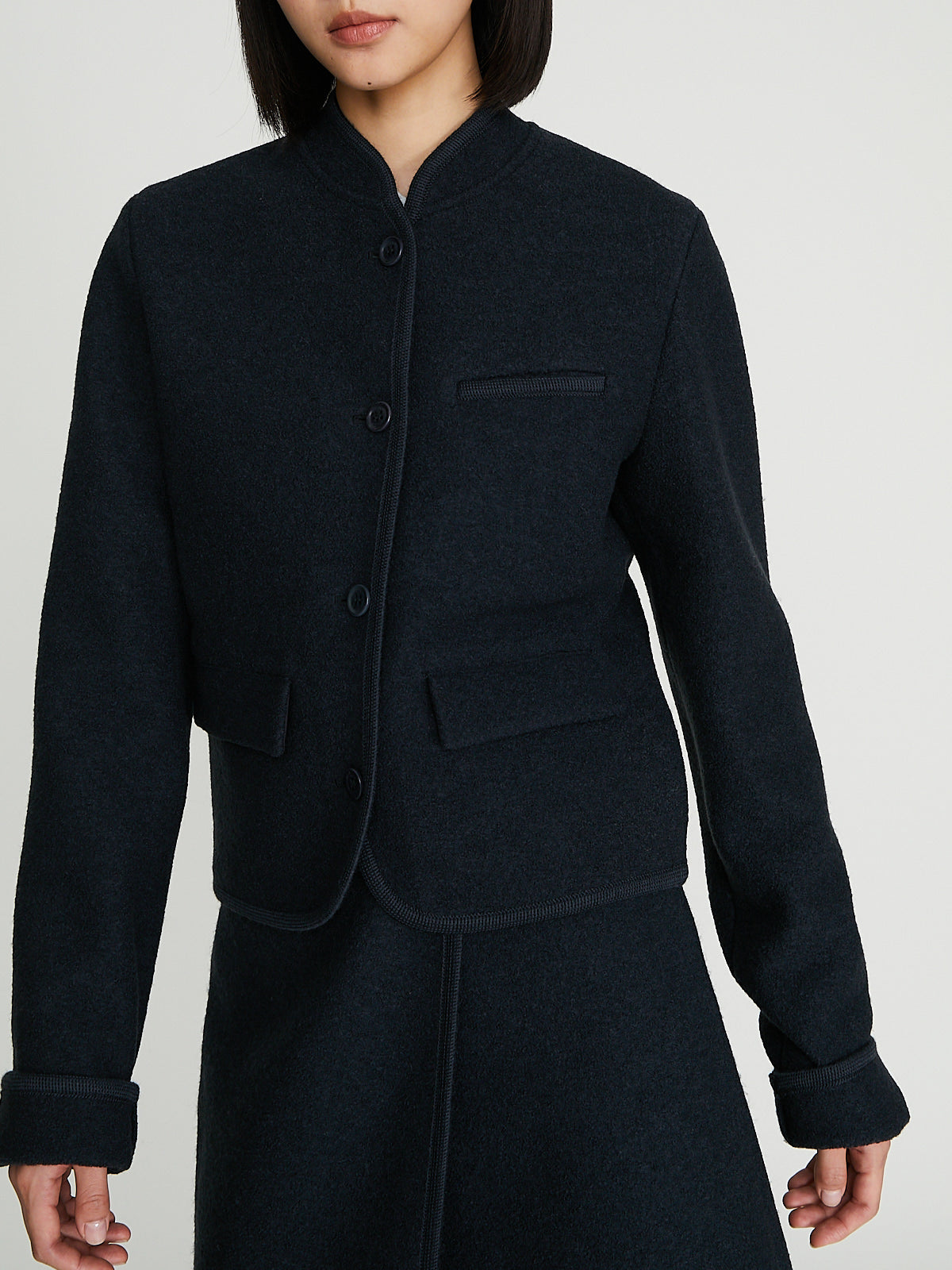 Cropped jacket in dark bluey grey felted wool. Banded collar and a concealed front button fastening. Flap pockets on the front and a single internal chest pocket. Woven wool border throughout. Boxy and regular fit. Unlined.