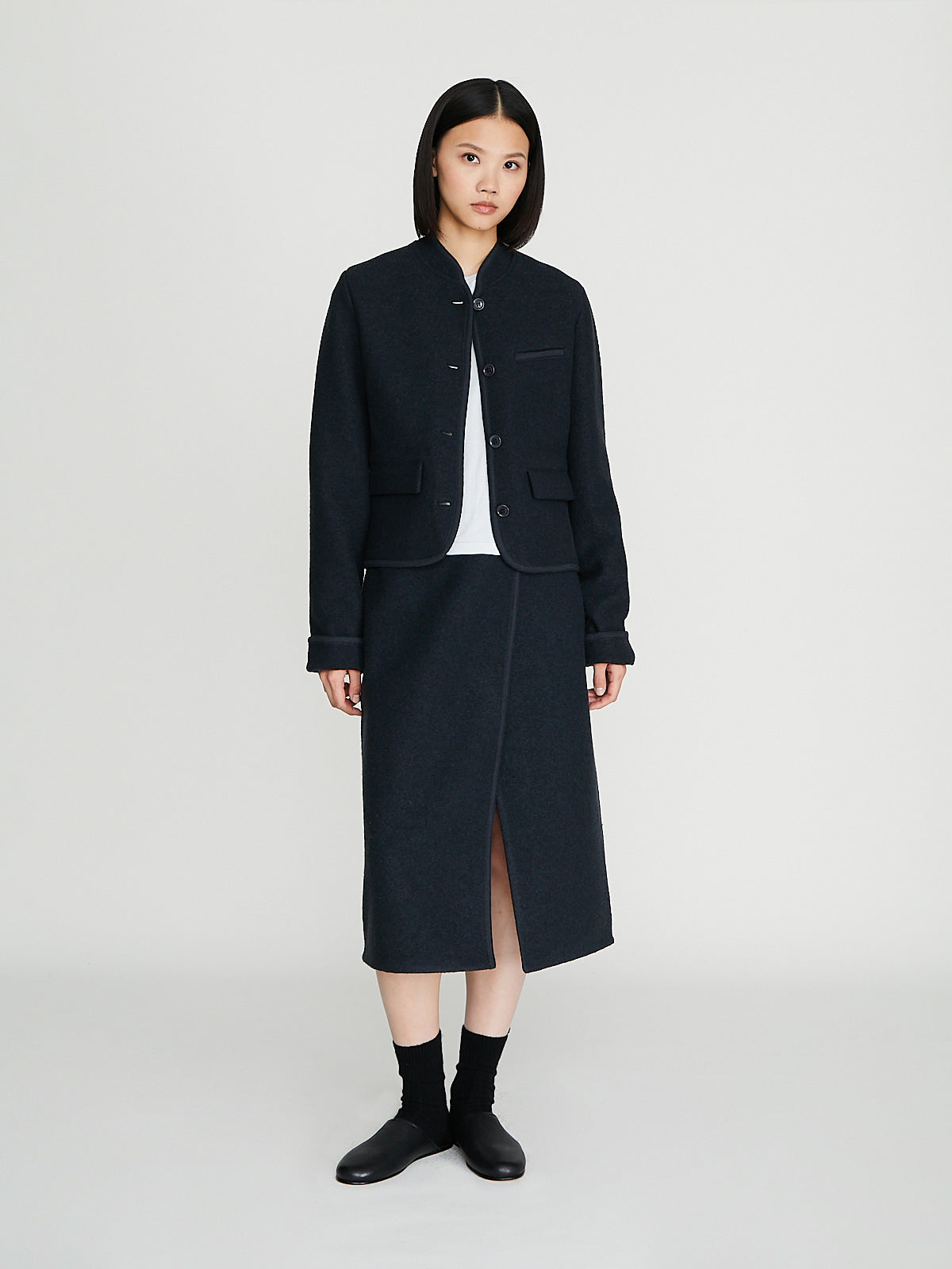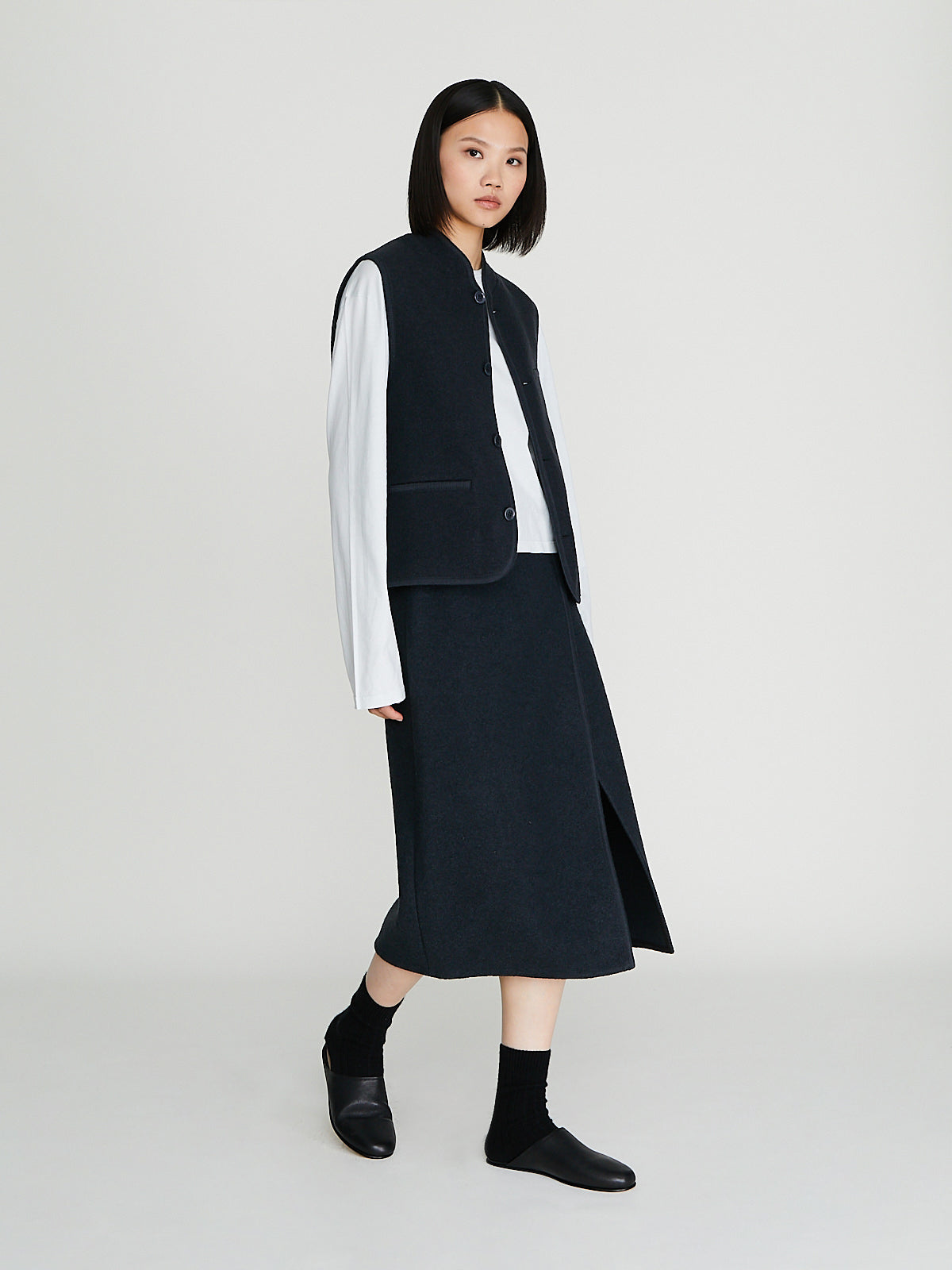 Wrap skirt made of lightweight dark bluey grey wool, woven like a knit and felted like a Loden. Sits at the waist and a double breasted overlapped closure with two hidden corozo nut-fruit buttons.