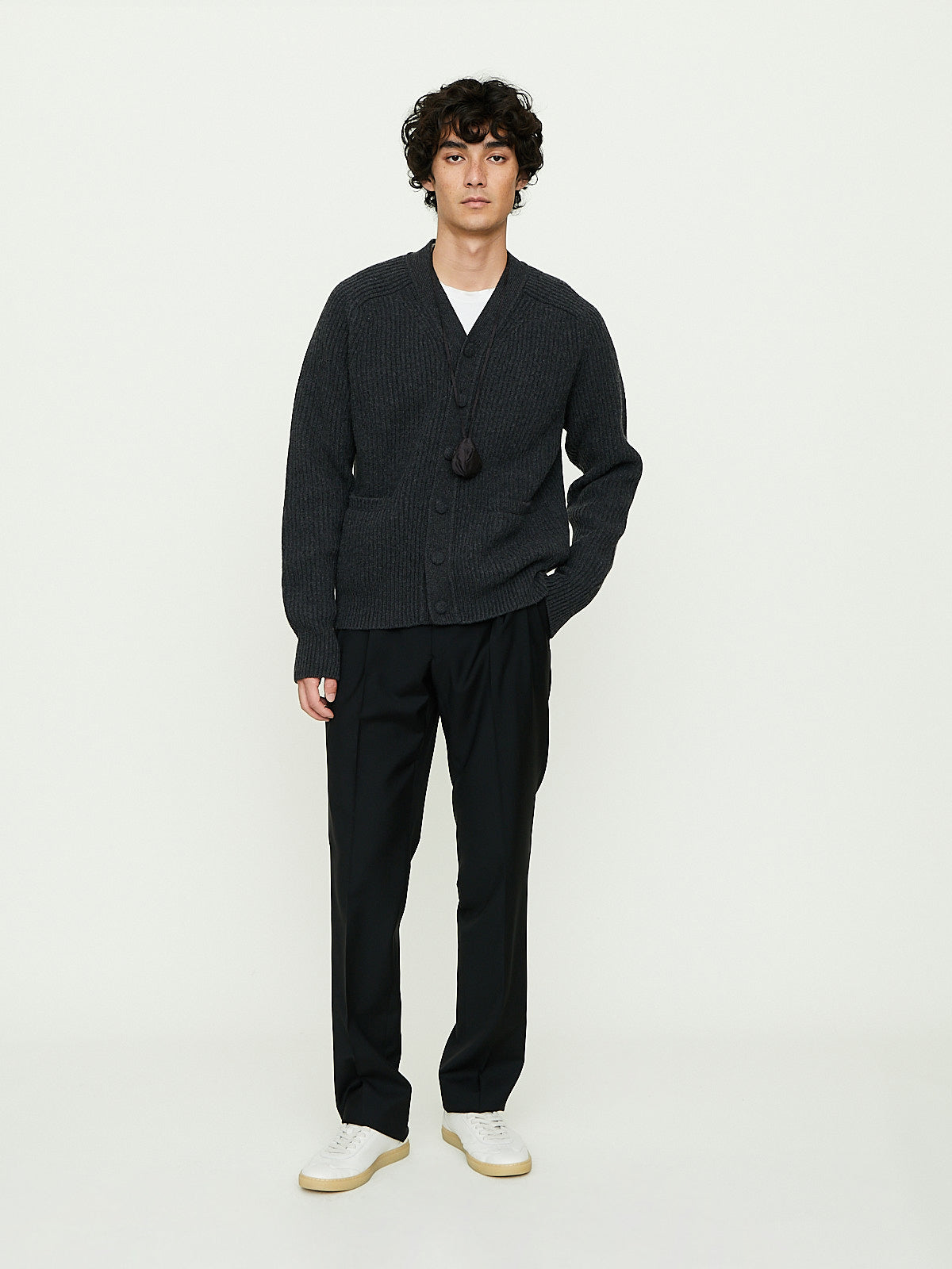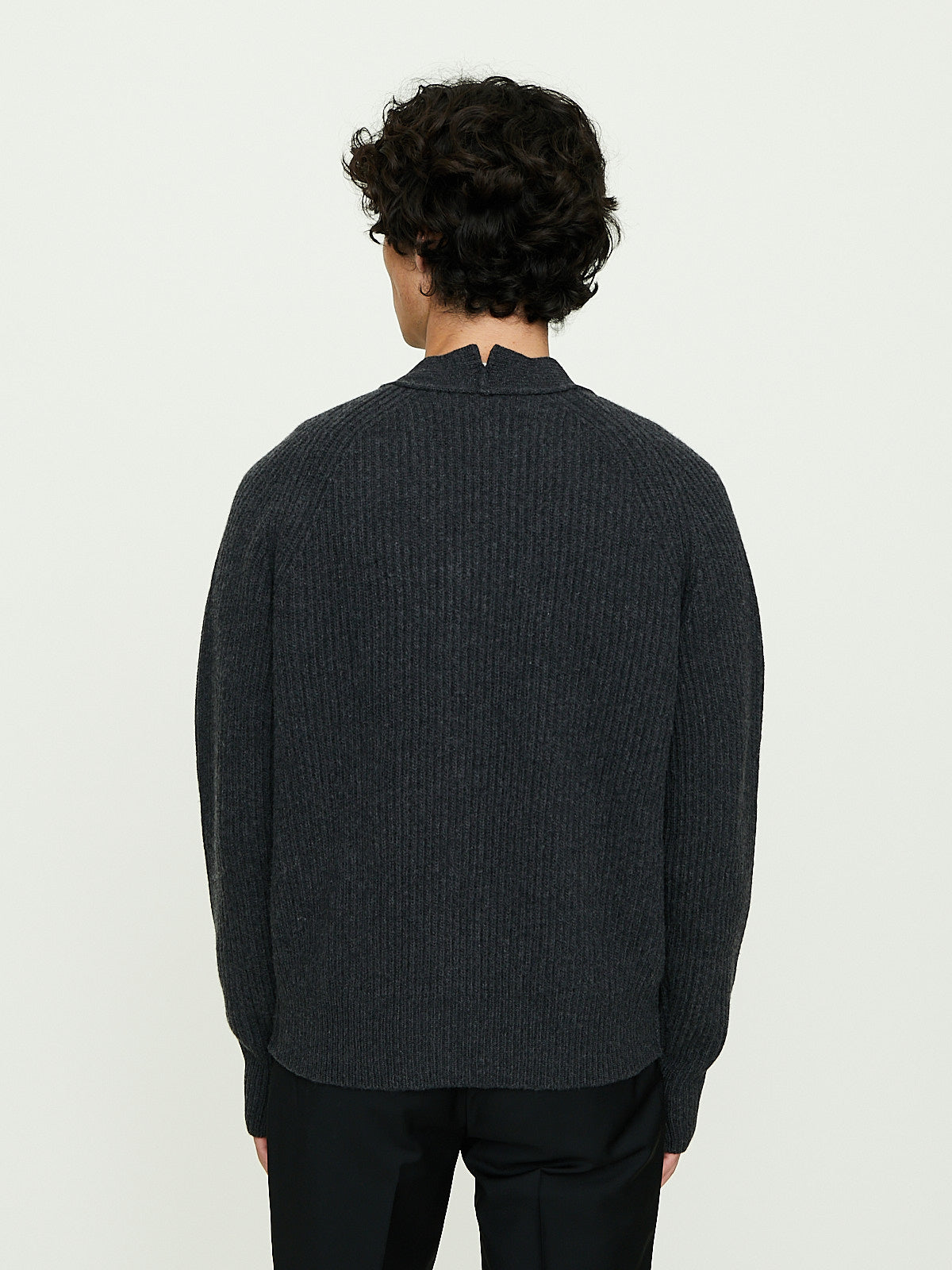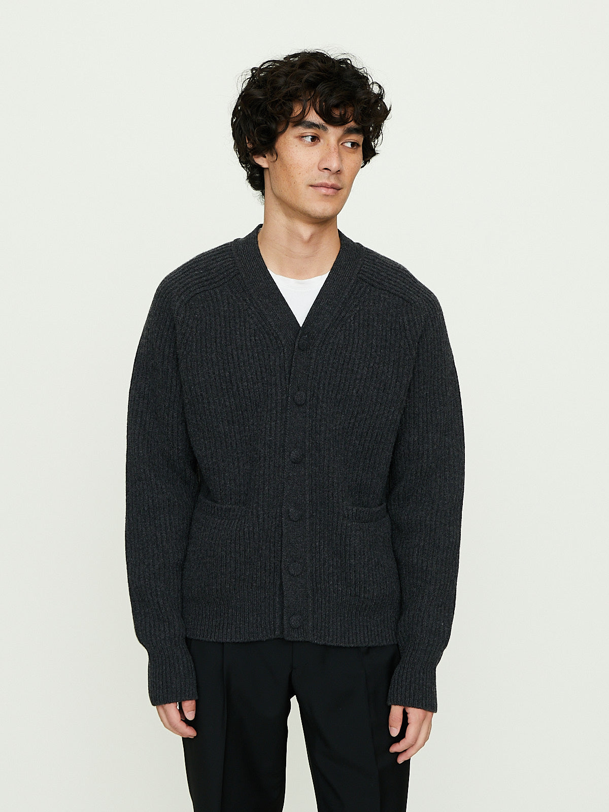 Ribbed cardigan in dark grey wool. V-neck, front button fastening and long raglan sleeves. Welted slip pockets on the front. Relaxed fit.