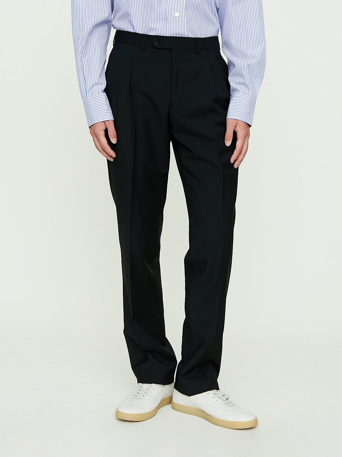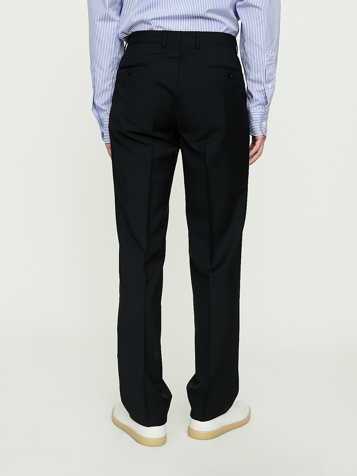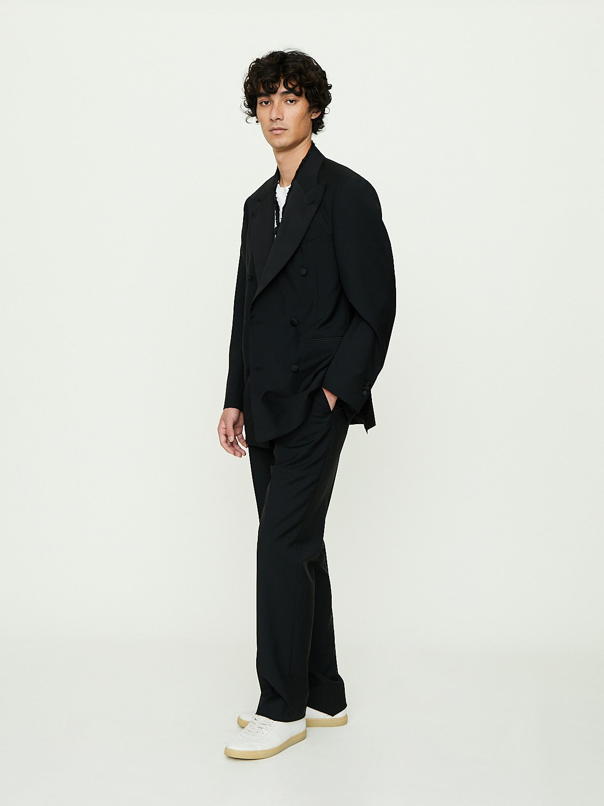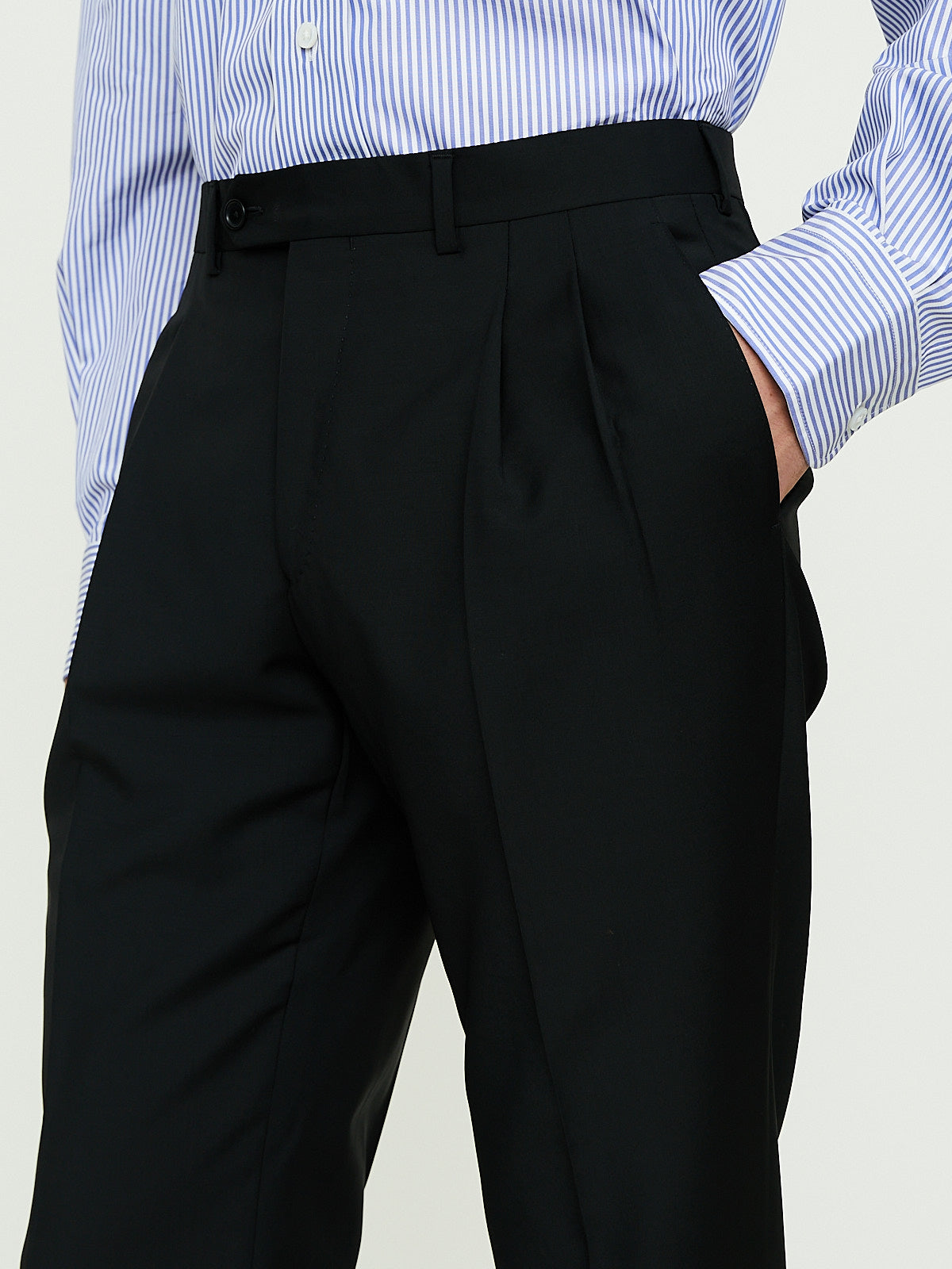Tuxedo trouser in black wool flannel by William Halstead Barathea. Off-centre button, hook and eye waist fastening and a zip fly. Side seam pockets and two jetted pockets with a button fastening on the back. Double-pleats on the front. Regular fit.