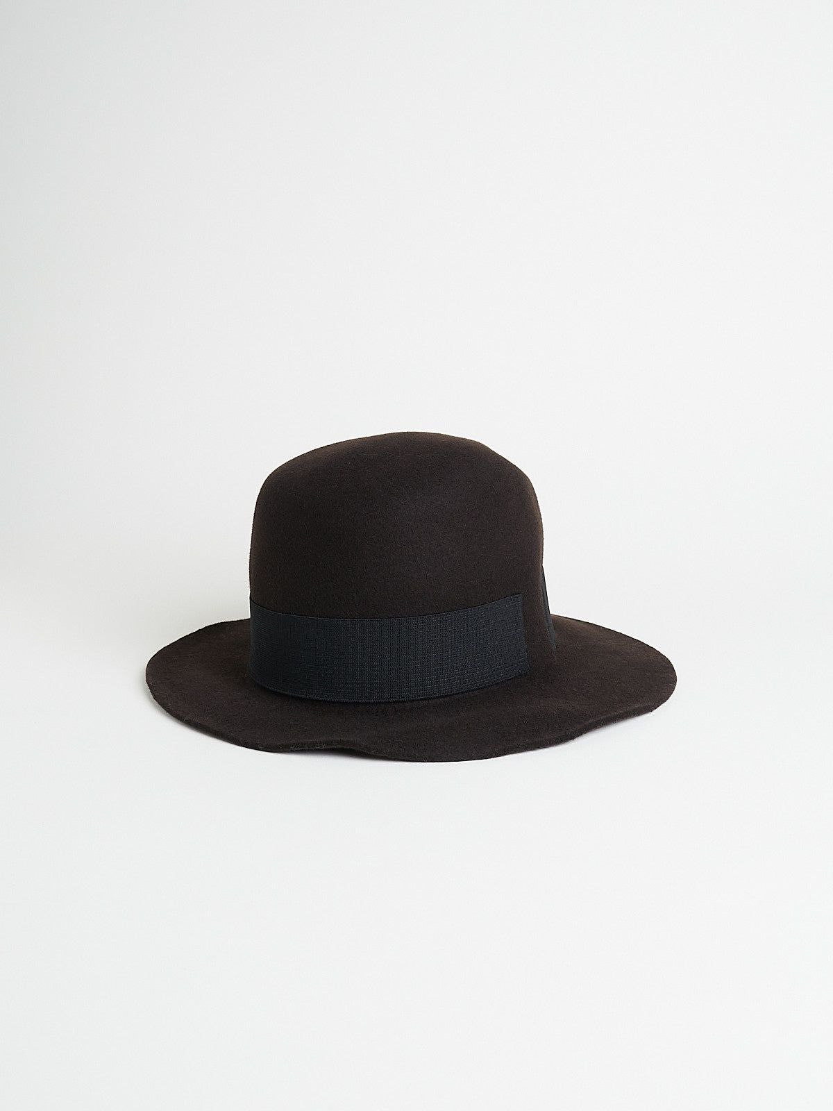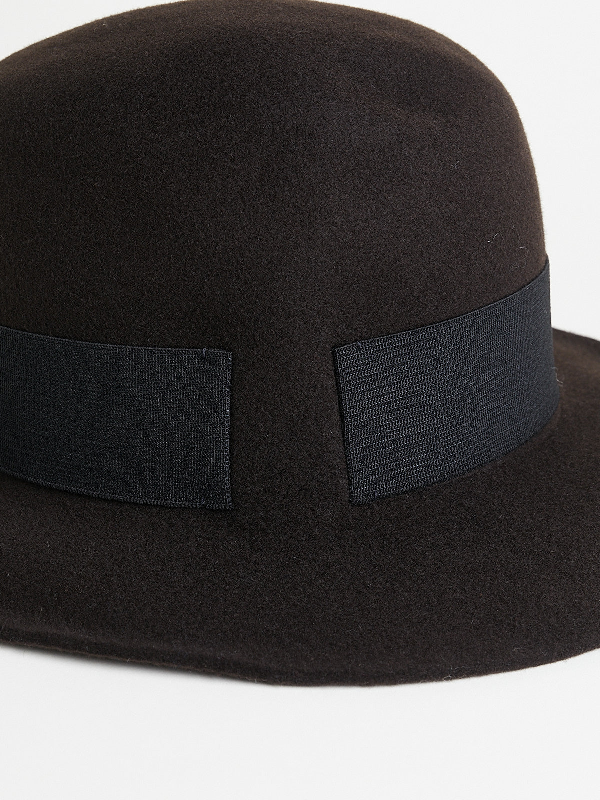 Traveller hat with in soft and plain brown new wool. Features a wide elastic band around the crown.