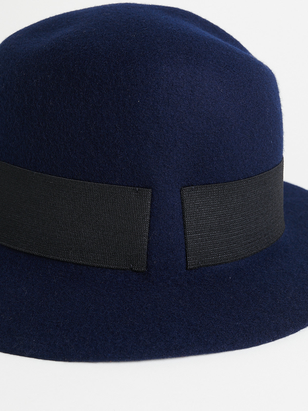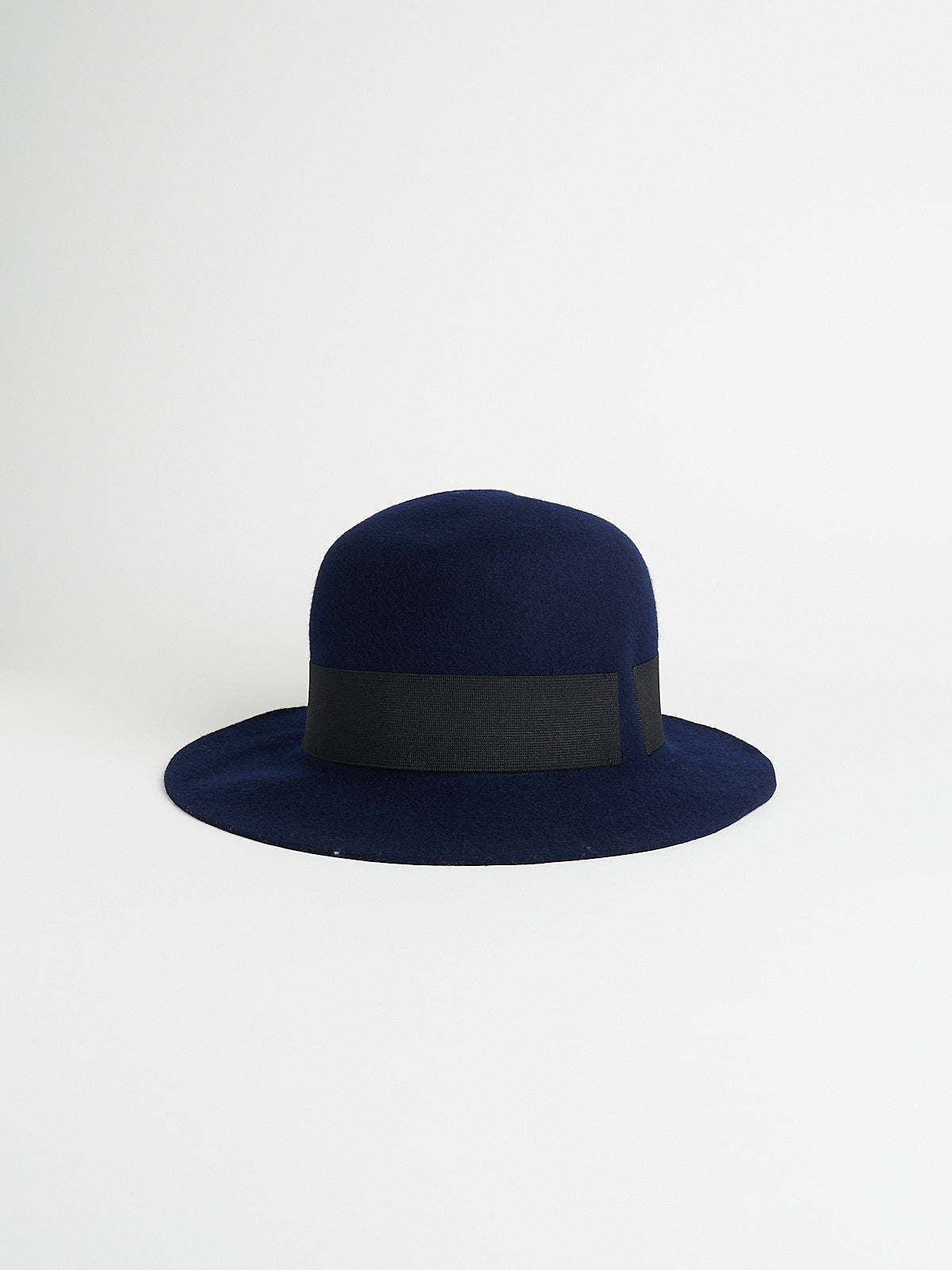 Traveller hat in soft and plain dark blue new wool. Features a black elastic band around the crown.
